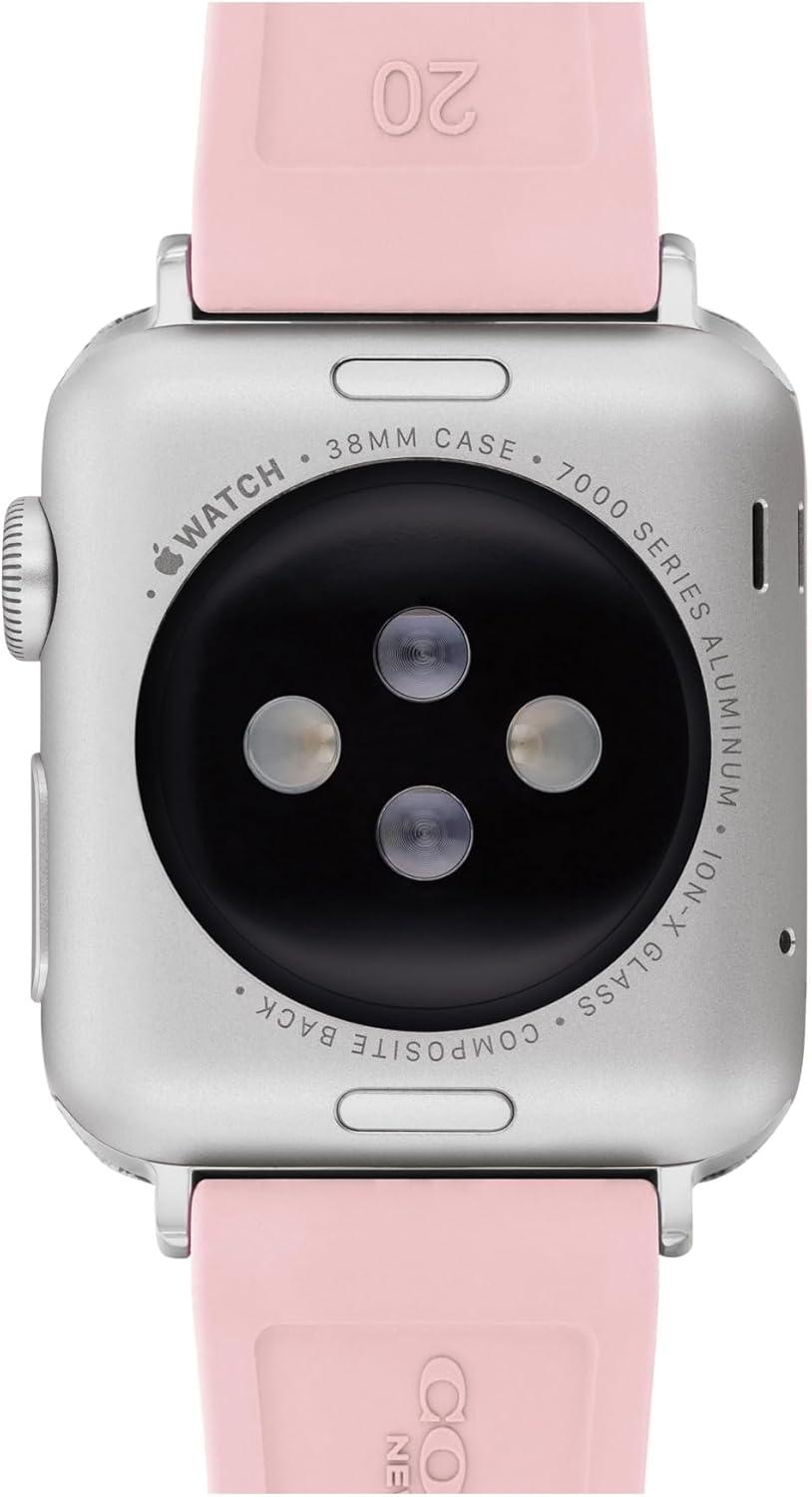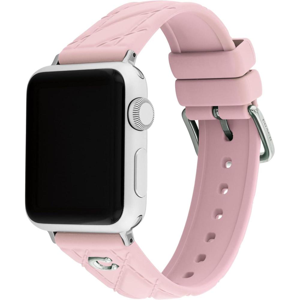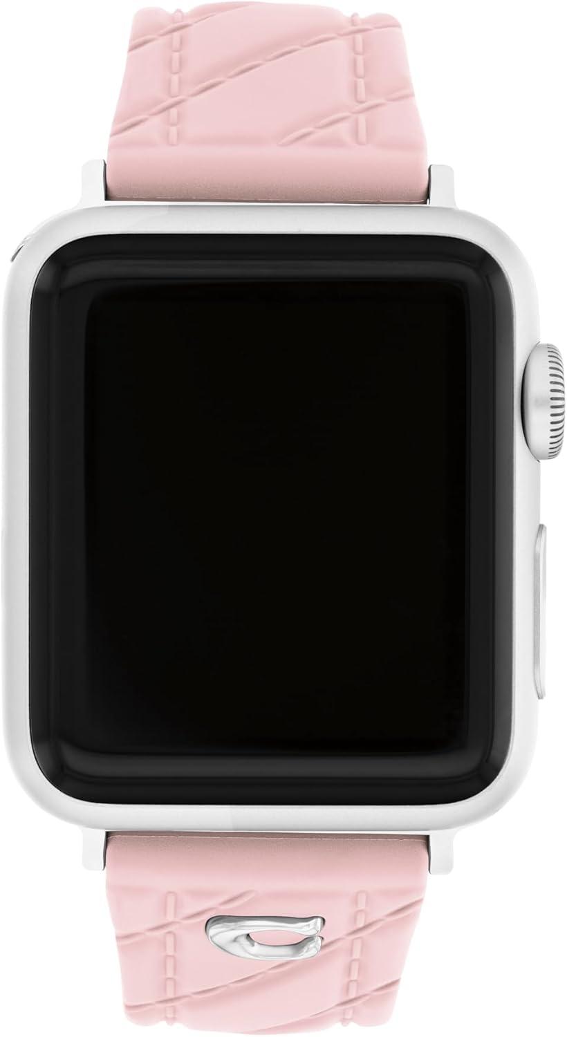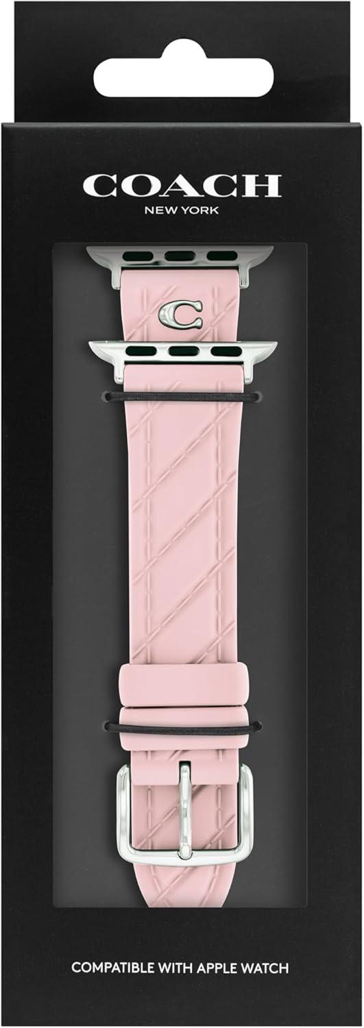 Made exclusively for use with the Series 9 and older 38/40/41mm and Series 10 42mm Apple Watch, this pale pink quilted silicone rubber strap is detailed with Coach Signature hardware for a heritage touch. It secures with stainless steel hardware.