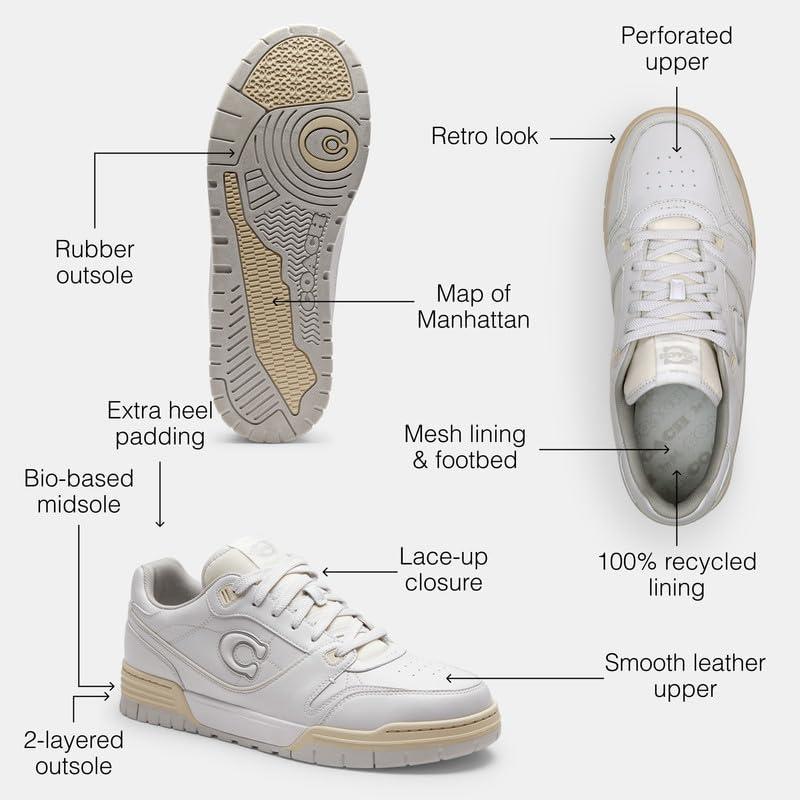 Our Coach SoHo Sneaker is inspired by the courageous free spirit of our hometown New York City and built to keep pace with life on the go. Crafted of smooth leather, it features a midsole that contains at least 28% bio-based content, created through a process that uses renewable sources in place of fossil-based. The comfortable style is finished with a grooved rubber outsole detailed with a map of Manhattan.