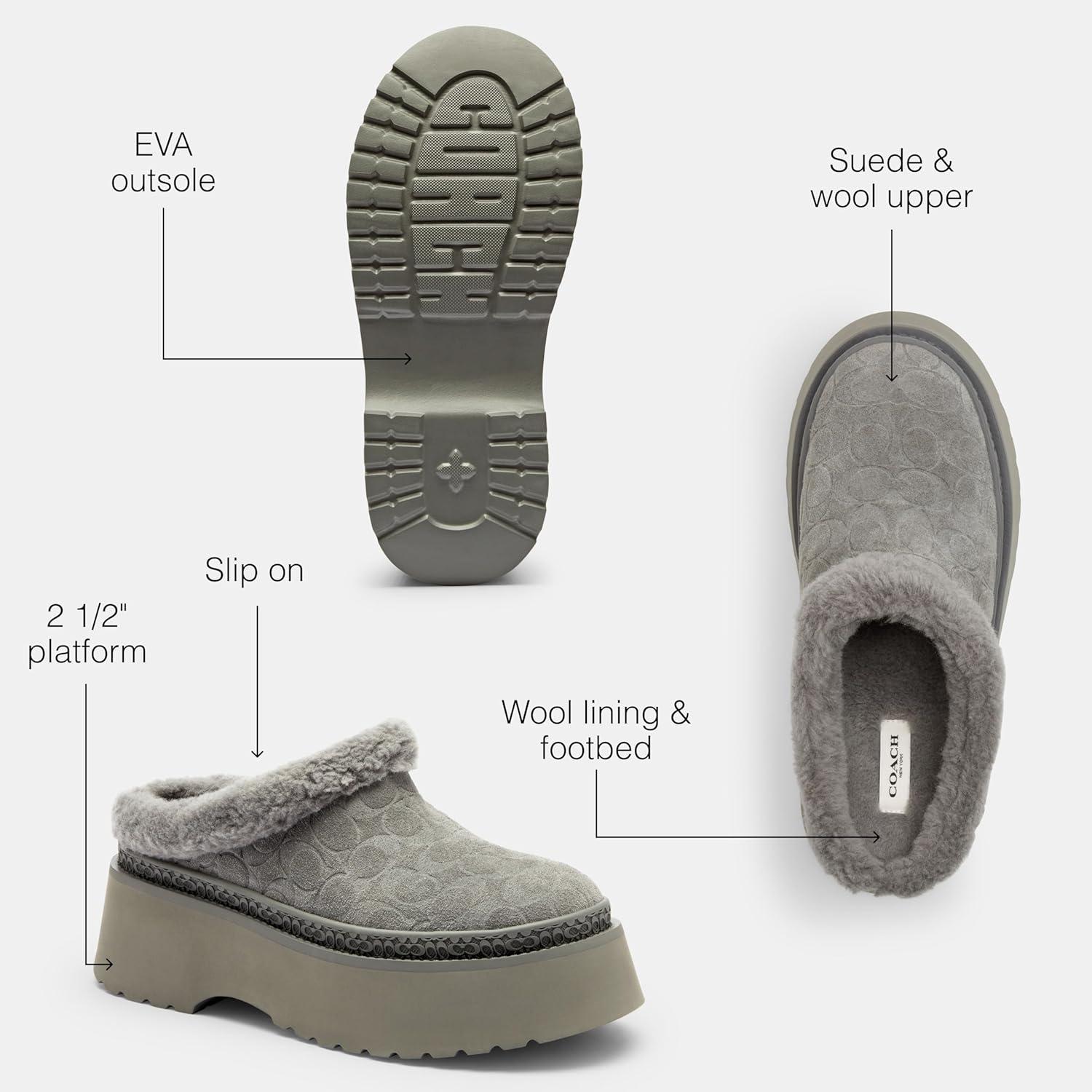 Editor's Notes: A cozy pick when temperatures drop, our Cecelia clog is an easy on-and-off style crafted of Signature suede with a warm wool lining and trim. 2.5″ platform height