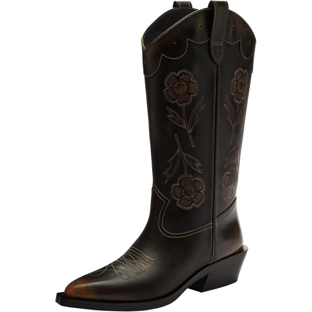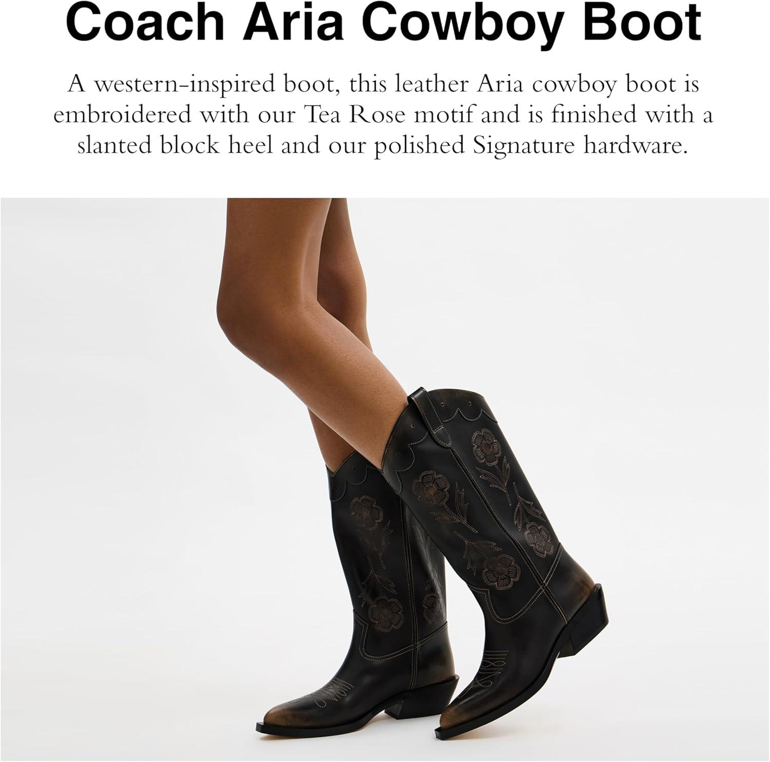 A western-inspired boot to kick up your days and nights, this leather Aria coyboy boot is embroidered with our Tea Rose motif and is finished with a slanted block heel and our polished Signature hardware for a heritage touch. Leather upper, man-made leather lining and footbed, rubber outsole, pull on, shaft: 10 1/2″ height, 15 1/4″ circumference, 1 1/2″ heel