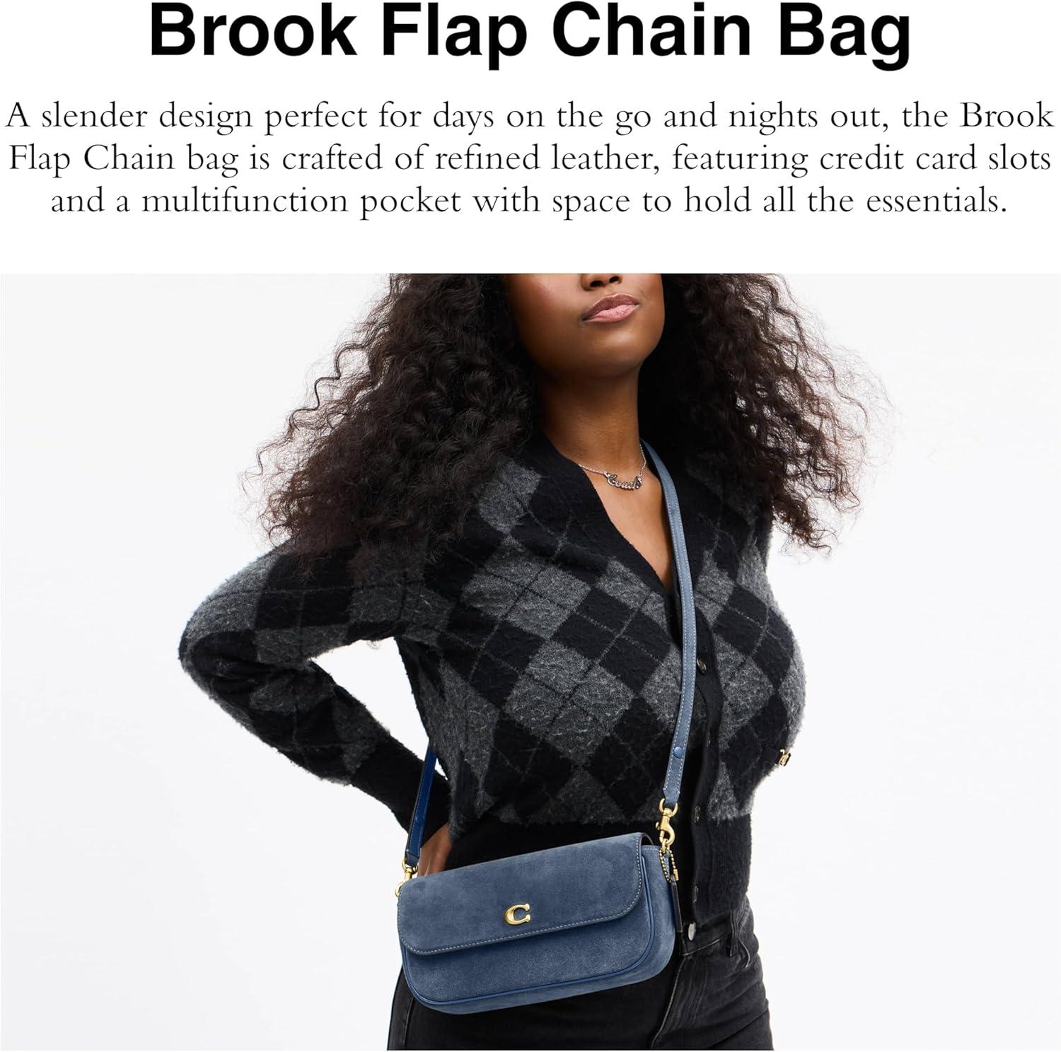 A versatile style for day and night, our flap-front Brook bag has a short gleaming chain strap with 8 3/4″ drop and a convertible leather strap with 9 1/2″ – 18 3/4″ drop to wear as a crossbody bag or doubled up for a shorter, dressier shoulder bag look. 9 3/4″ (L) x 4 3/4″ (H) x 1 3/4″ (W) Two credit card slots