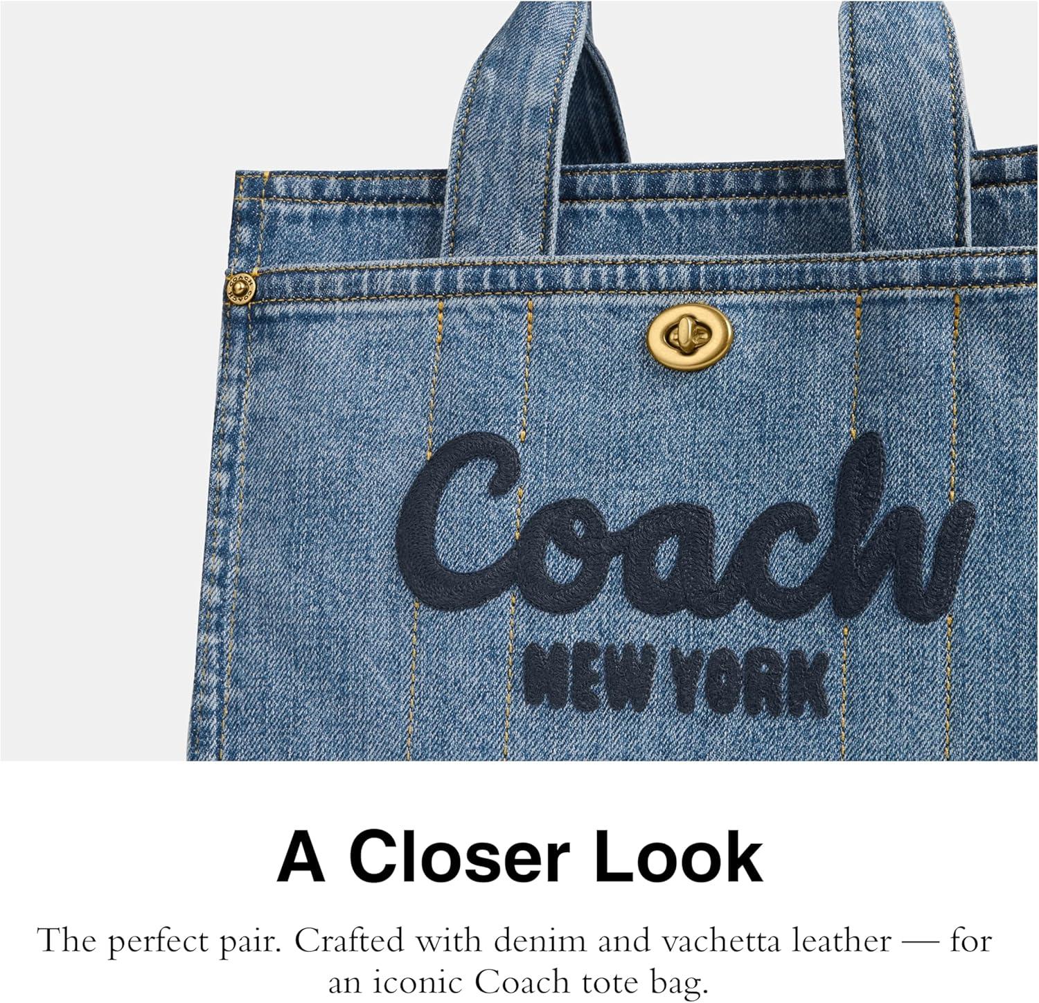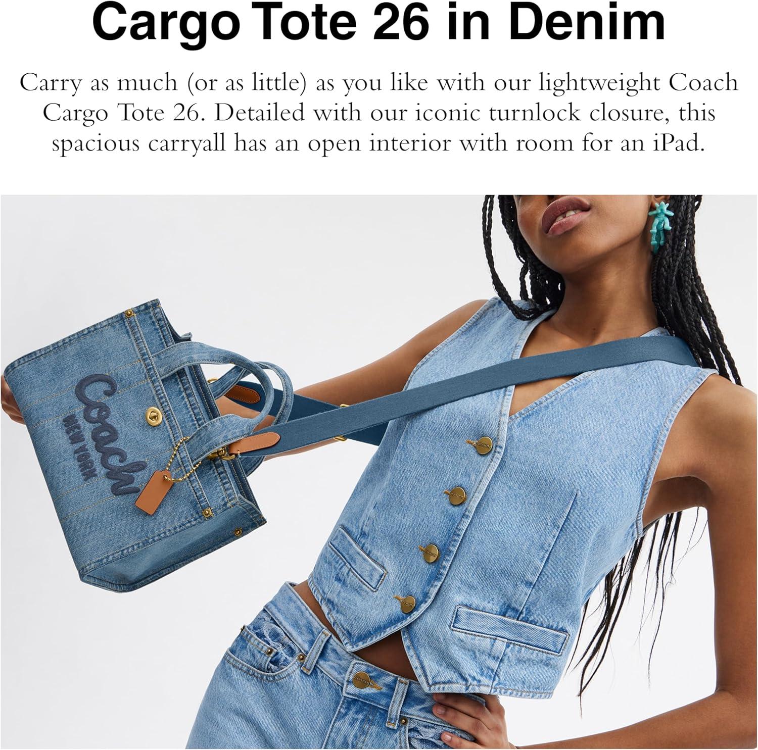 Carry as much (or as little) as you like with our lightweight Cargo tote. Detailed with our cursive Coach script embroidery and iconic turnlock closure, this spacious, carryall shoulder bag features our Signature print and is crafted of dyed denim. Denim, zip-top closure, fabric lining, handles with 4″ drop, outside turnlock and snap pockets, detachable strap with 24″ drop for shoulder or crossbody wear, fits an iPad, 10 1/4″ (L) x 7 3/4″ (H) x 5″ (W)