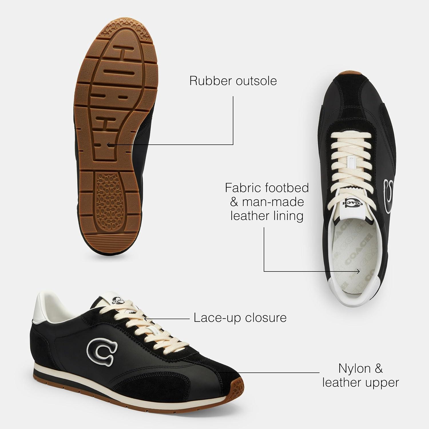 A streamlined on-the-go sneaker, this casual, stylish nylon and leather design from Coach features tonal stitching and laces and is accented with our perforated Signature. Nylon and leather upper, fabric and man-made leather lining, fabric footbed, rubber outsole, lace-up closure