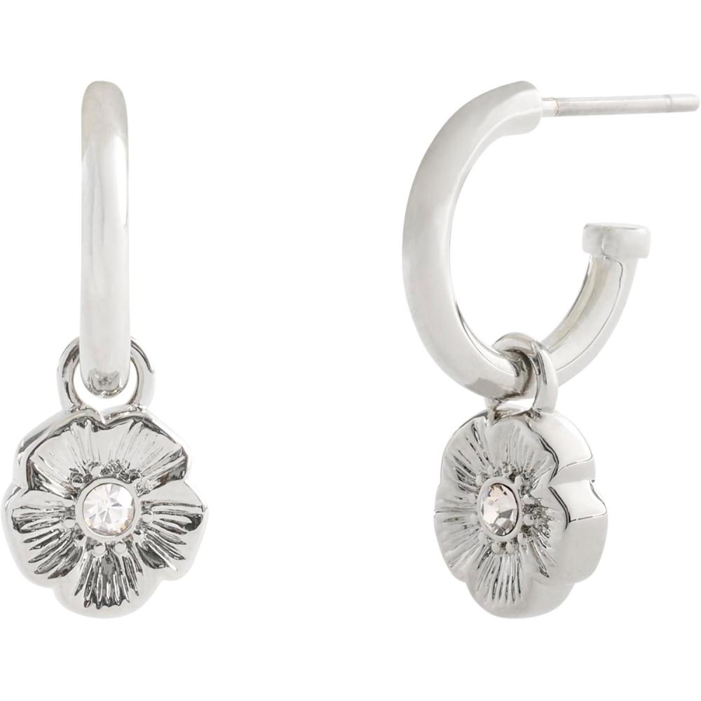 Minimal huggie hoop earrings paired with dangling signature tea rose motif charm. Posts are made from hypoallergenic titanium perfect for everyday. Earrings have a post back closure. Made from brass, glass crystal and titanium. Includes signature COACH jewelry dustbag.