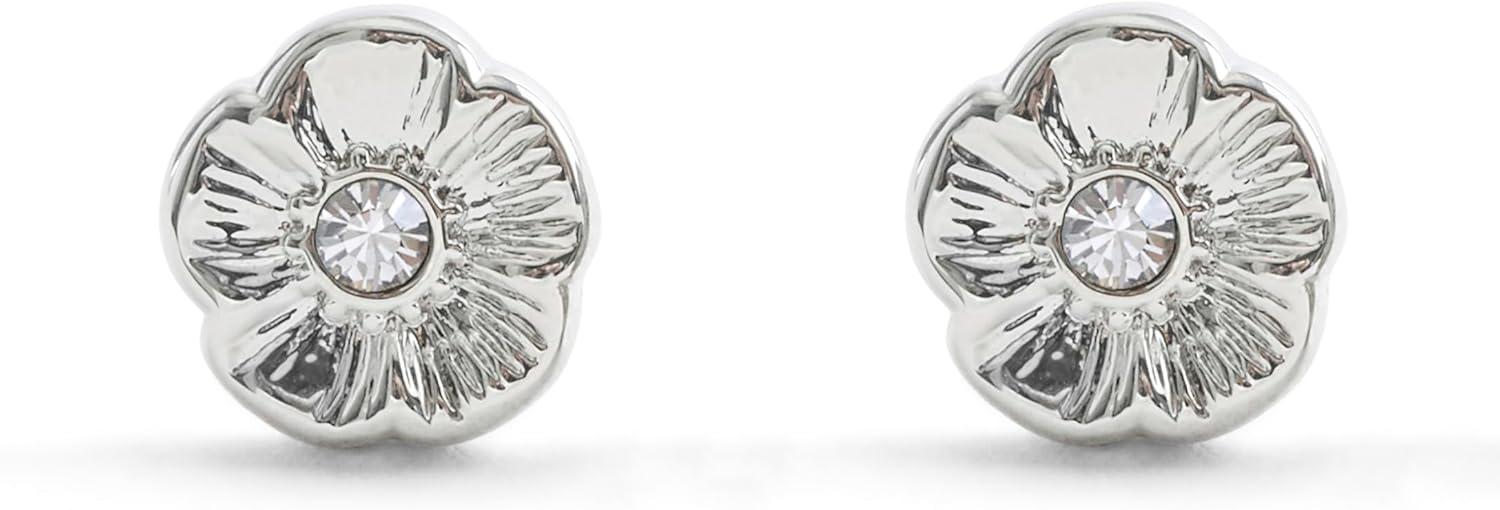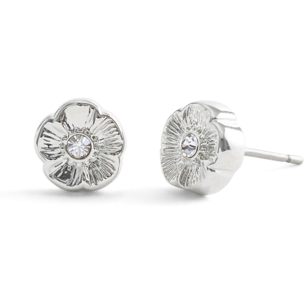 Sophisticated stud earrings featuring signature tea rose motif adorned with minimal crystal stone. Posts are made from hypoallergenic titanium perfect for everyday. Earrings have a post back closure. Made from brass, glass crystal and titanium. Includes signature COACH jewelry dustbag.