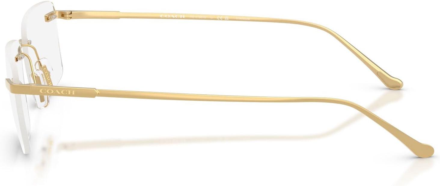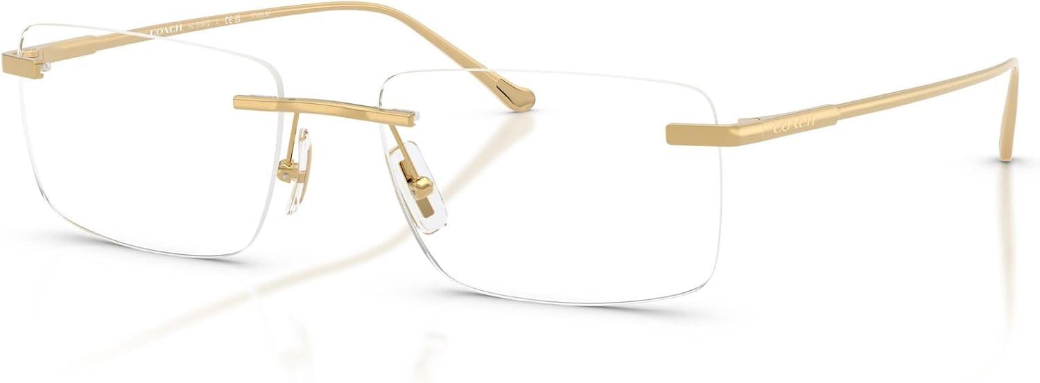The Coach HC5196TD eyeglass frames feature a sleek rectangular silhouette from Coach's modern men's collection. This sophisticated design showcases advanced titanium executions with a new temple concept and 3-piece mount rimless construction for a distinctive luxury aesthetic. Available in premium metal finishes including shiny silver, shiny gunmetal, and shiny gold. The rimless design ensures lightweight comfort, while gooseneck nose pads provide optimal fit and adjustability. Perfect for transitioning from professional settings to casual occasions. These prescription-ready frames are designed to be fitted with your custom prescription lenses for clear vision. Each pair comes with a protective case and cleaning cloth to preserve your frames and maintain their pristine appearance. Coach eyeglass frames sold by authorized sellers, like Amazon.com, are eligible for all manufacturer warranties and guarantees. Click on the Coach link above the product title to shop the entire Coach sunglass and eyeglass assortment.