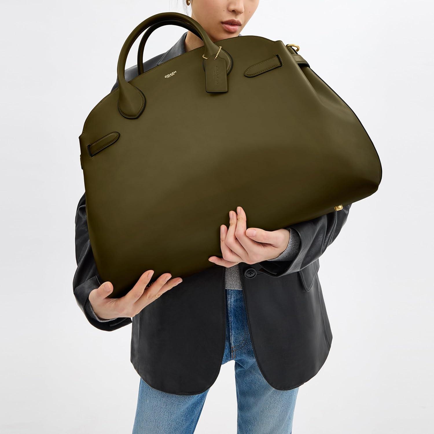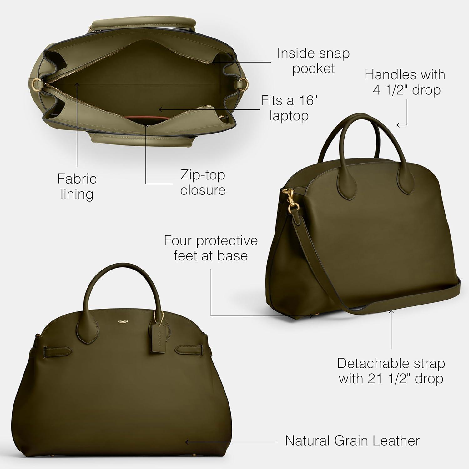 Crafted of natural grain leather with beautiful texture and soft feel, the sizeable 48 is great for everyday or overnight featuring a roomy open compartment with space for 16” laptop and a zip pocket to hold essentials. Inside snap pocket, zip-top closure, fabric lining, handles with 4 1/2″ drop, detachable strap with 21 1/2″ drop for shoulder or crossbody wear, four protective feet at base, fits a 16″ laptop, 18 3/4″ (L) x 13 3/4″ (H) x 7″ (W)