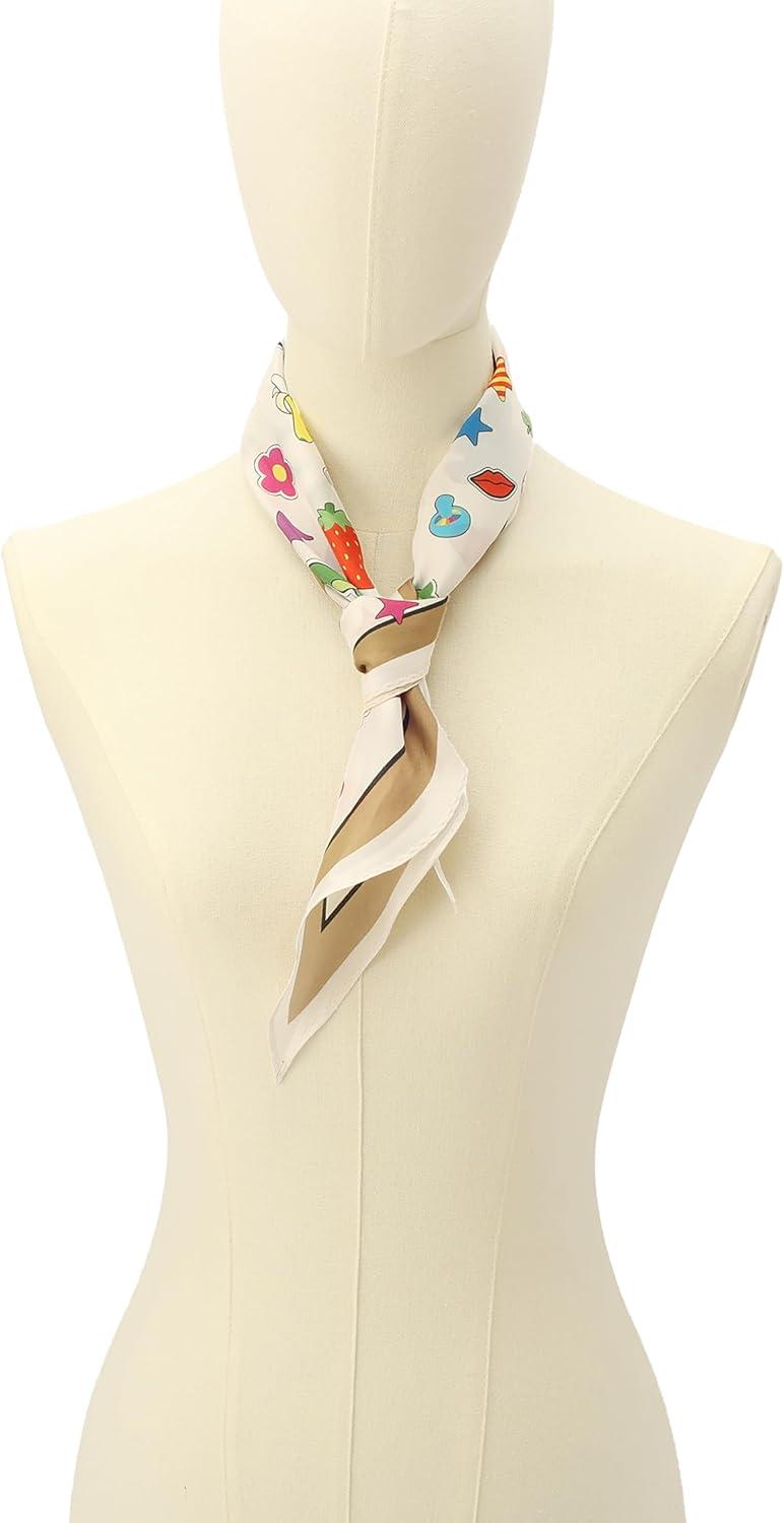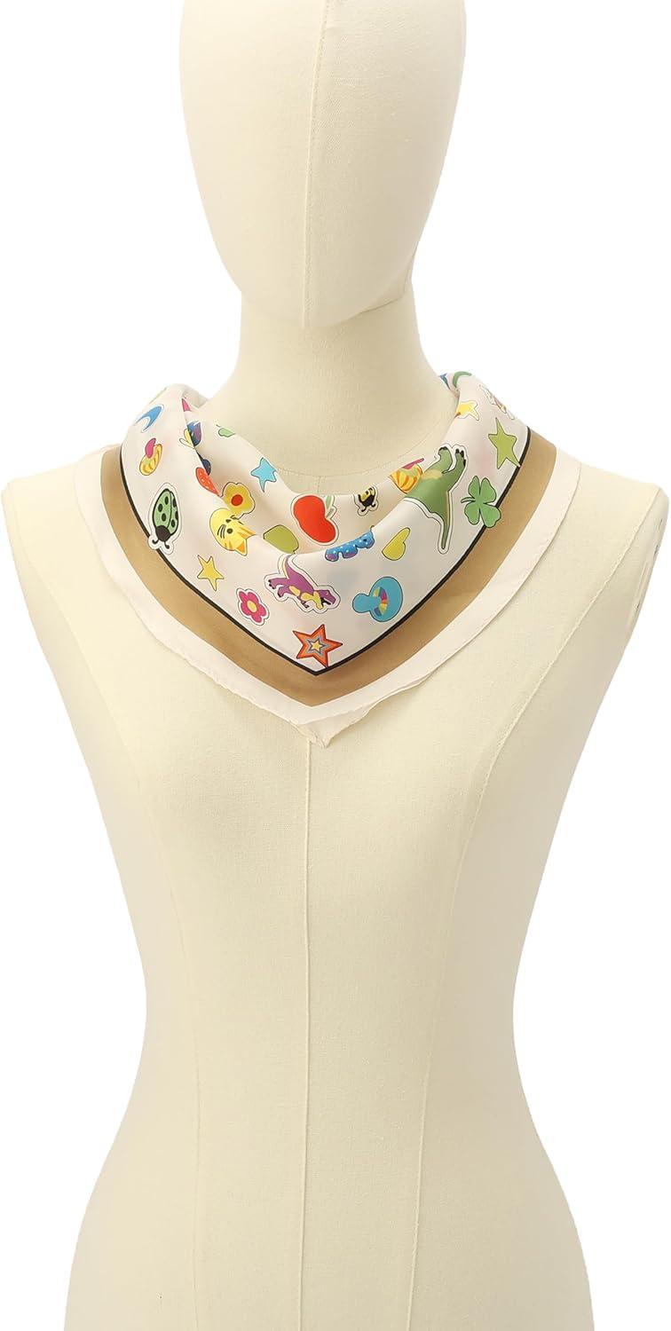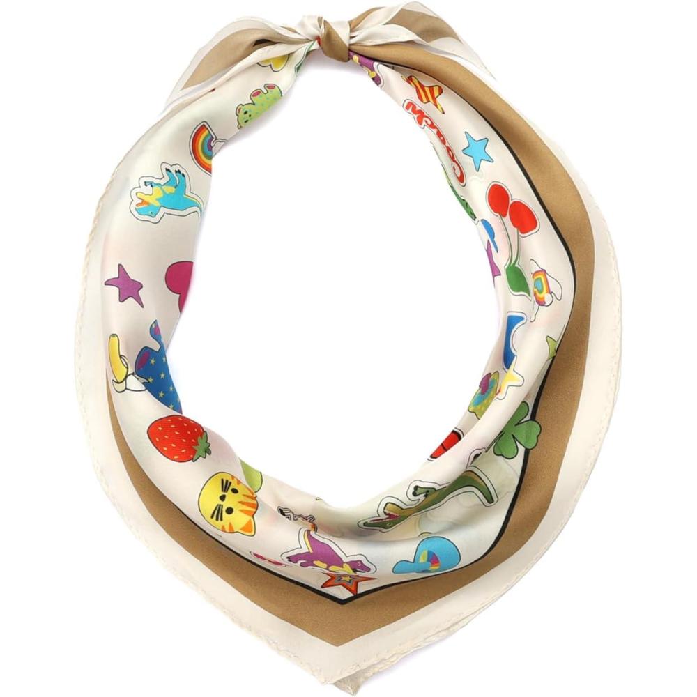 This silk diamond scarf features our fun and trendy stickers print with a solid border. Knot it around your neck for a pop of pattern.