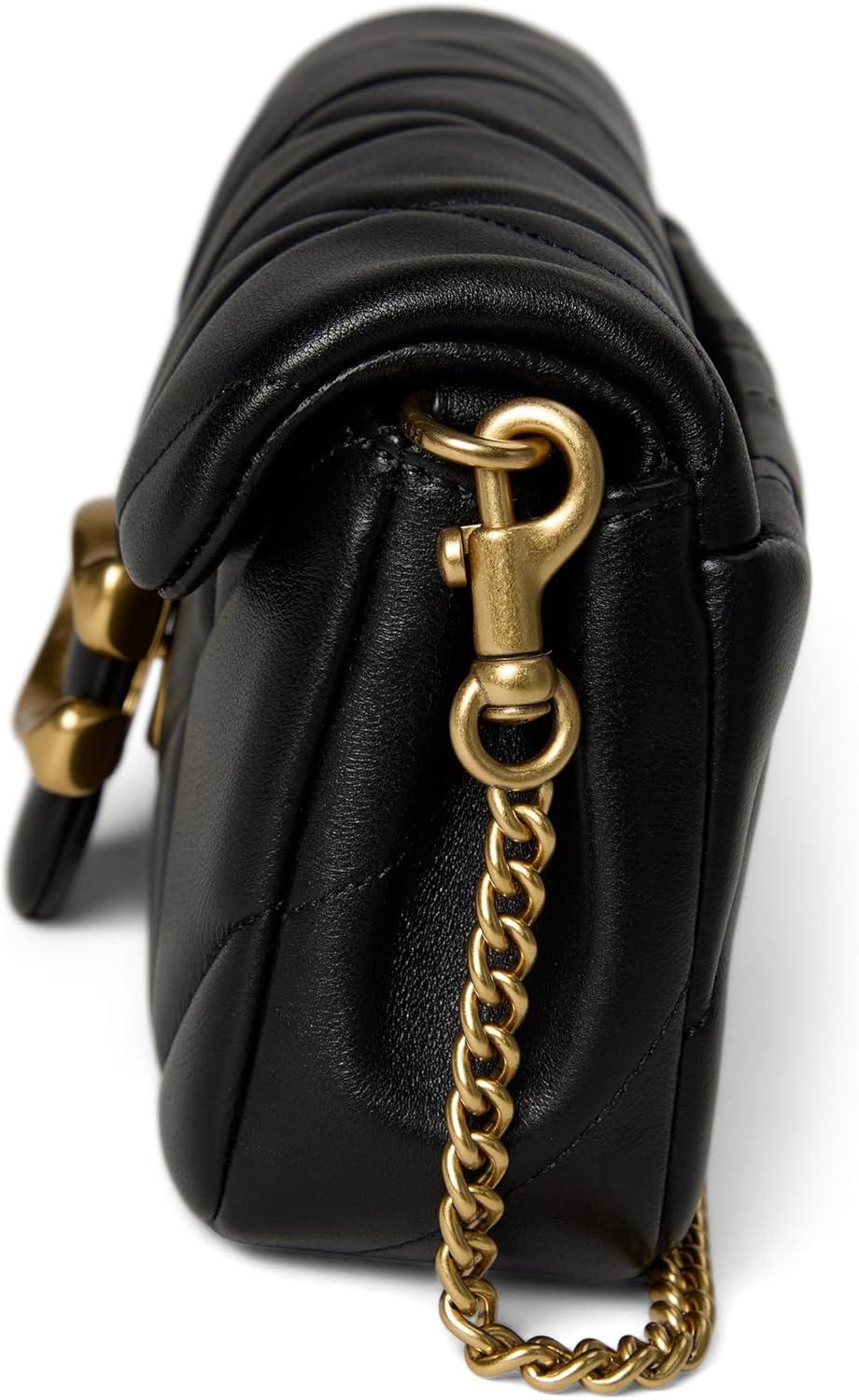 A modern take on an archival 1970s Coach design, our Tabby Chain Crossbody is crafted of quilted plush, ultra-soft nappa leather. The versatile style is perfectly sized for cards, cash and a phone with an exterior slip pocket for easy access to essentials. Features two credit card slots, inside multifunction pocket, snap closure, leather lining, outside open pocket, detachable wrist strap, detachable chain strap with 21 1/2″ drop for shoulder or crossbody wear, 7 1/4″ (L) x 4 1/4″ (H) x 1 3/4″ (W)