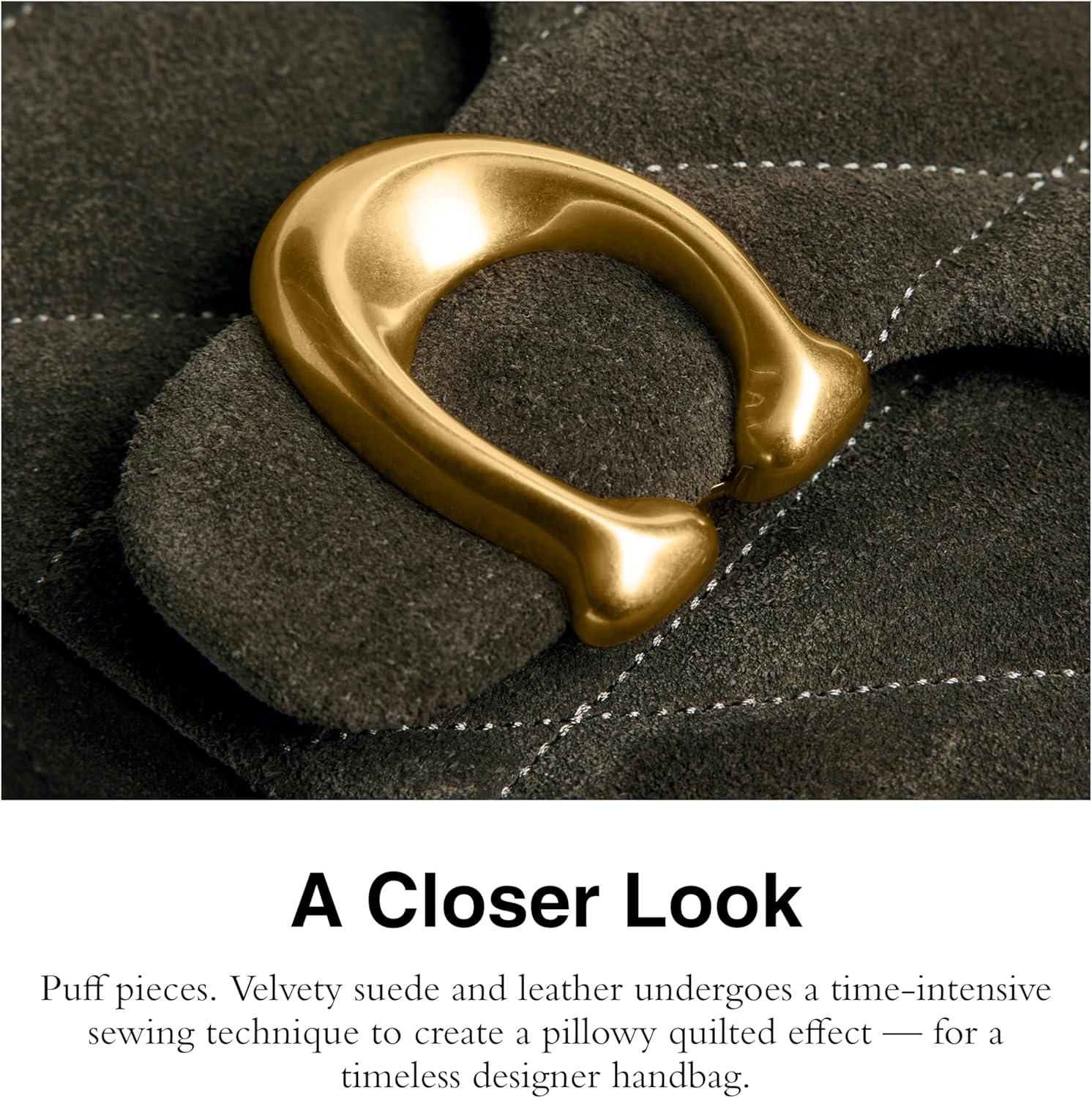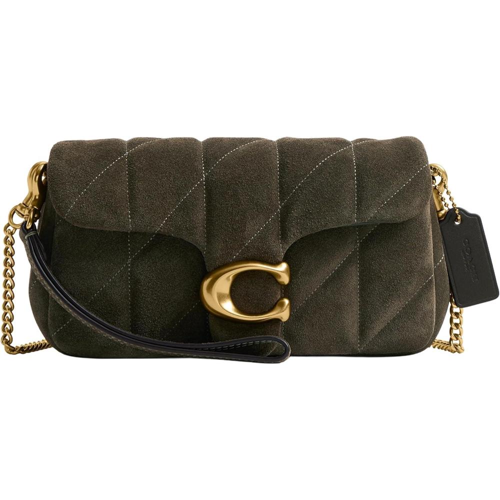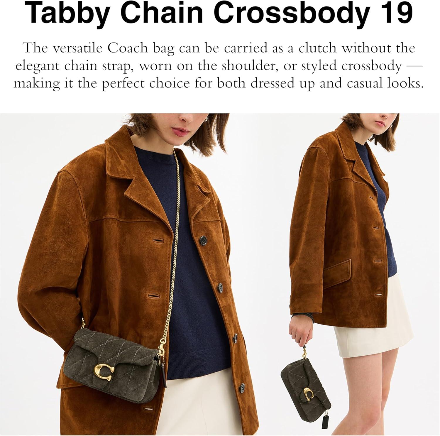 A modern take on an archival 1970s Coach design, our Tabby Chain Crossbody is crafted of quilted plush, ultra-soft nappa leather. The versatile style is perfectly sized for cards, cash and a phone with an exterior slip pocket for easy access to essentials. Features two credit card slots, inside multifunction pocket, snap closure, leather lining, outside open pocket, detachable wrist strap, detachable chain strap with 21 1/2″ drop for shoulder or crossbody wear, 7 1/4″ (L) x 4 1/4″ (H) x 1 3/4″ (W)