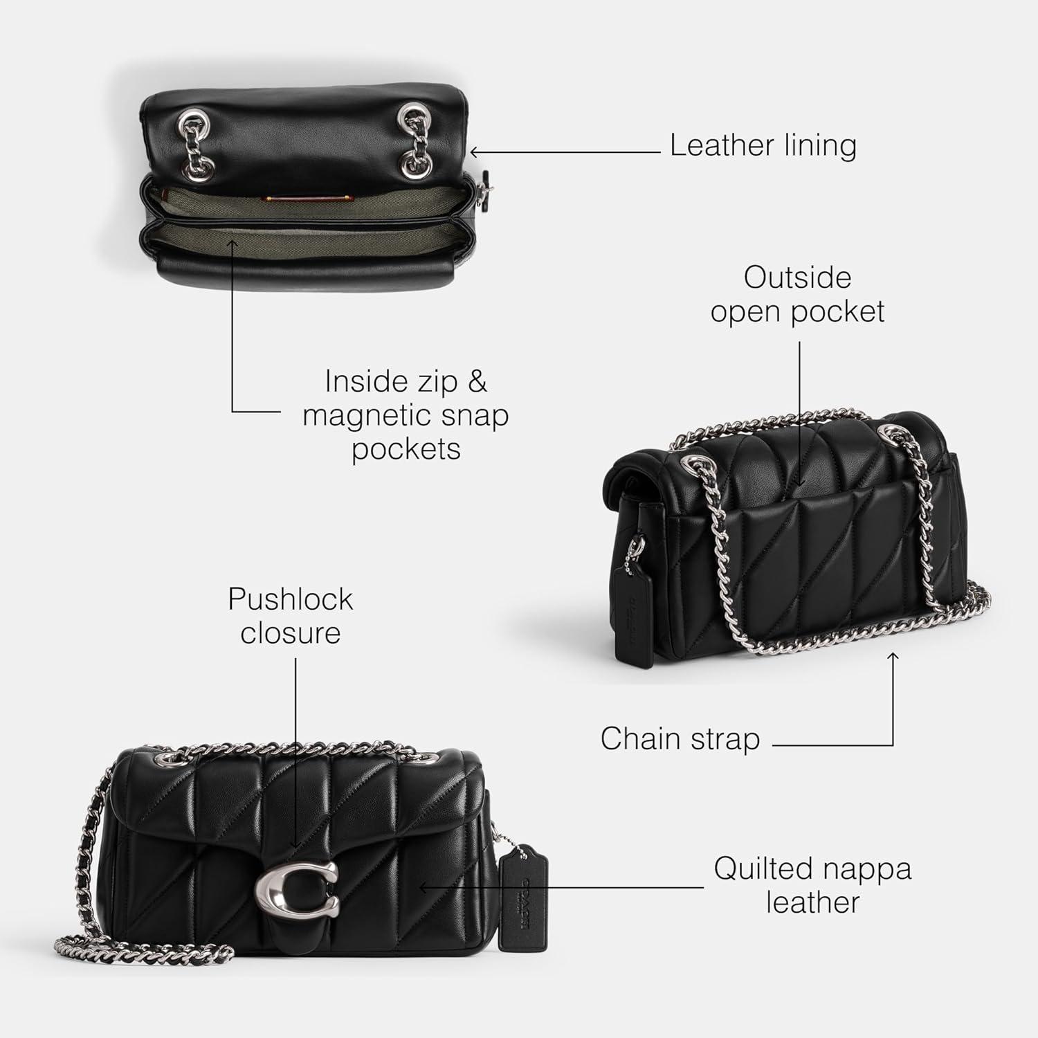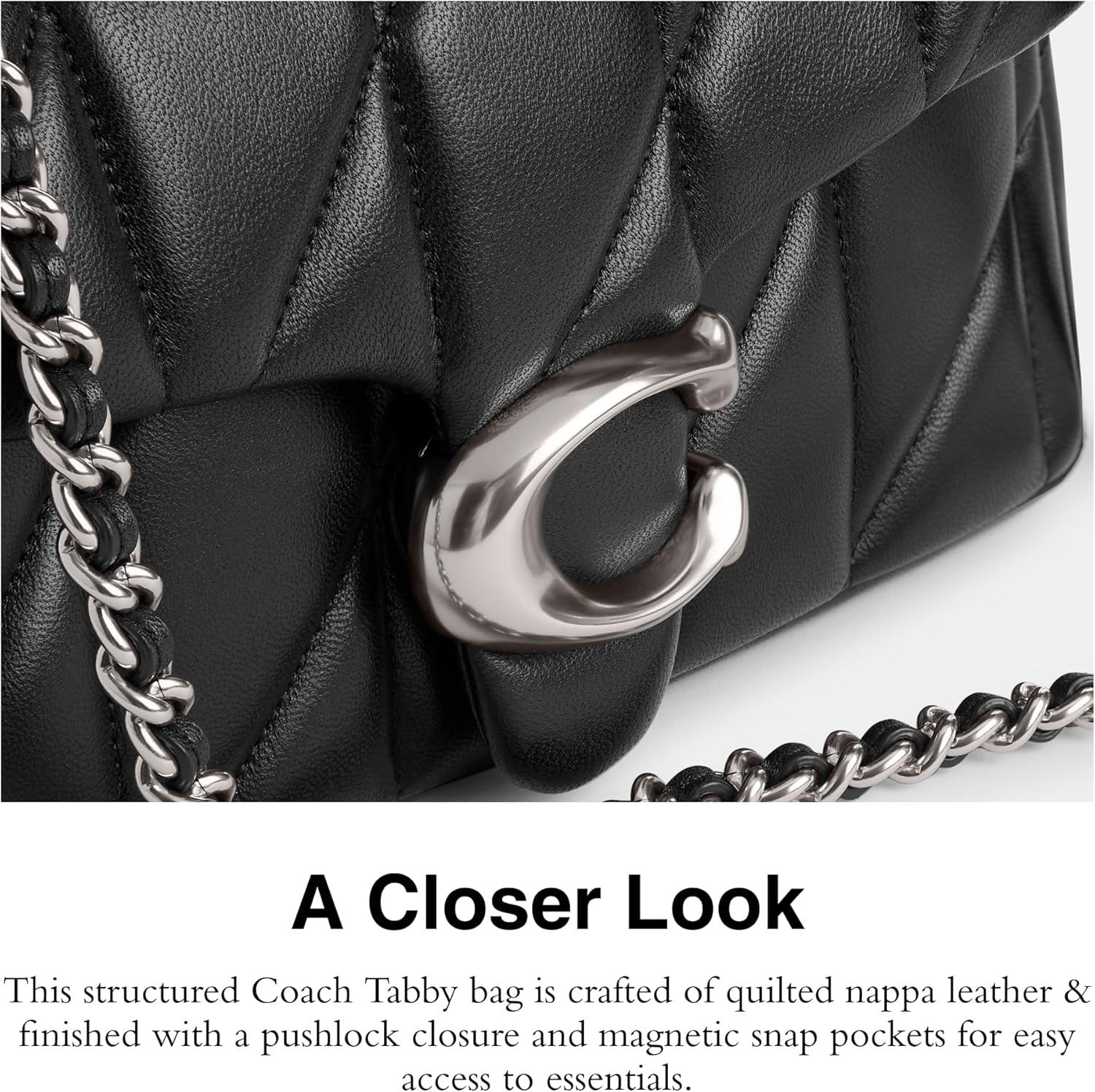 A modern take on an archival 1970s Coach design, this structured Coach Tabby bag is crafted of quilted nappa leather & finished with a pushlock closure and magnetic snap pockets for easy access to essentials. Puff pieces. Supple leather undergoes a time-intensive sewing technique to create a pillowy quilted effect – for a timeless designer handbag for women. Supple leather undergoes a time-intensive sewing technique to create a pillowy quilted effect – for a timeless designer handbag for women.