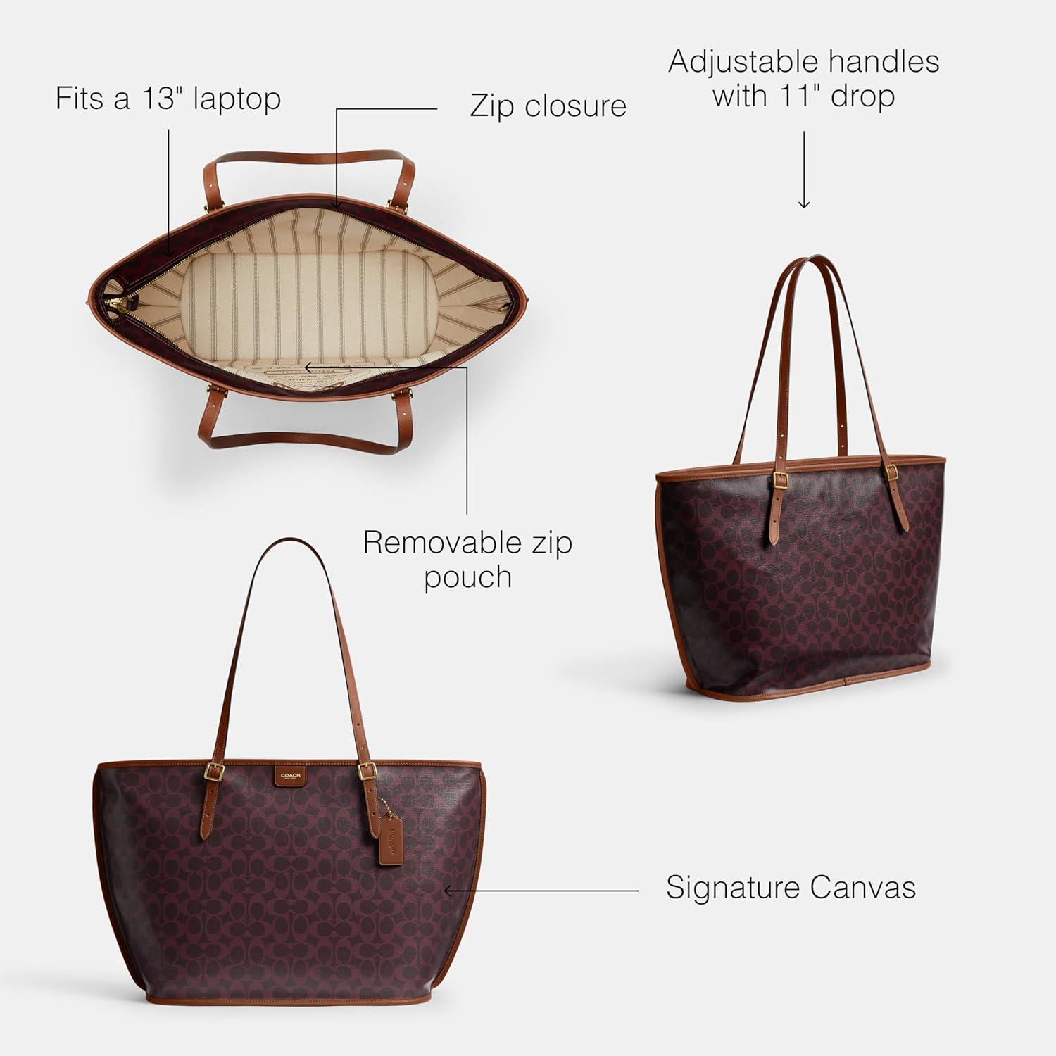 Simple yet elegant, our Taxi tote in Signature Canvas is spacious enough to hold everything you need. Crafted of durable vegetable-tanned leather, it has multifunction pockets, a center zip compartment, a removable zip pouch and adjustable handles with 11″ drop – fits a 13″ laptop. 14 1/4″ (L) x 12″ (H) x 6 1/2″ (W)