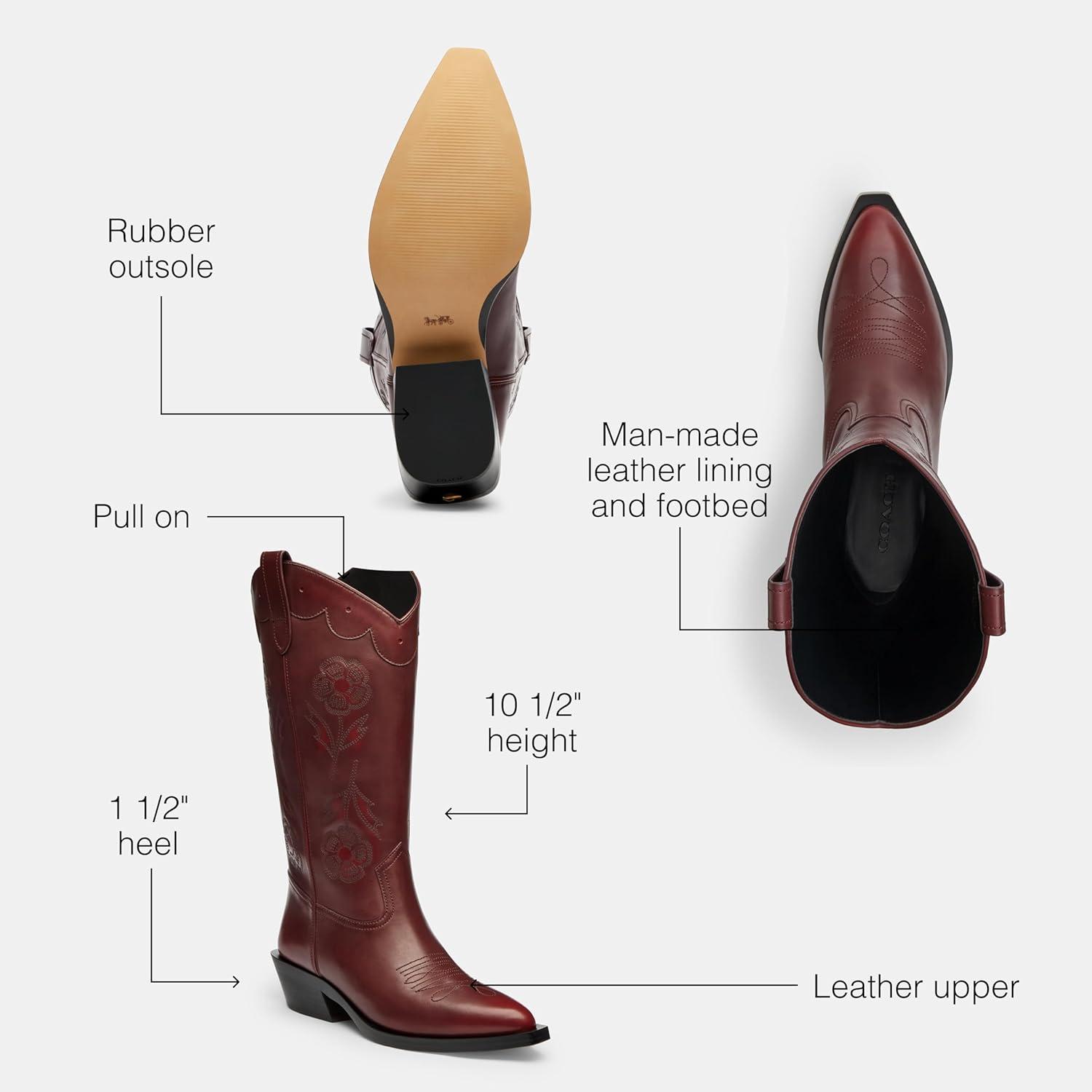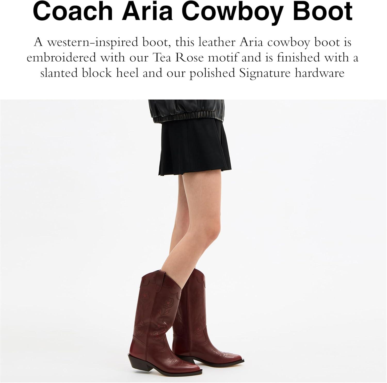 A western-inspired boot to kick up your days and nights, this leather Aria coyboy boot is embroidered with our Tea Rose motif and is finished with a slanted block heel and our polished Signature hardware for a heritage touch. Leather upper, man-made leather lining and footbed, rubber outsole, pull on, shaft: 10 1/2″ height, 15 1/4″ circumference, 1 1/2″ heel