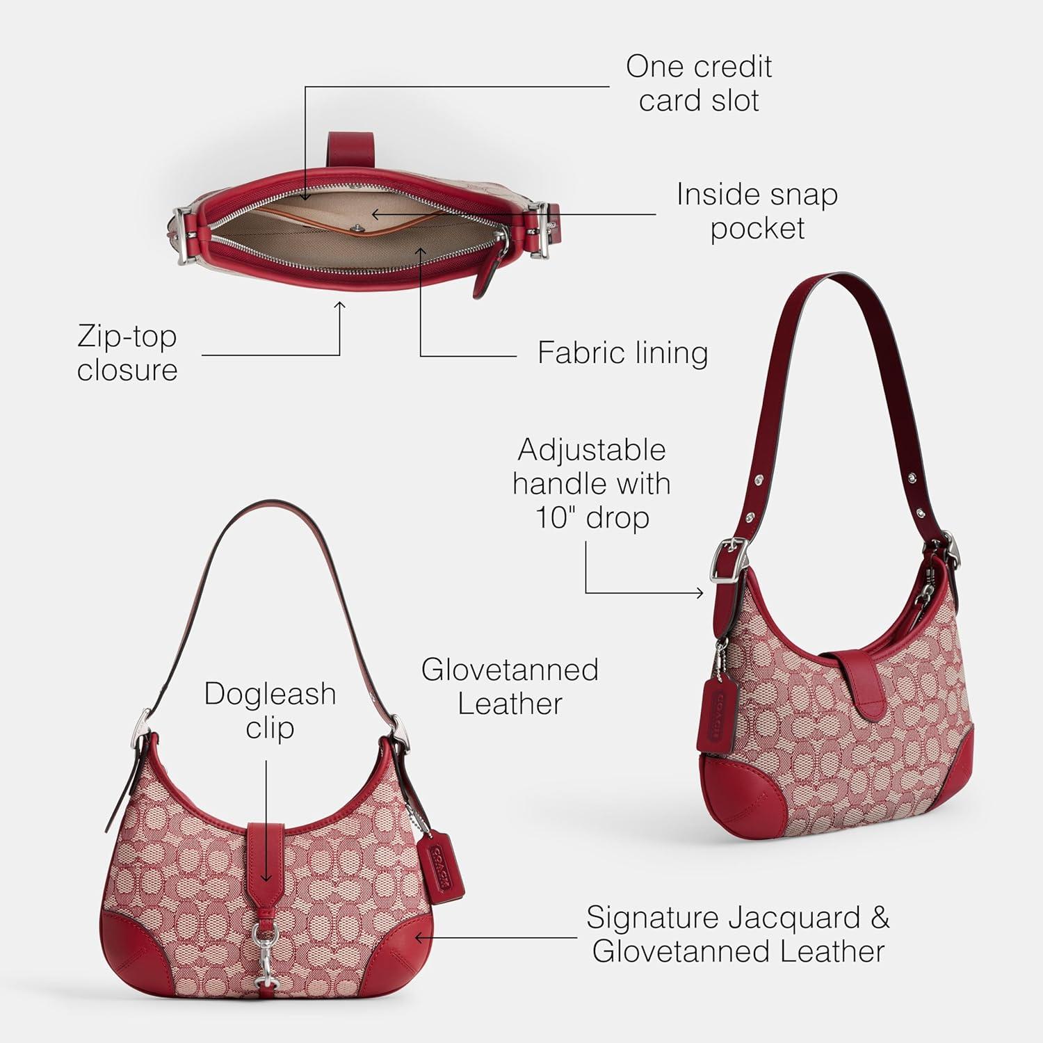 Signature textile jacquard and glovetanned leather One credit card slot Inside snap pocket Zip-top and dogleash clip closures, leather lining Adjustable handle with 10″ drop 10 1/2″ (L) x 8 1/2″ (H) x 2 1/2″ (W) The Coach Originals