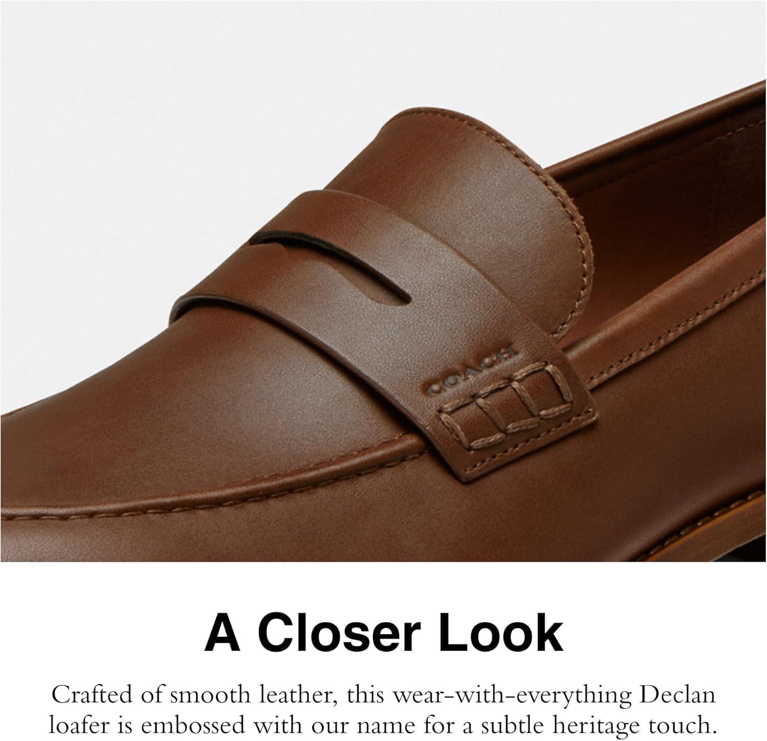 Crafted of smooth leather, this wear-with-everything Declan men's dress loafer is finished with our polished Coach hardware for a subtle heritage touch. These timeless leather loafers feature a traditional penny-keeper and a leather sole.