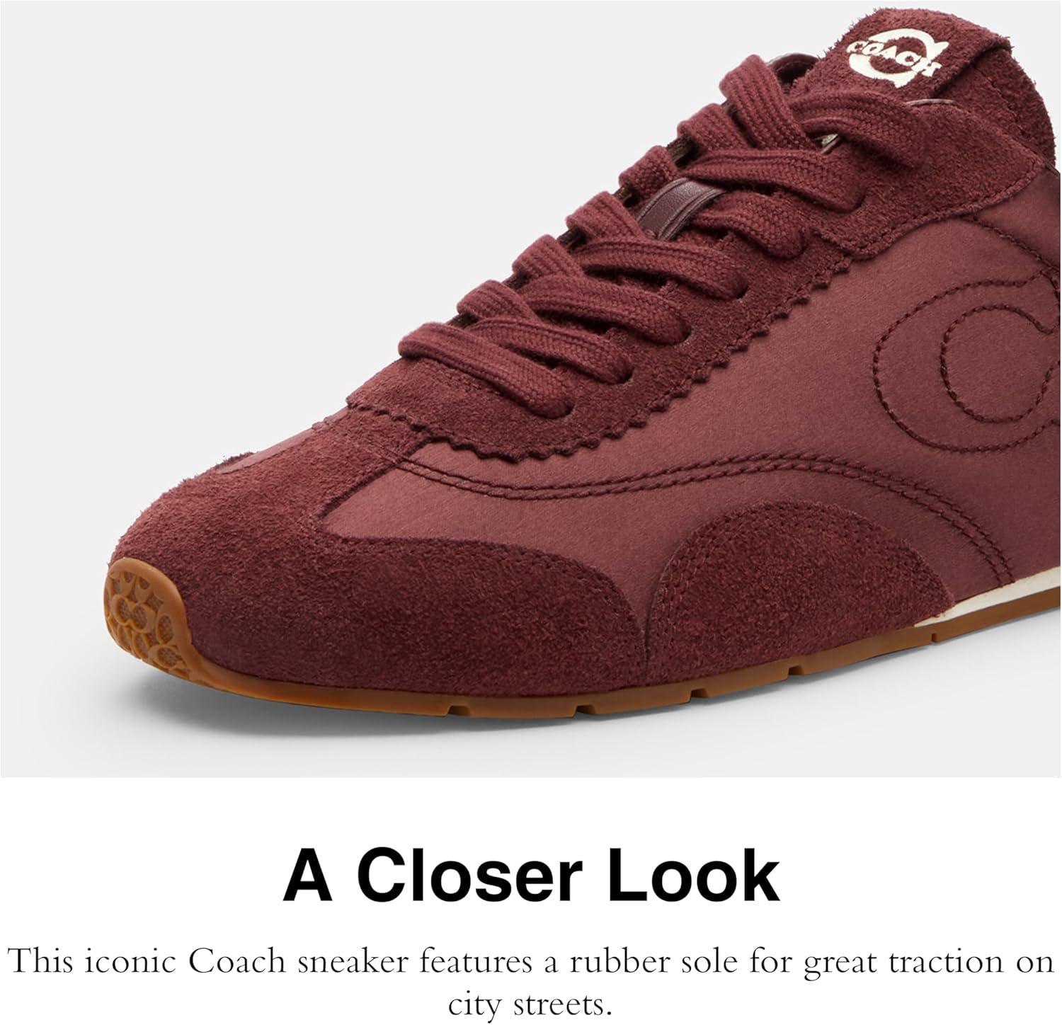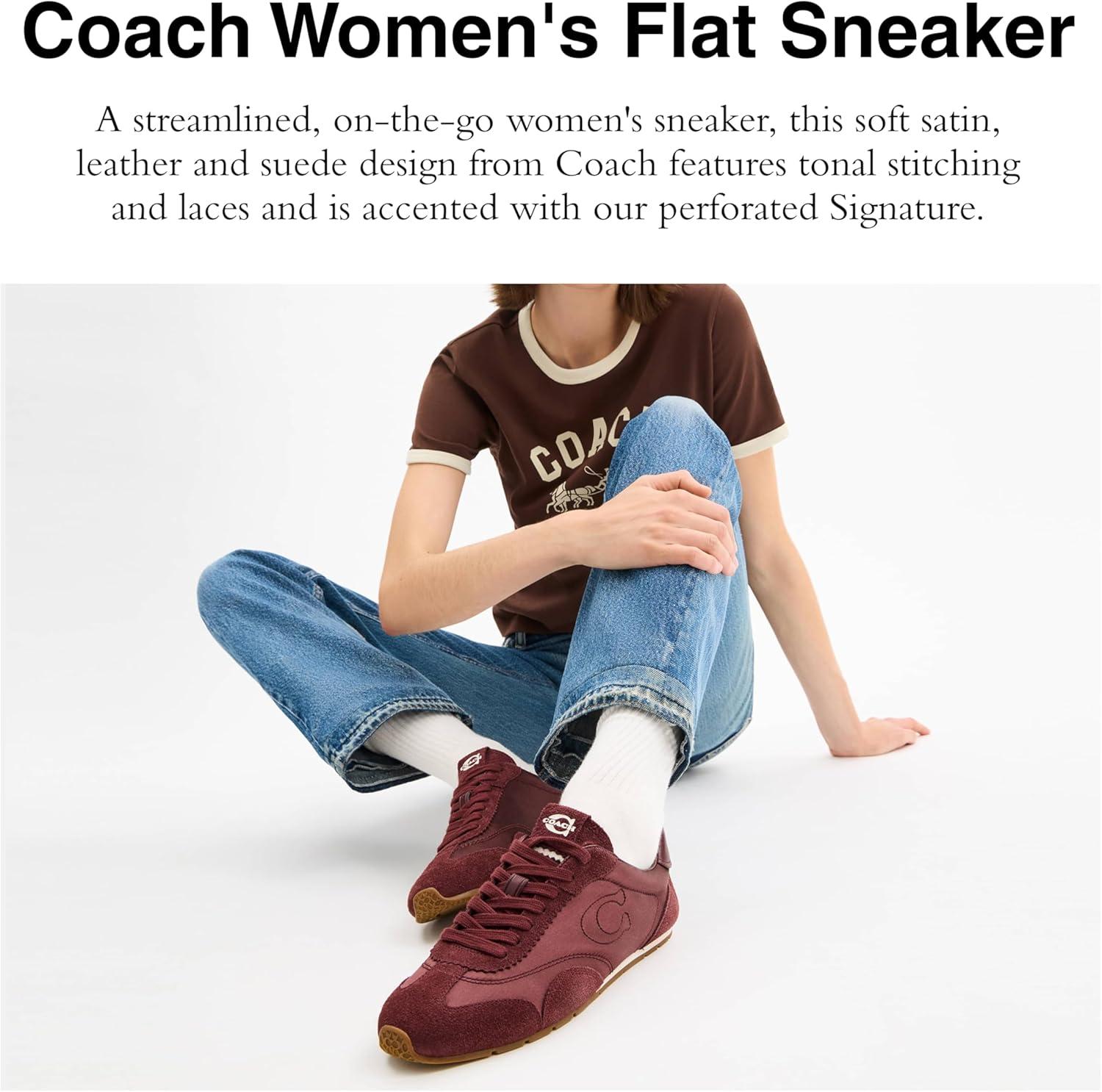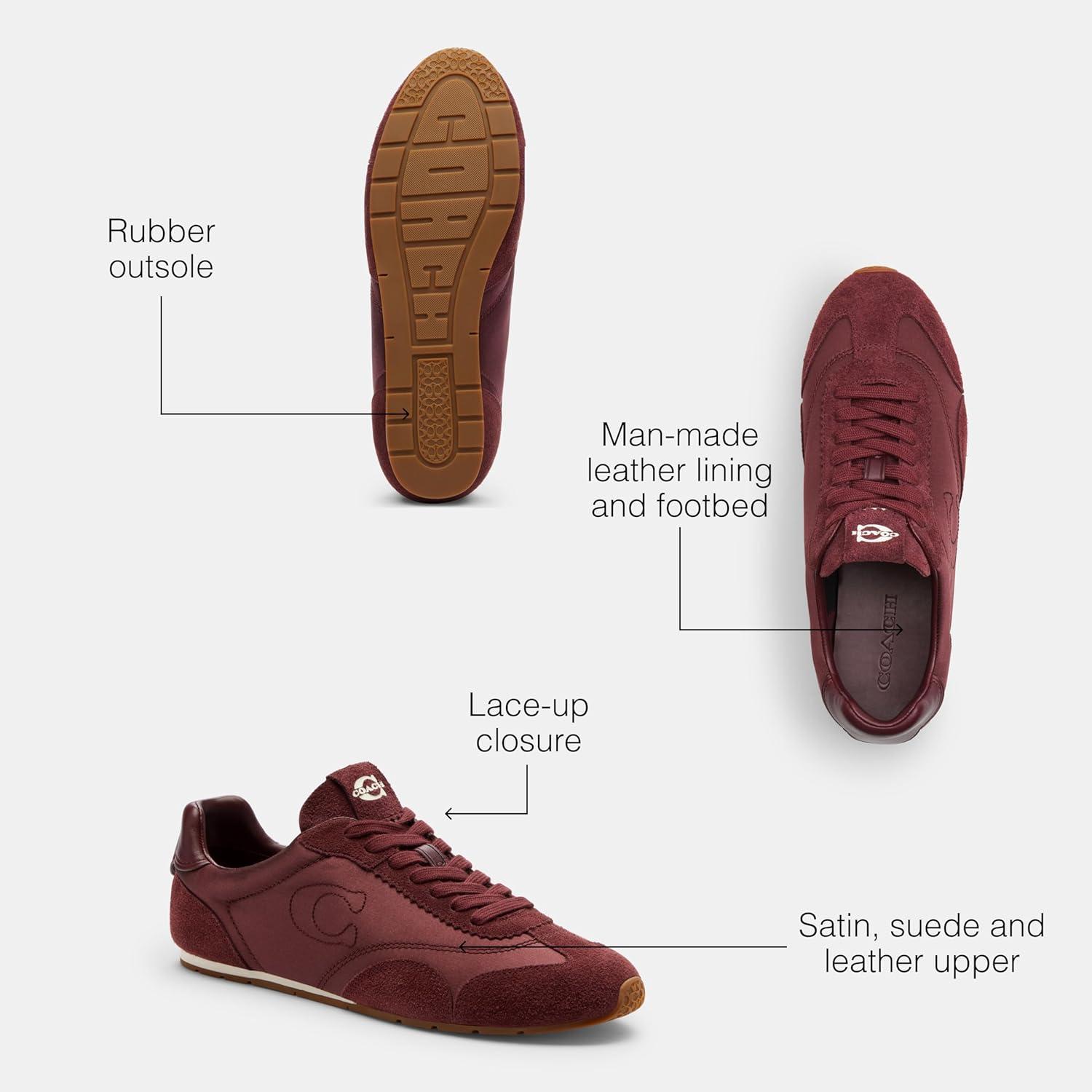A streamlined, on-the-go women's sneaker, this soft satin, leather and suede design from Coach features tonal stitching and laces and is accented with our perforated Signature for a Coach heritage touch. Satin, suede and leather upper, man-made leather lining and footbed, rubber outsole, lace-up closure