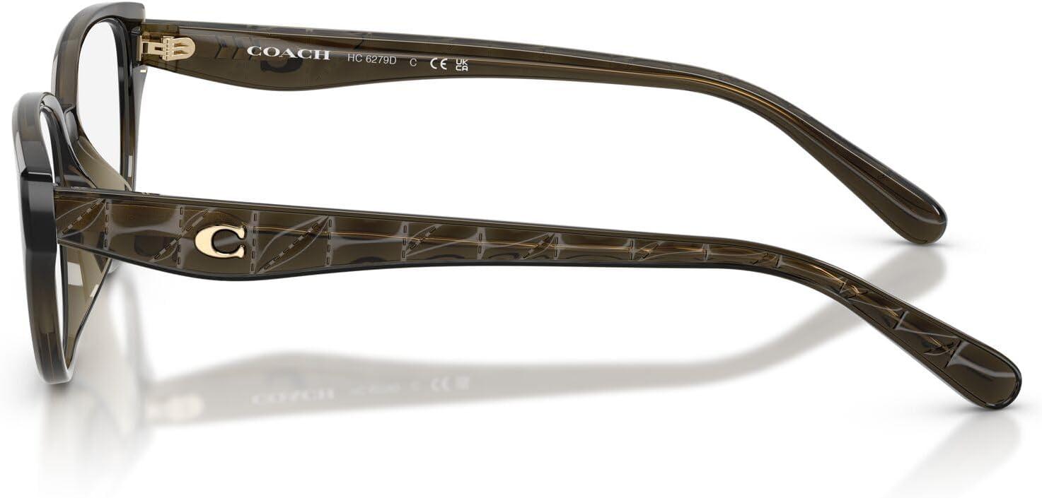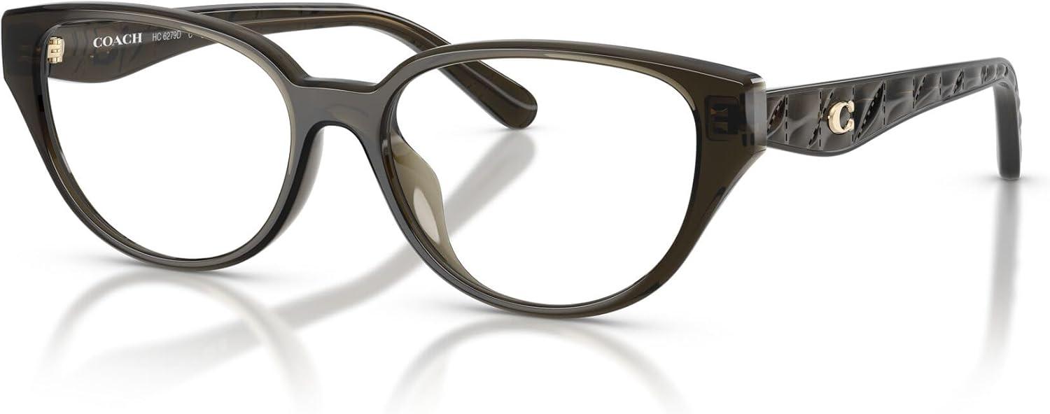 The Coach HC6279D eyeglass frames feature an elegant square silhouette from Coach's C Hardware collection. This sophisticated design showcases a quilted C execution at the temple that creates a distinctive luxury aesthetic with textured appeal. Available in refined colorways including black, transparent oak, milky merlot, and milky dark grey that offer both classic and contemporary styling options. The square shape provides flattering proportions while the quality construction ensures exceptional durability and all-day wearability. Perfect for the modern woman who appreciates sophisticated design with luxurious detailing, these frames transition effortlessly from professional to social settings. These prescription-ready frames are designed to be fitted with your custom prescription lenses for clear vision. Each pair comes with a protective case and cleaning cloth to preserve your frames and maintain their pristine appearance. Coach eyeglass frames sold by authorized sellers, like Amazon.com, are eligible for all manufacturer warranties and guarantees. Click on the Coach link above the product title to shop the entire Coach sunglass and eyeglass assortment.