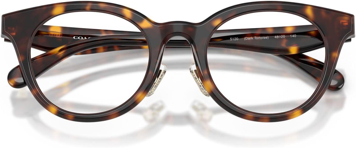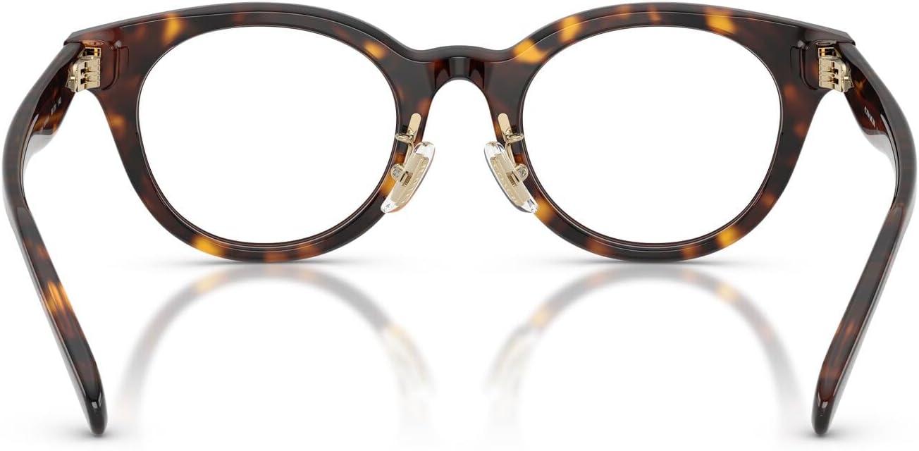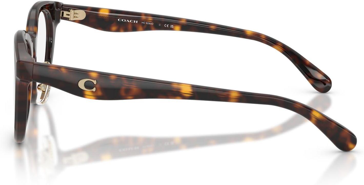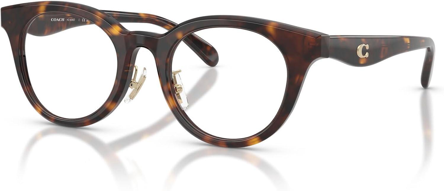The Coach HC6280D eyeglass frames feature an elegant round silhouette from Coach's Sculpted C Hardware collection. This sophisticated design showcases distinctive sculpted C hardware detailing on the temples with core wire for adjustability and gooseneck nose pads for enhanced comfort. Available in refined colorways including transparent dark grey, dark tortoise, transparent burgundy, and transparent brown that offer both classic and contemporary styling options. The round shape provides flattering proportions while the quality construction ensures exceptional durability and all-day wearability. Perfect for the modern woman who appreciates sophisticated design with luxurious detailing, these frames transition effortlessly from professional to social settings. These prescription-ready frames are designed to be fitted with your custom prescription lenses for clear vision. Each pair comes with a protective case and cleaning cloth to preserve your frames and maintain their pristine appearance. Coach eyeglass frames sold by authorized sellers, like Amazon.com, are eligible for all manufacturer warranties and guarantees. Click on the Coach link above the product title to shop the entire Coach sunglass and eyeglass assortment.