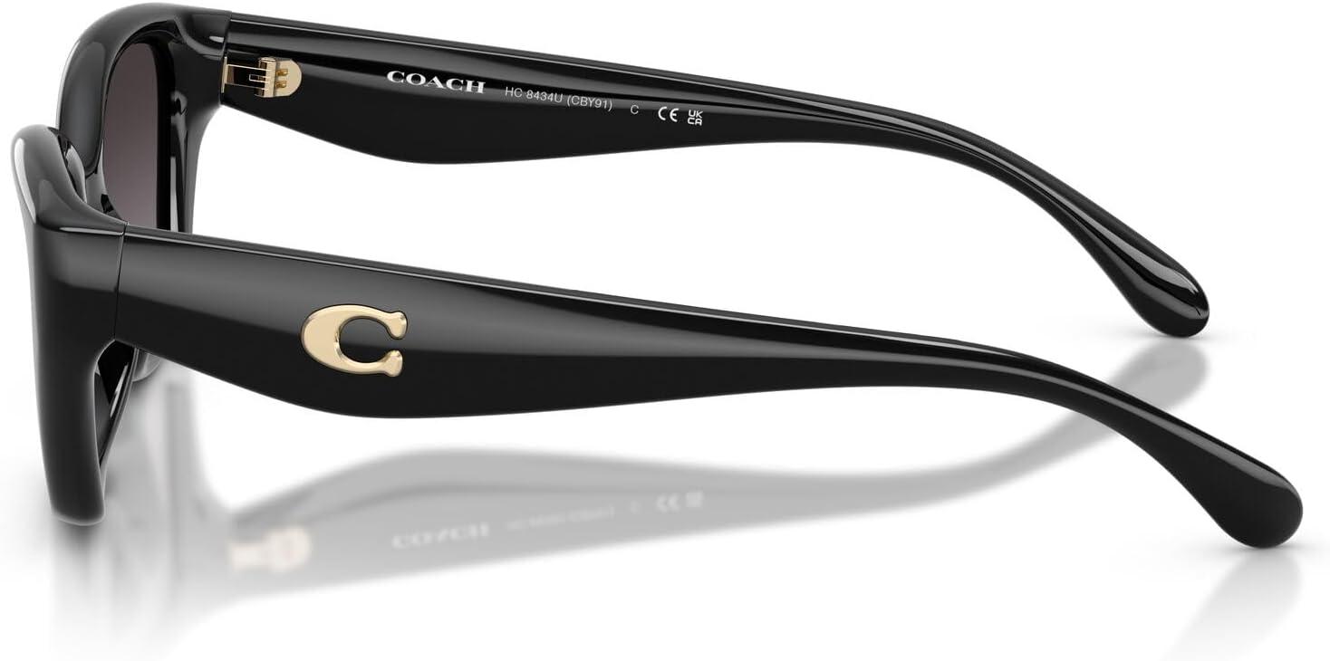 The Coach HC8434U Universal Fit sunglasses feature a distinctive cat eye silhouette from Coach's Sculpted C Hardware collection. This sophisticated design showcases sculpted C hardware detailing with universal fit technology that provides enhanced comfort through a narrower bridge and longer, more curved nose pads that increase grip while reducing the space between the frame and cheekbones. Available in versatile frame and lens combinations including black with grey solid lenses, black with grey gradient polarized lenses, milky putty with brown peach gradient lenses, milky cherry with berry mirrored lenses, metallic pearl with metallic mirrored lenses, and industrial grey with grey solid lenses that offer both classic and contemporary styling options. The cat eye shape provides flattering proportions while the universal fit construction ensures exceptional comfort and all-day wearability for all facial structures. Perfect for the modern woman who appreciates timeless cat eye design with inclusive fit technology, these sunglasses transition effortlessly from professional settings to social adventures. All lenses offer complete UV protection to shield your eyes from harmful rays during outdoor activities and daily wear. Each pair comes with a protective case and cleaning cloth to preserve your frames and maintain their pristine appearance. Coach sunglasses sold by authorized sellers, like Amazon.com, are eligible for all manufacturer warranties and guarantees. Click on the Coach link above the product title to shop the entire Coach sunglass and eyeglass assortment.