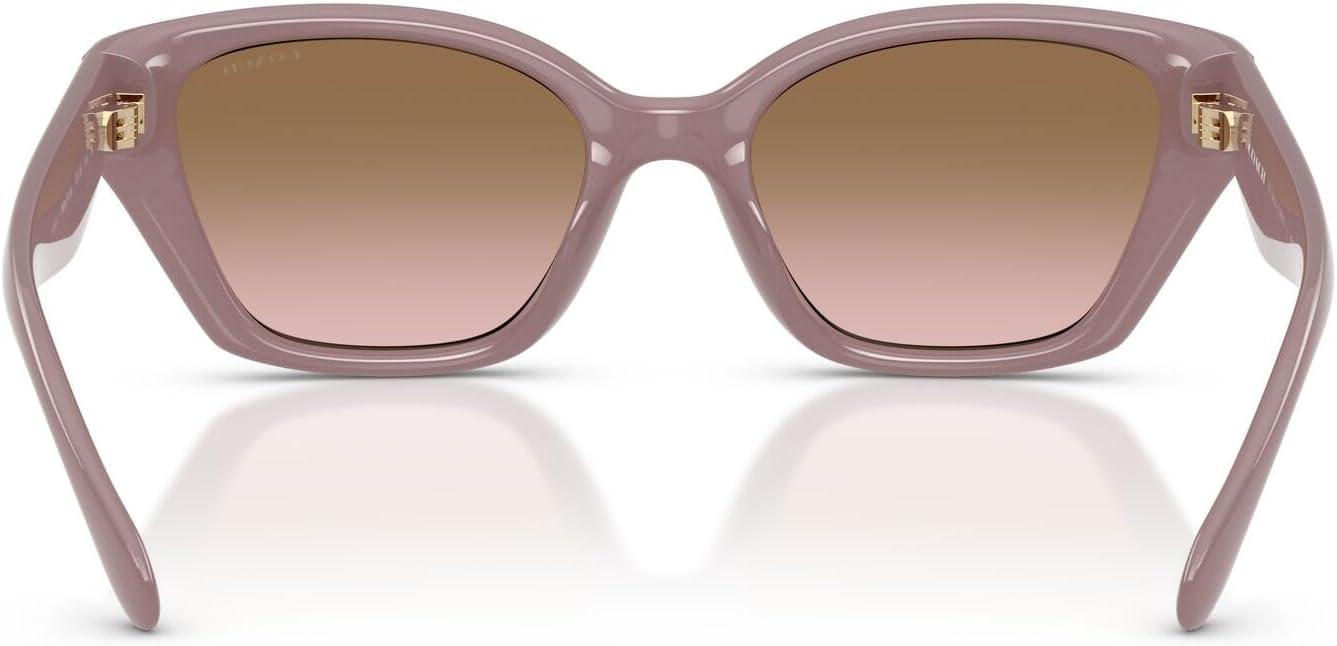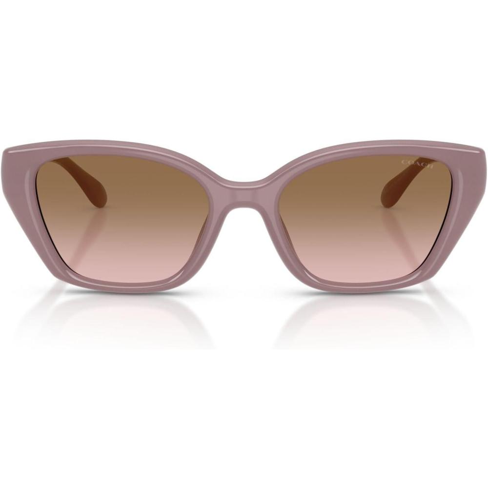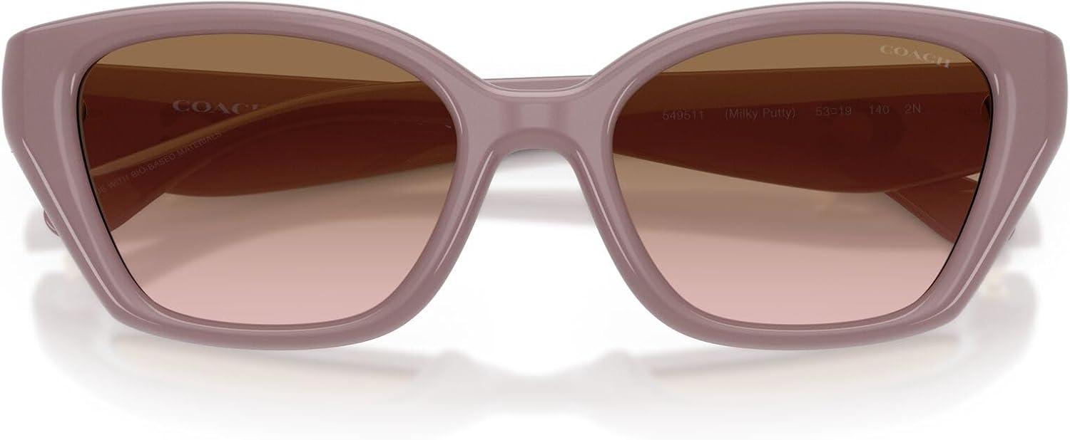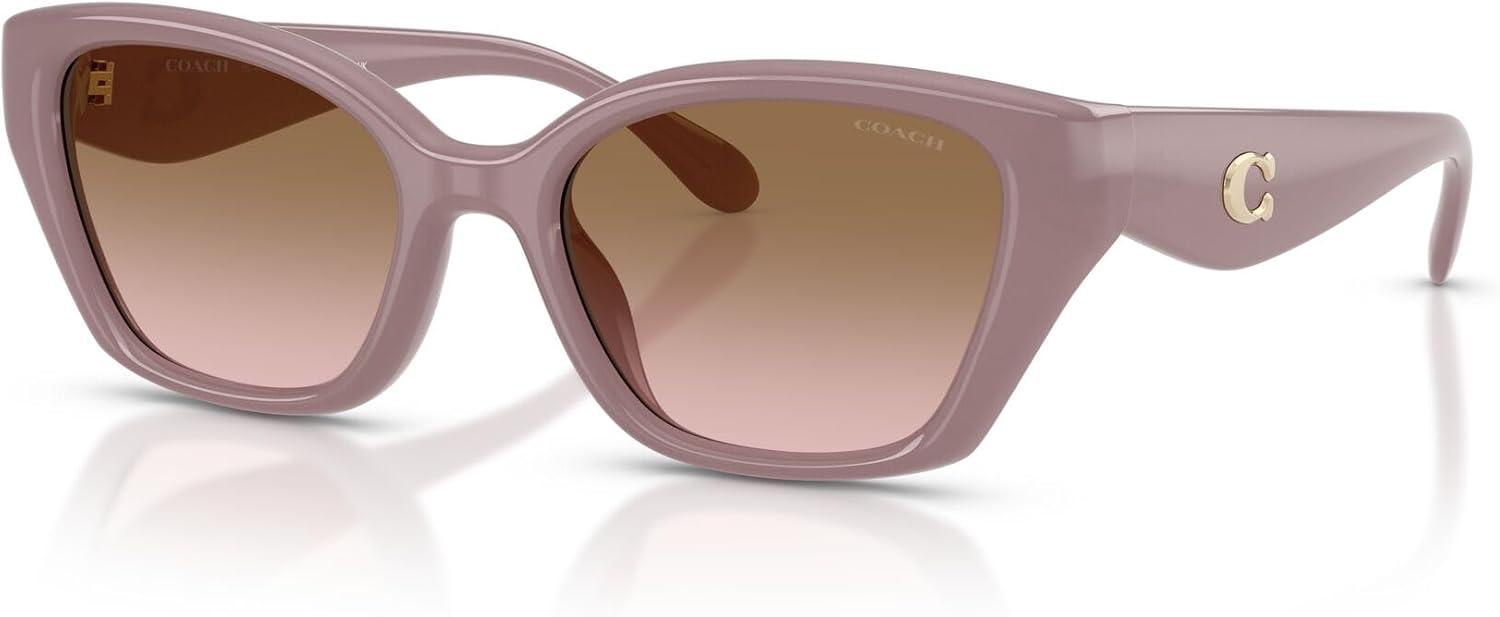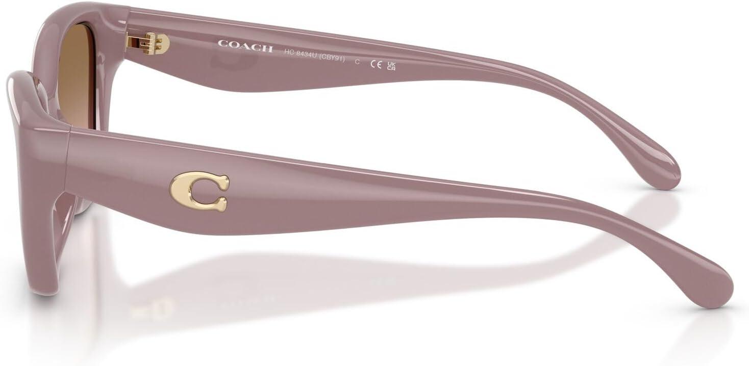 The Coach HC8434U Universal Fit sunglasses feature a distinctive cat eye silhouette from Coach's Sculpted C Hardware collection. This sophisticated design showcases sculpted C hardware detailing with universal fit technology that provides enhanced comfort through a narrower bridge and longer, more curved nose pads that increase grip while reducing the space between the frame and cheekbones. Available in versatile frame and lens combinations including black with grey solid lenses, black with grey gradient polarized lenses, milky putty with brown peach gradient lenses, milky cherry with berry mirrored lenses, metallic pearl with metallic mirrored lenses, and industrial grey with grey solid lenses that offer both classic and contemporary styling options. The cat eye shape provides flattering proportions while the universal fit construction ensures exceptional comfort and all-day wearability for all facial structures. Perfect for the modern woman who appreciates timeless cat eye design with inclusive fit technology, these sunglasses transition effortlessly from professional settings to social adventures. All lenses offer complete UV protection to shield your eyes from harmful rays during outdoor activities and daily wear. Each pair comes with a protective case and cleaning cloth to preserve your frames and maintain their pristine appearance. Coach sunglasses sold by authorized sellers, like Amazon.com, are eligible for all manufacturer warranties and guarantees. Click on the Coach link above the product title to shop the entire Coach sunglass and eyeglass assortment.