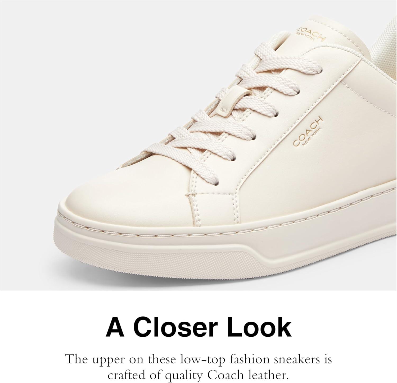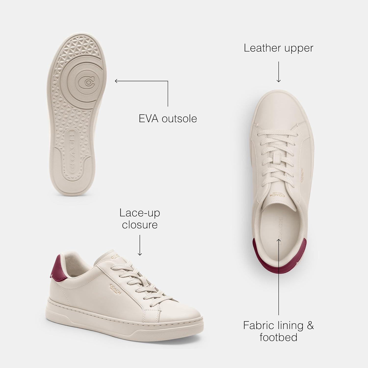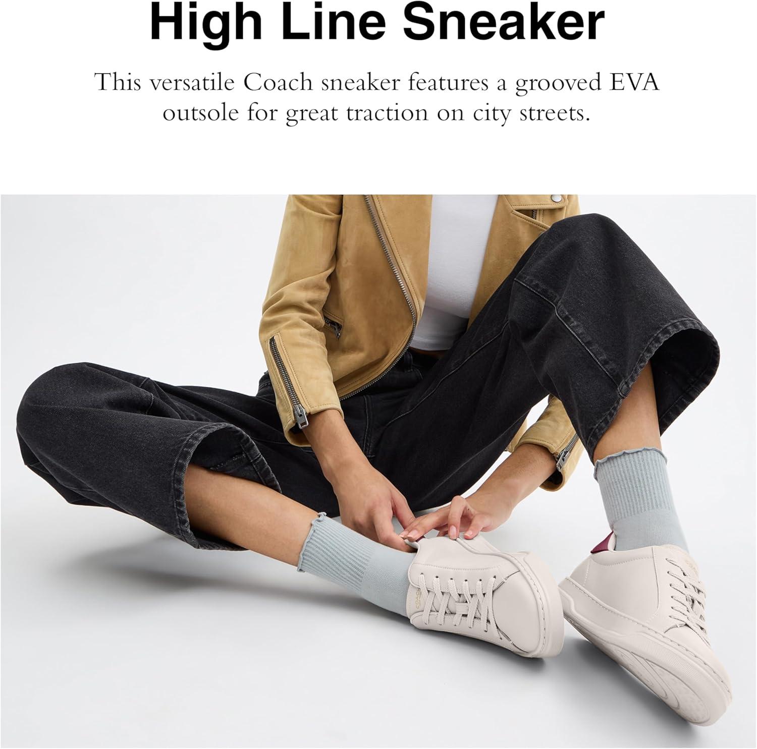 Hit the concrete jungle in style in the COACH High Line Signature Coated Canvas Sneaker. These lace-up shoes feature a round toe silhouette and a signature coated canvas and leather upper. Fabric lining and footbed. Low top silhouette. Lightly padded collar for added support. Branding on tongue and back. Ethylene vinyl acetate outsole.