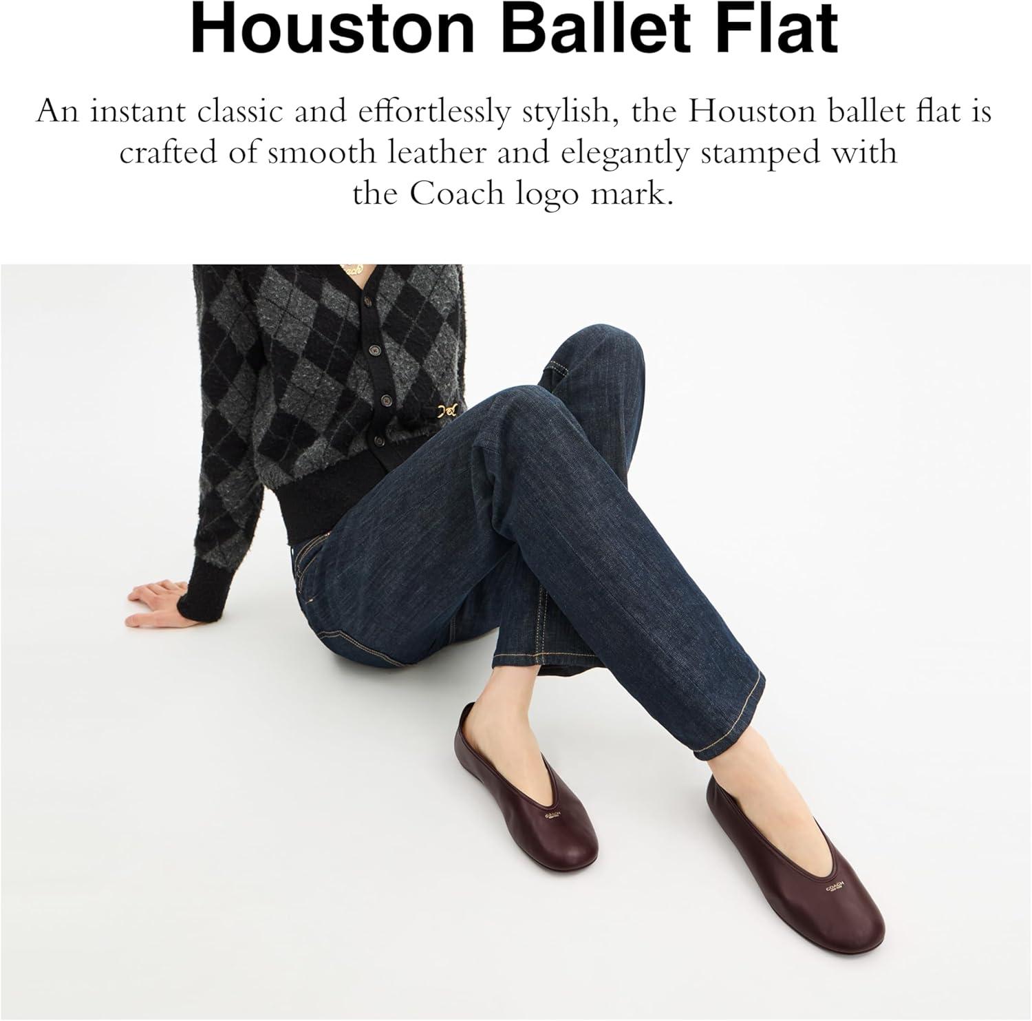 An instant classic and effortlessly stylish, the Houston ballet flat is crafted of smooth leather and elegantly stamped with the Coach logo mark. Leather upper, man-made leather lining and footbed, rubber outsole, slip on, 1/4″ heel