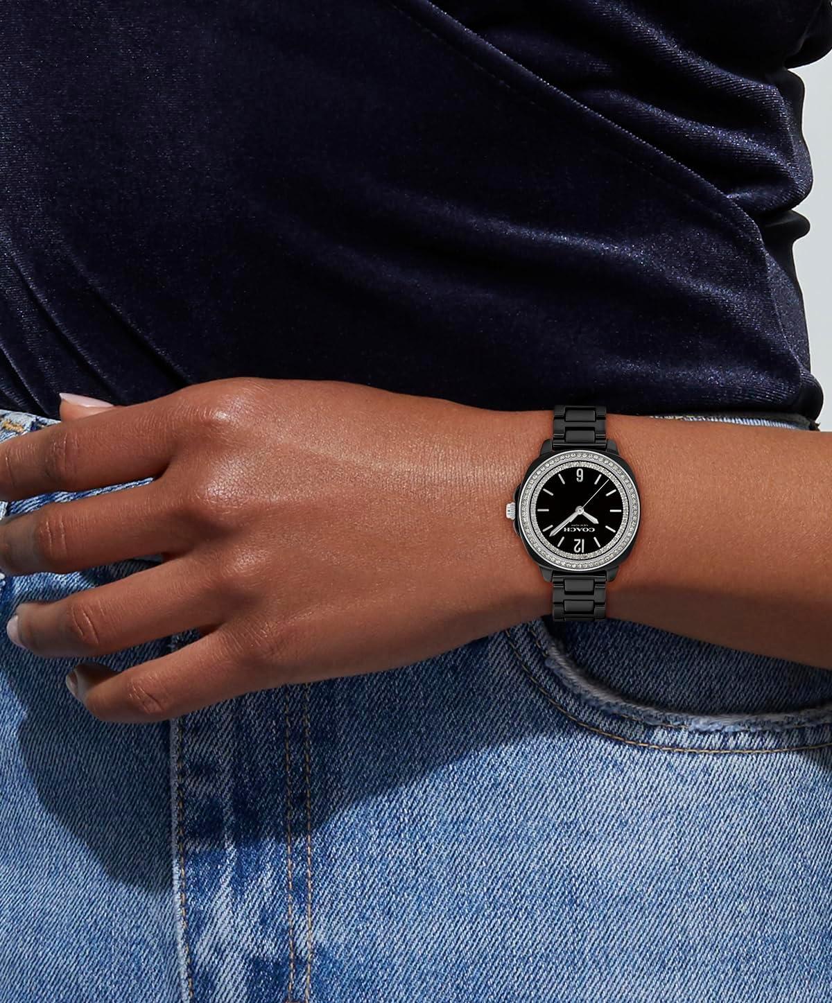 Coach Women’s Kitt 3H Quartz Ceramic Watch, 34mm Case Size, Link Bracelet, Crystal Bezel, Iconic Cushion Shape, Modern Style – Gift for Her(Black)