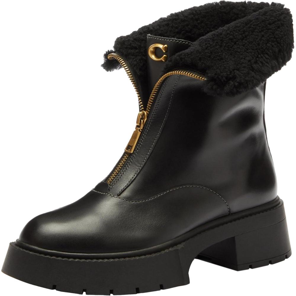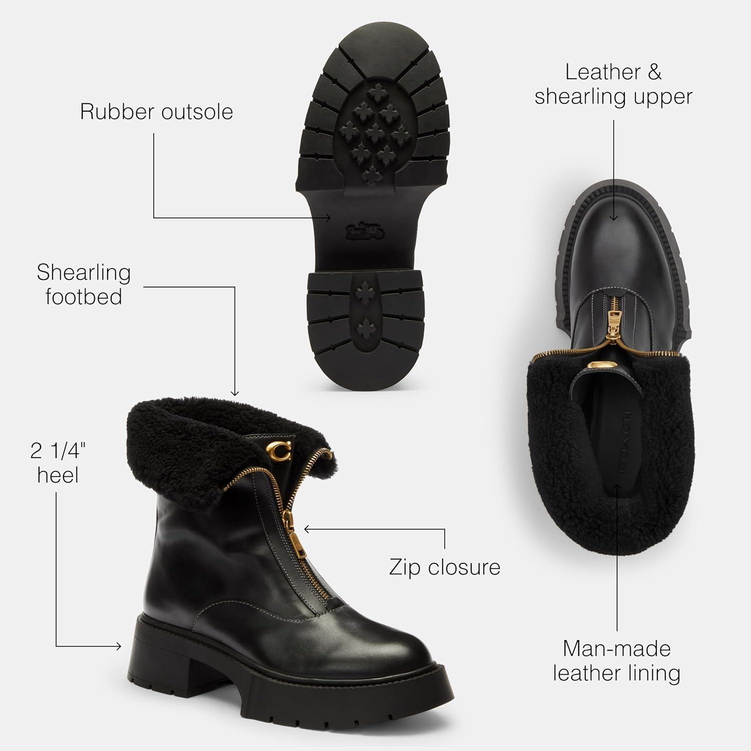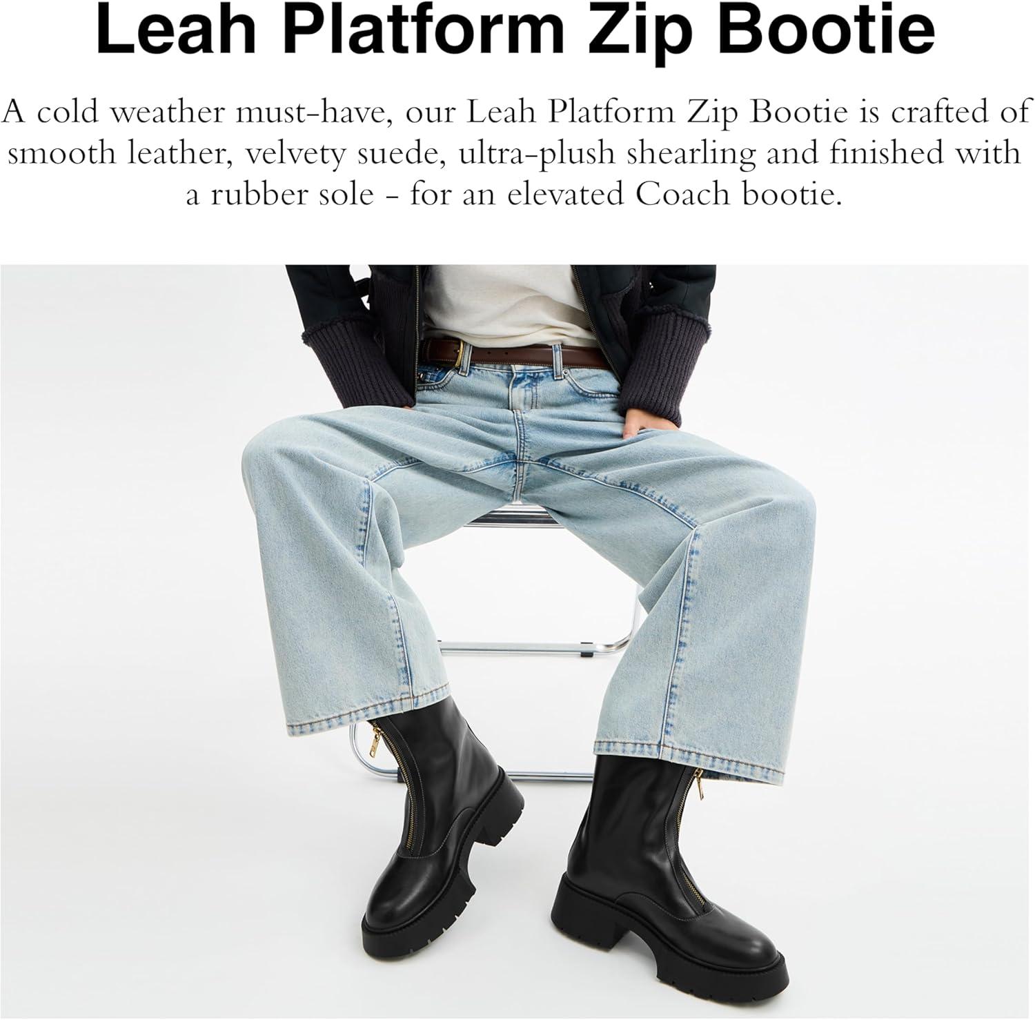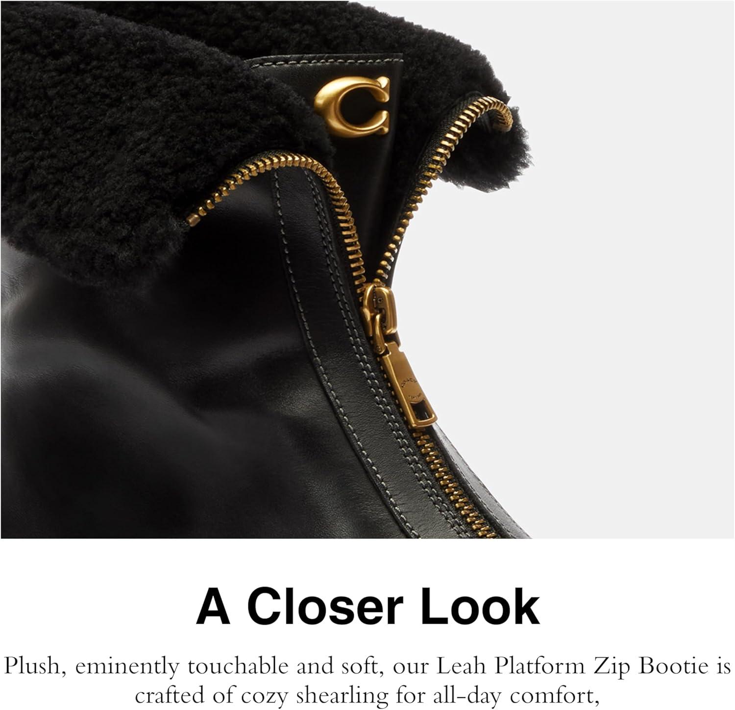 A cold weather must-have, our Leah Platform Zip Bootie is crafted of smooth leather, velvety suede, ultra-plush shearling and finished with a rubber sole – for an elevated Coach bootie. Suede and shearling upper, man-made leather lining, shearling footbed, rubber outsole and zip closure. Shaft: 7 1/2″ height, 15 1/4″ circumference, 2 1/4″ heel