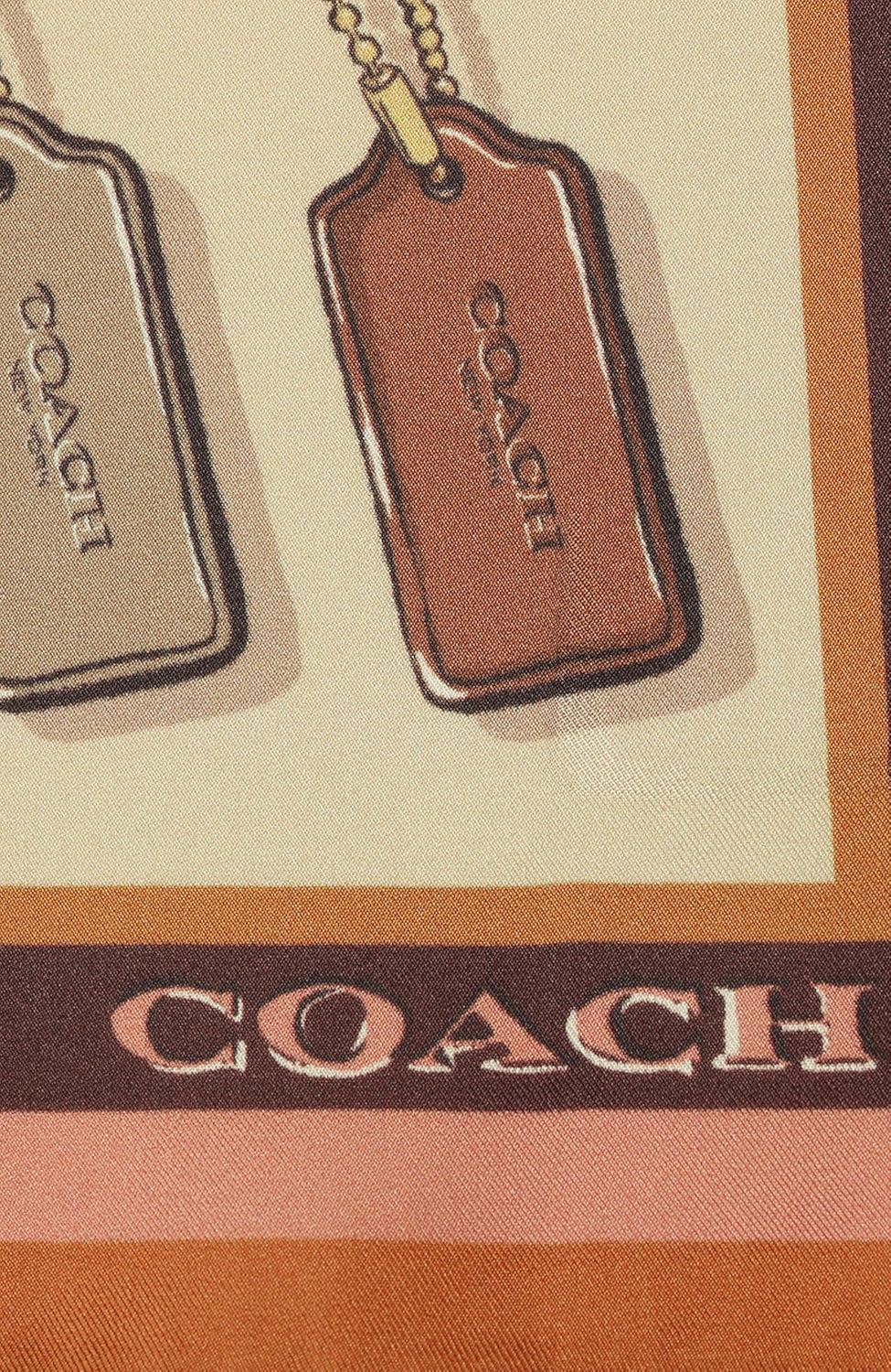 This lightweight silk square scarf is printed with images of our iconic Coach hang tag. The carf features the Coach Badge and is finished with a solid border.
