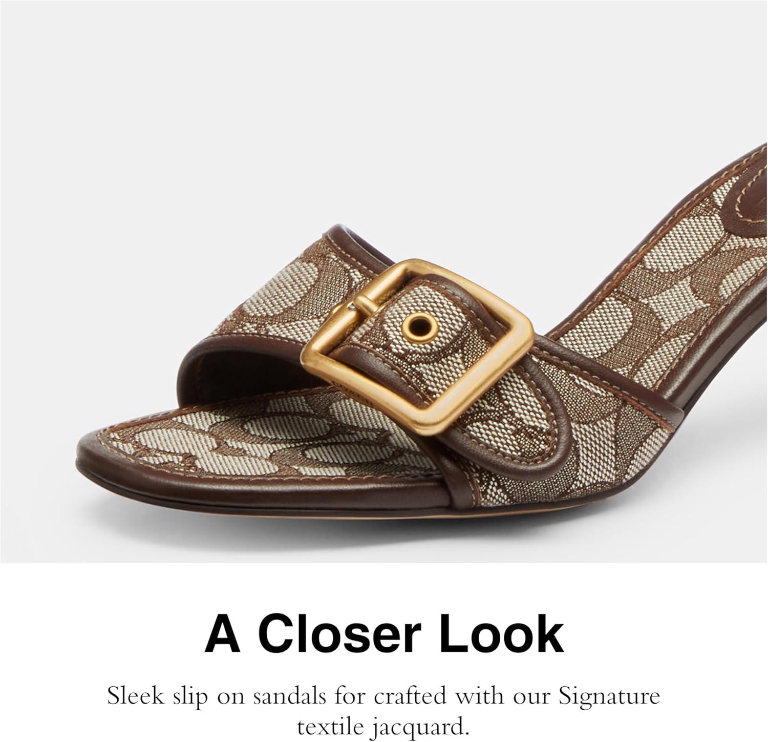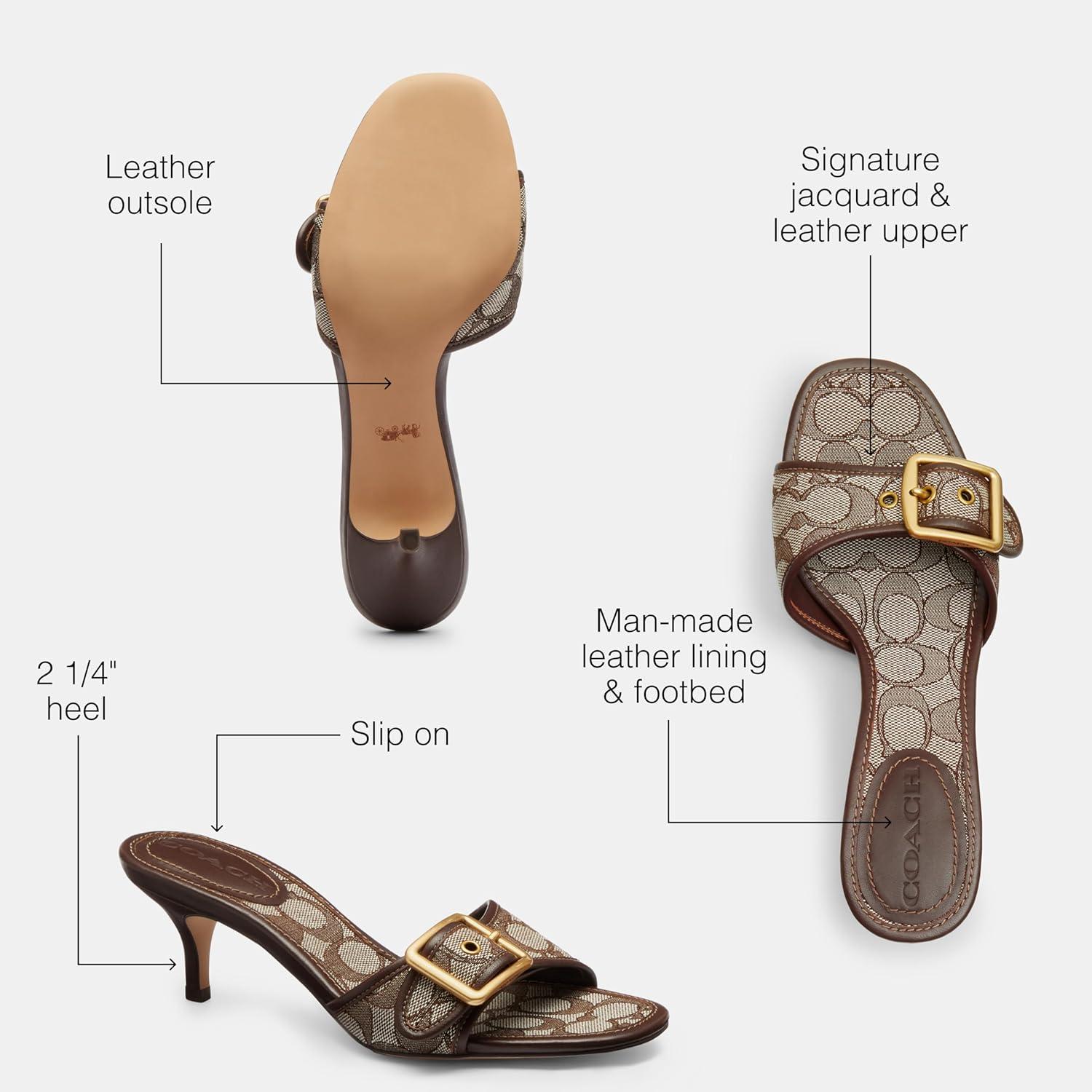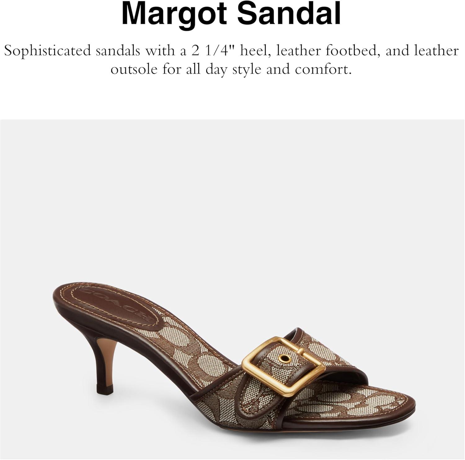 Our Margot Sandal with kitten heel, gold buckle and Signature jacquard and leather pattern gives all the Fall vibes. This sophisticated slip on features signature jacquard and leather upper, this man-made leather lining, leather footbed, leather outsole and 2 1/4″ heel that take you to work or a night on the town