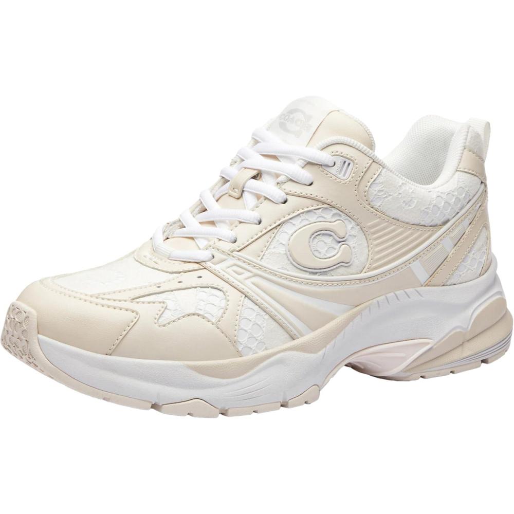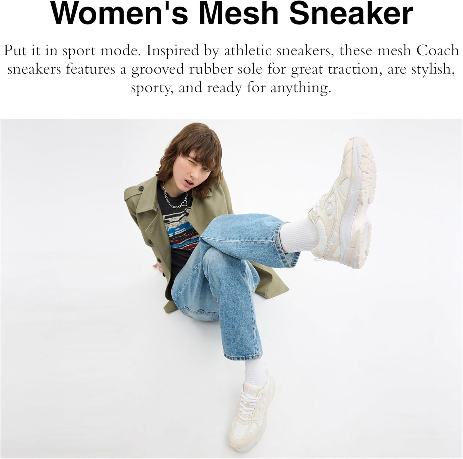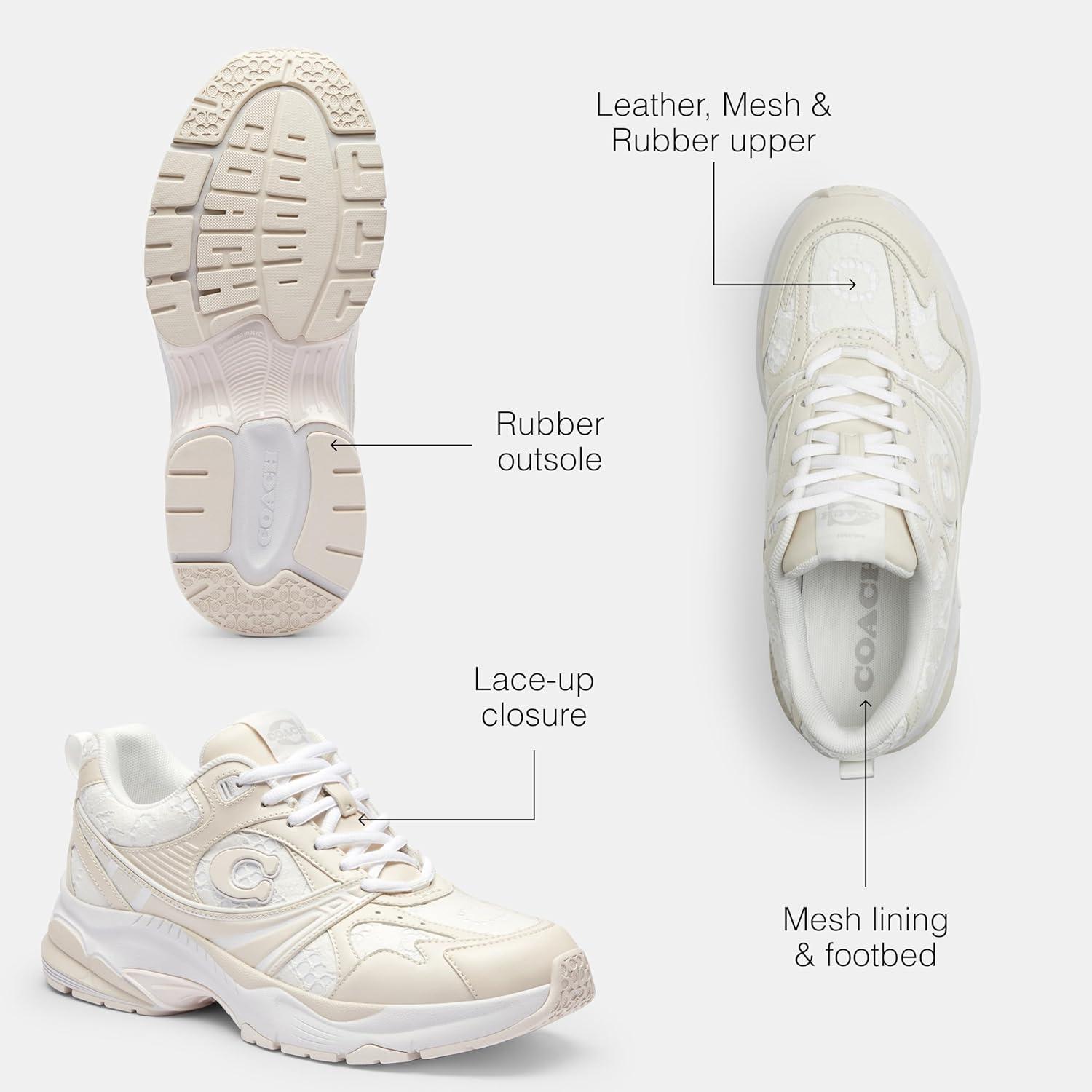 Put it in sport mode. Inspired by athletic sneakers from the 2000s and crafted with metallic leather detailing, these mesh Coach women's sneakers are finished with our Signature for a heritage touch and ready for anything. Mesh, suede, leather, Signature coated canvas and rubber upper, mesh lining and footbed, rubber outsole, lace-up closure