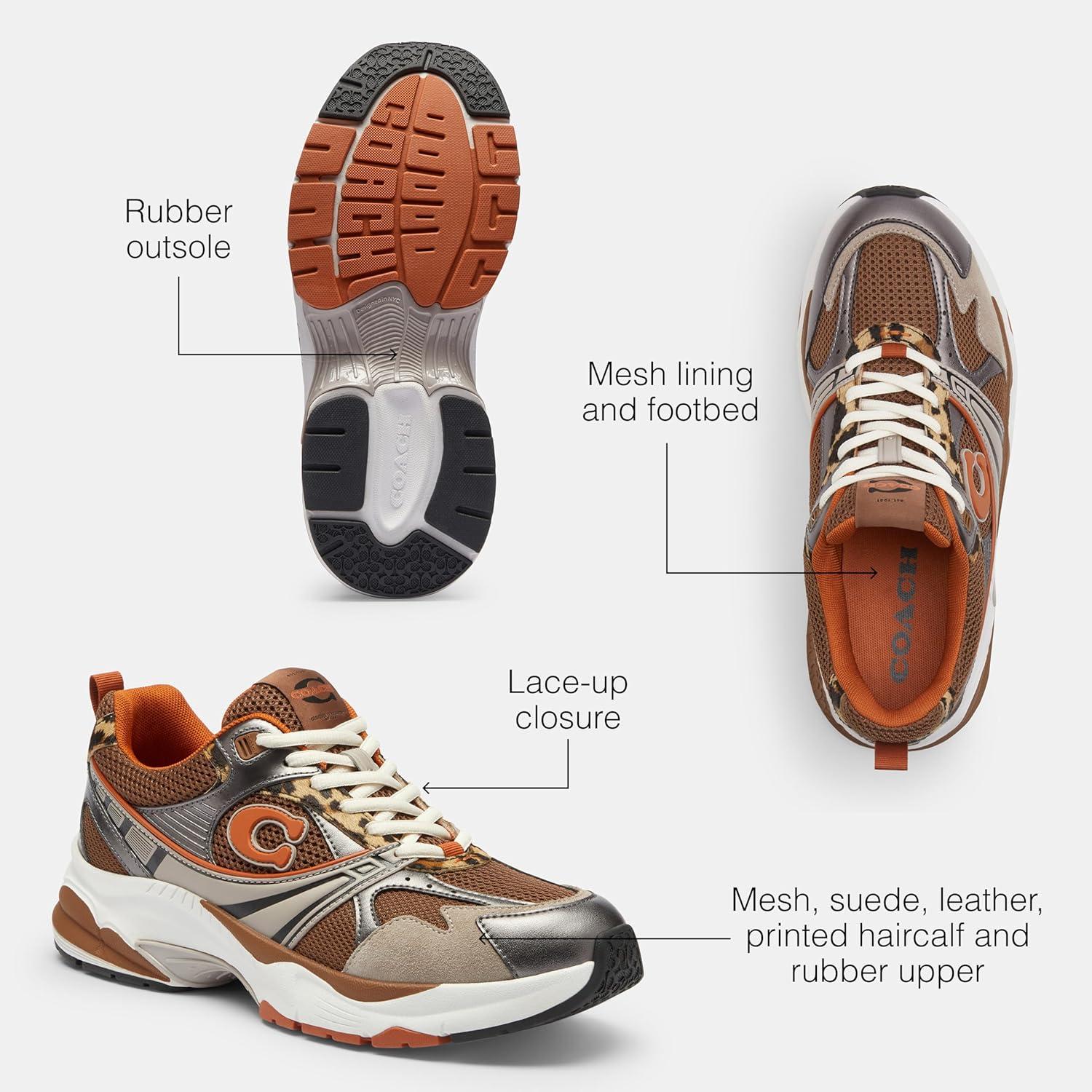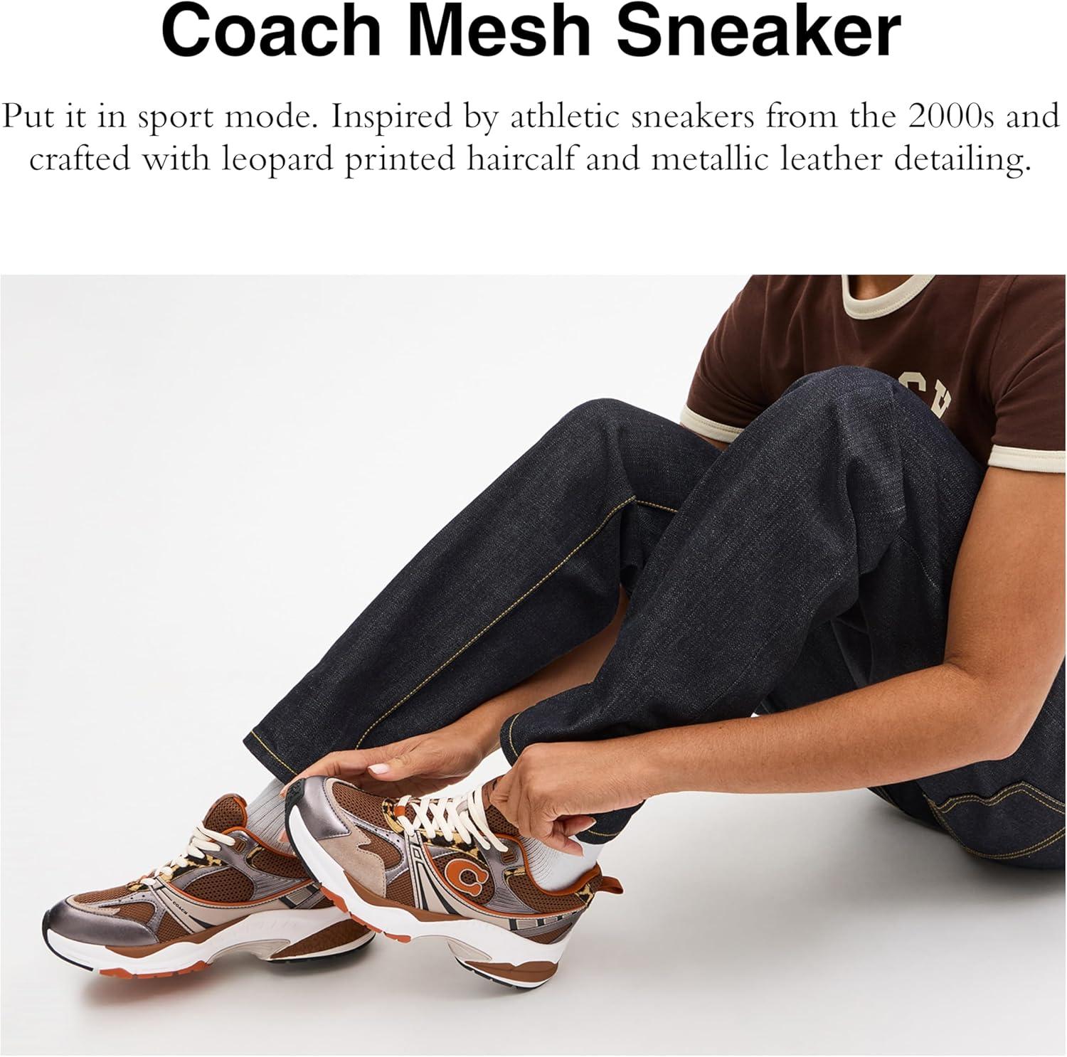 Put it in sport mode. Inspired by athletic sneakers from the 2000s and crafted with metallic leather detailing, these mesh Coach women's sneakers are finished with our Signature for a heritage touch and ready for anything. Mesh, suede, leather, Signature coated canvas and rubber upper, mesh lining and footbed, rubber outsole, lace-up closure