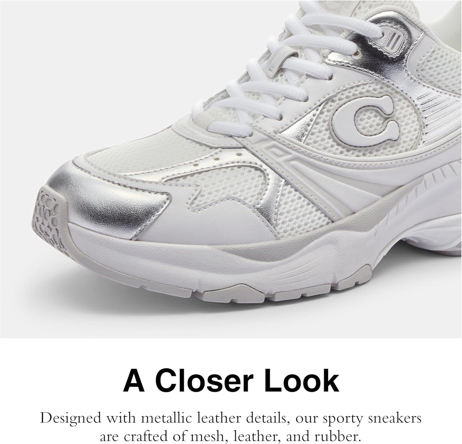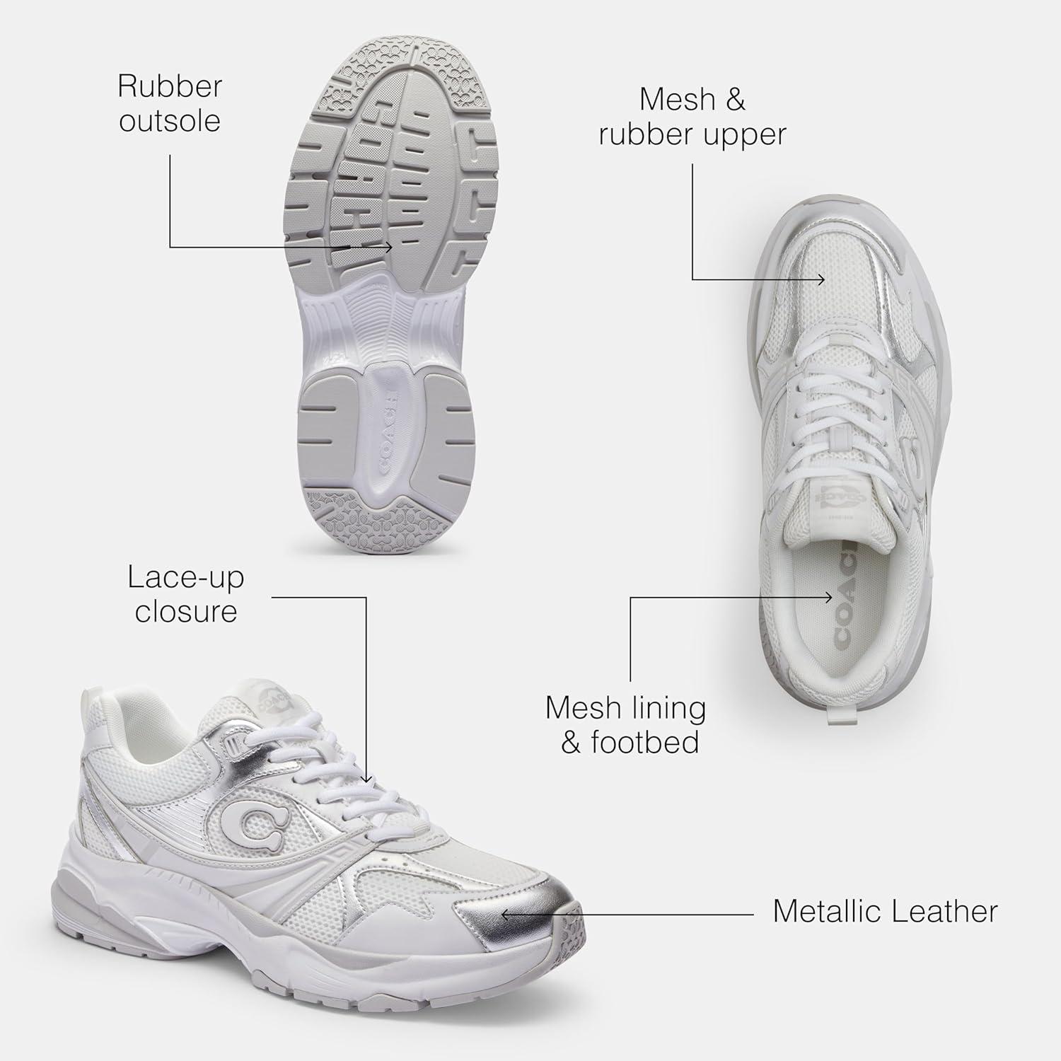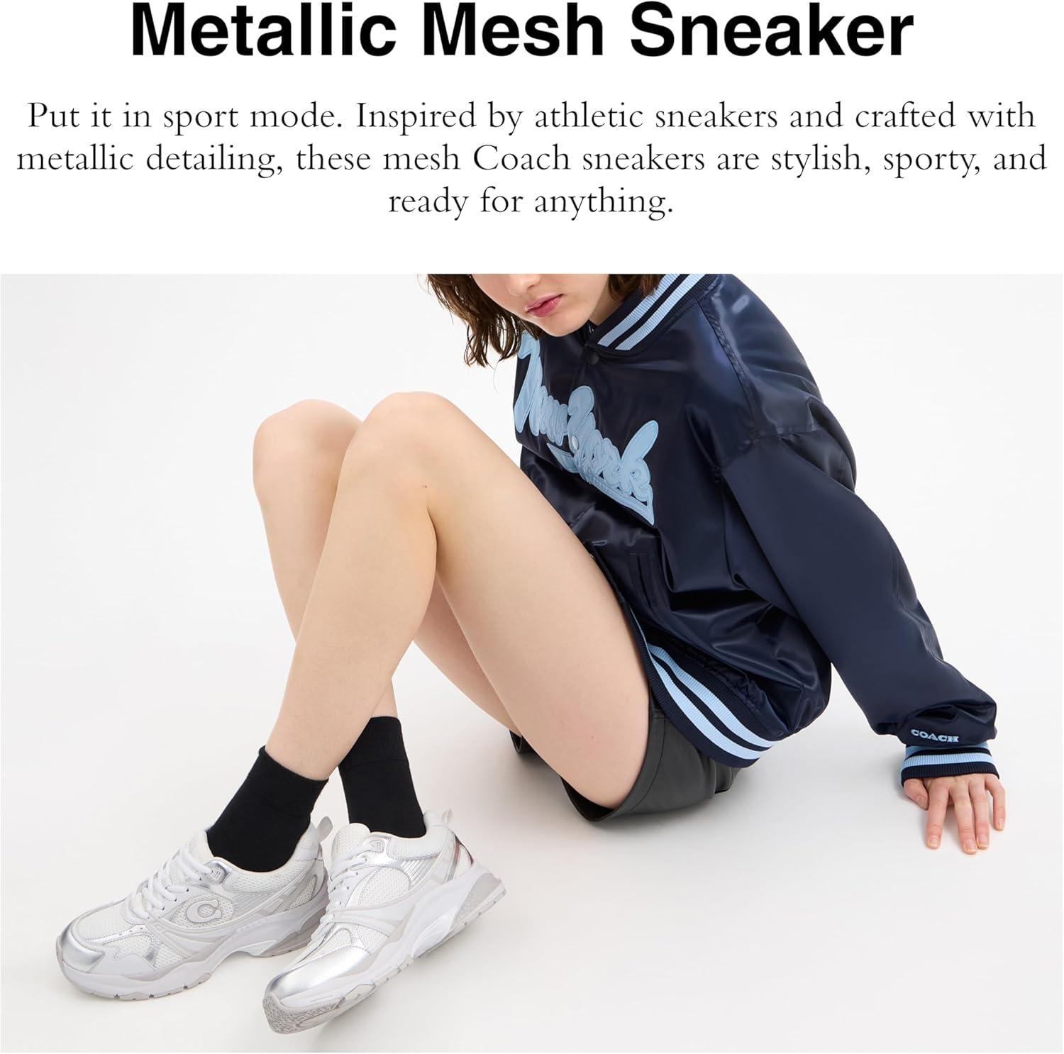 Put it in sport mode. Inspired by athletic sneakers and crafted with metallic detailing, these mesh Coach sneakers are stylish, sporty, and ready for anything. Metallic leather, mesh and rubber upper, mesh lining and footbed, rubber outsole, lace-up closure.