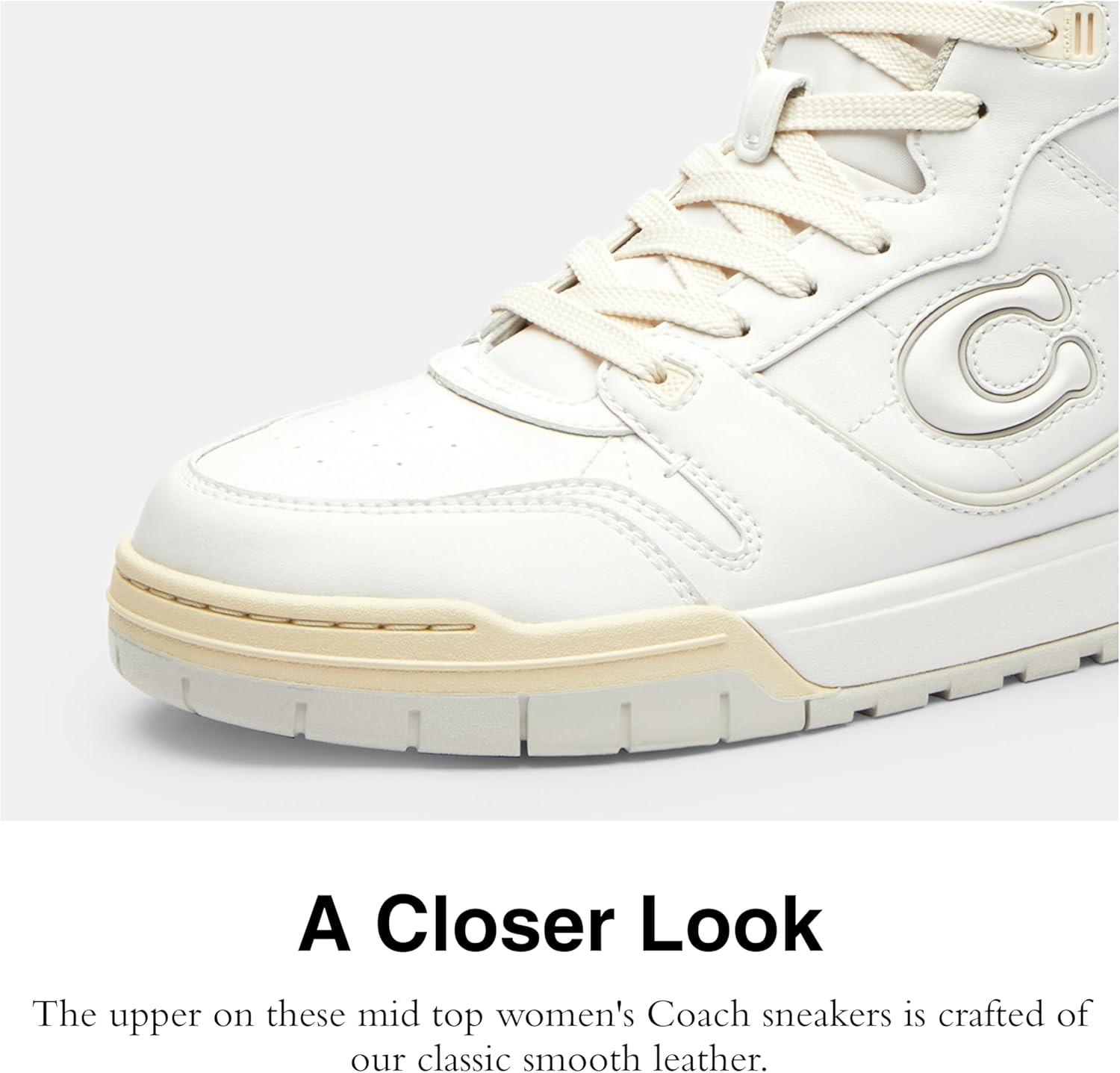With added height for an extra touch of style, our Coach Mid-Top Soho Sneaker is inspired by the courageous free spirit of our hometown New York City and built to keep pace with life on the go. These comfortable women's sneakers are finished with a grooved rubber outsole detailed with a map of Manhattan. Leather upper, fabric lining and footbed, EVA midsole, rubber outsole, lace-up closure