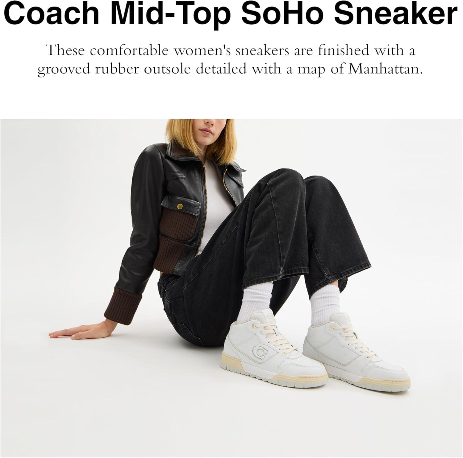 With added height for an extra touch of style, our Coach Mid-Top Soho Sneaker is inspired by the courageous free spirit of our hometown New York City and built to keep pace with life on the go. These comfortable women's sneakers are finished with a grooved rubber outsole detailed with a map of Manhattan. Signature coated canvas and leather upper, fabric lining and footbed, EVA midsole, rubber outsole, lace-up closure