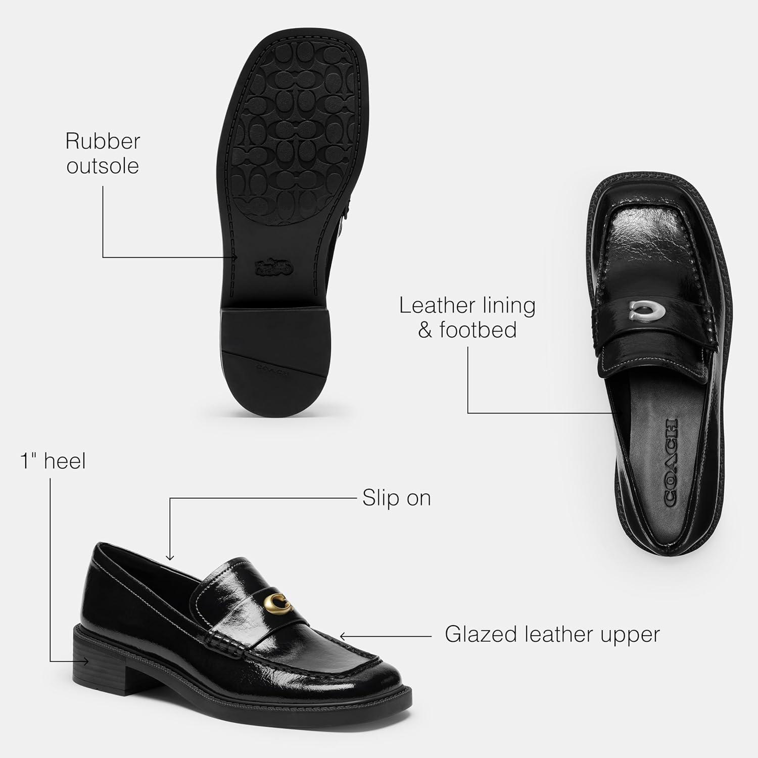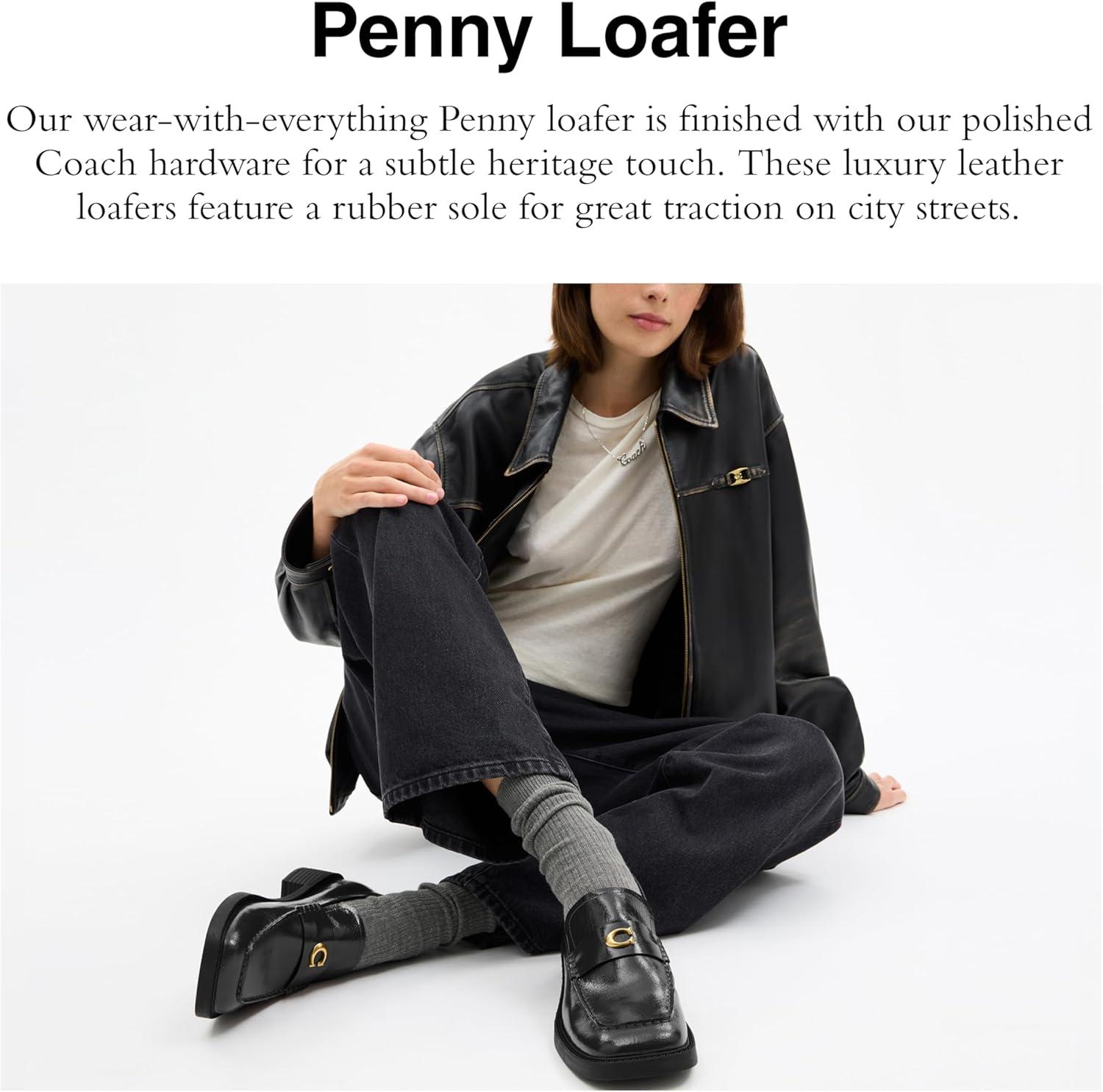 Our wear-with-everything Penny loafer features a glazed leather upper & is finished with our polished Coach hardware for a subtle heritage touch. These luxury leather loafers feature a 1″ heel and a rubber sole for great traction on city streets.