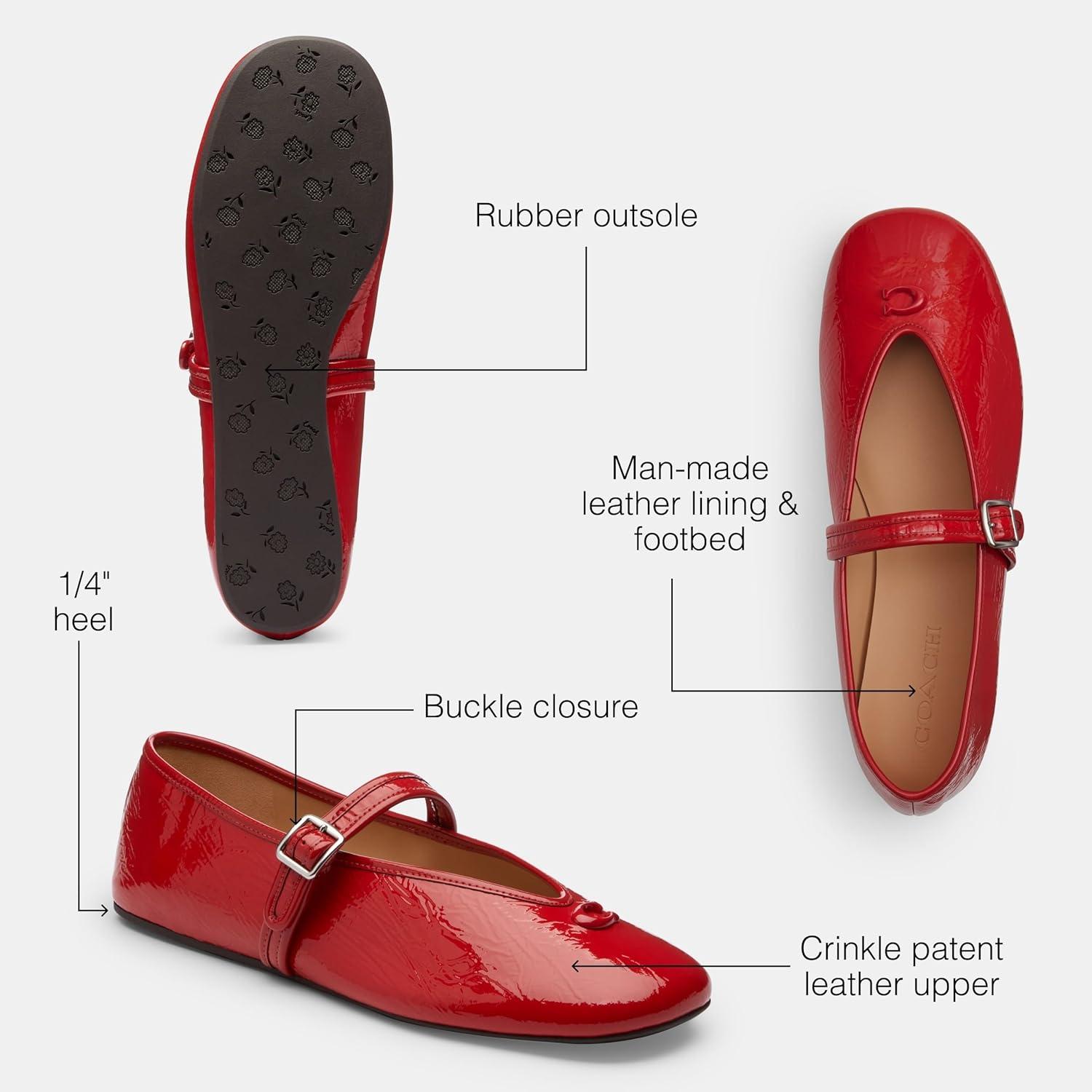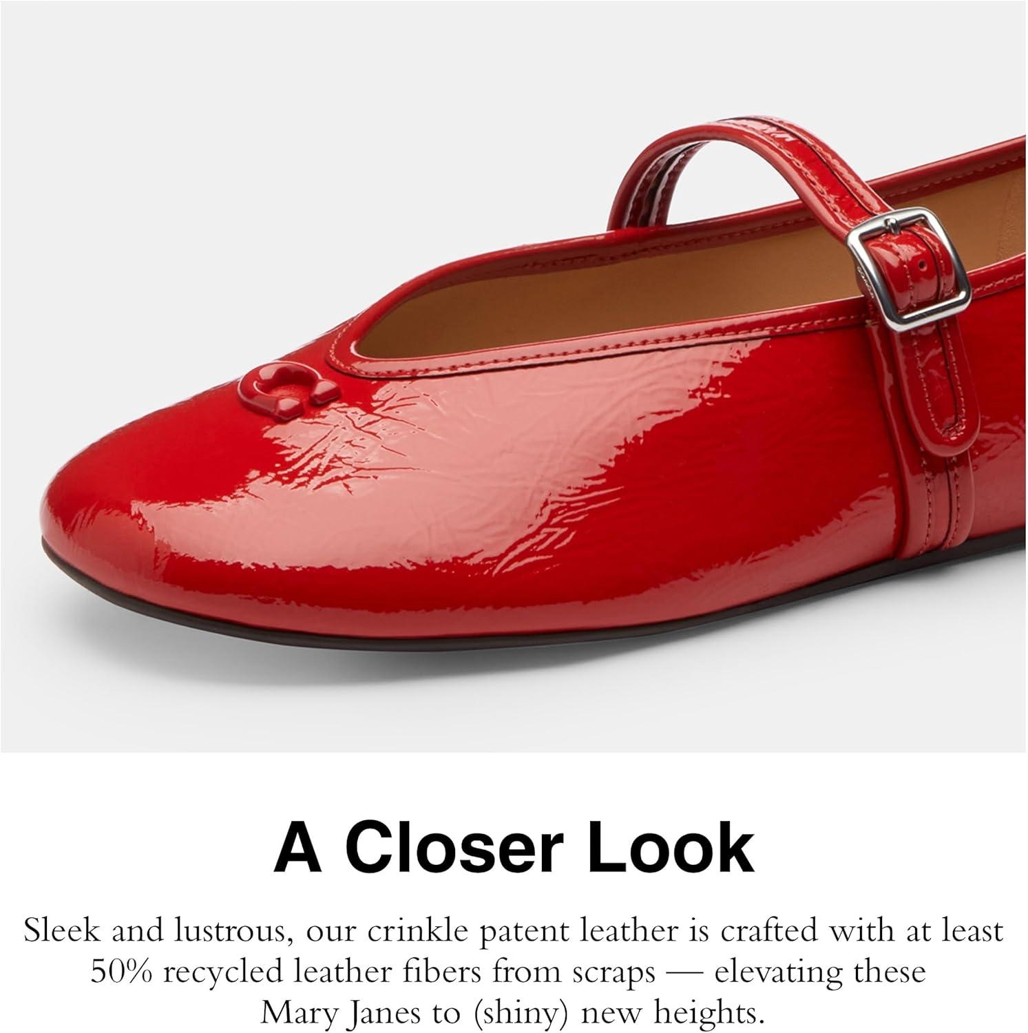Glossy glam meets retro romance in the COACH Sculpted C Crinkle Patent Leather Soft Mary Jane. With a crinkle patent leather upper that catches the light just right, these shoes are made to stand out. The iconic sculpted C detail adds a signature touch, while the soft silhouette and slip-on ease blend effortlessly with style and comfort. A sleek buckle closure adds vintage flair and a secure fit. Inside, a man-made leather lining and leather footbed cradle your feet in luxe softness, while a durable rubber outsole ensures grip and all-day wearability.