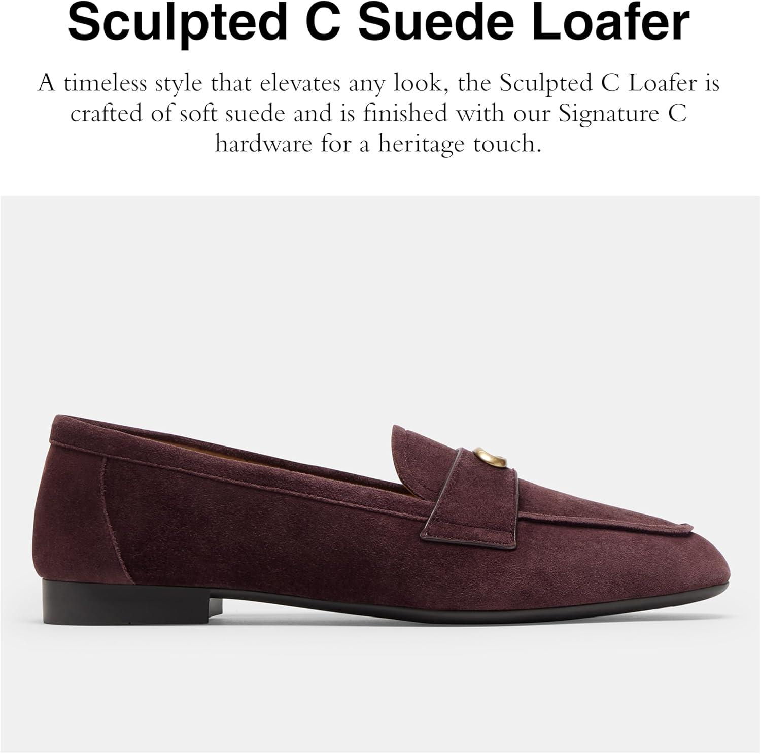 A timeless style that elevates any look, the Sculpted C Loafer is crafted of soft suede and is finished with our Signature C hardware for a heritage touch. Suede upper, man-made leather lining, leather footbed, rubber outsole, slip on, 1/2″ heel