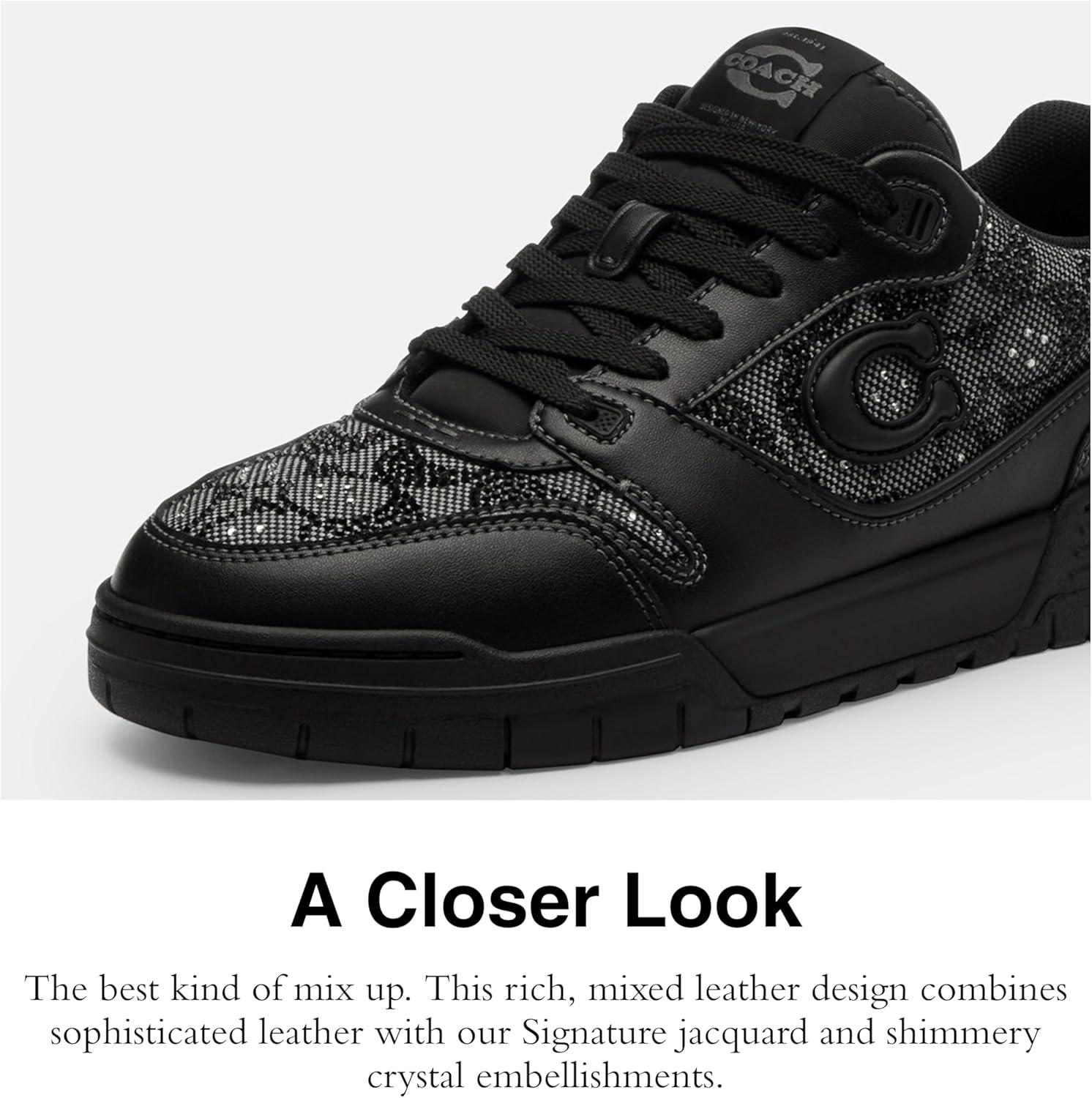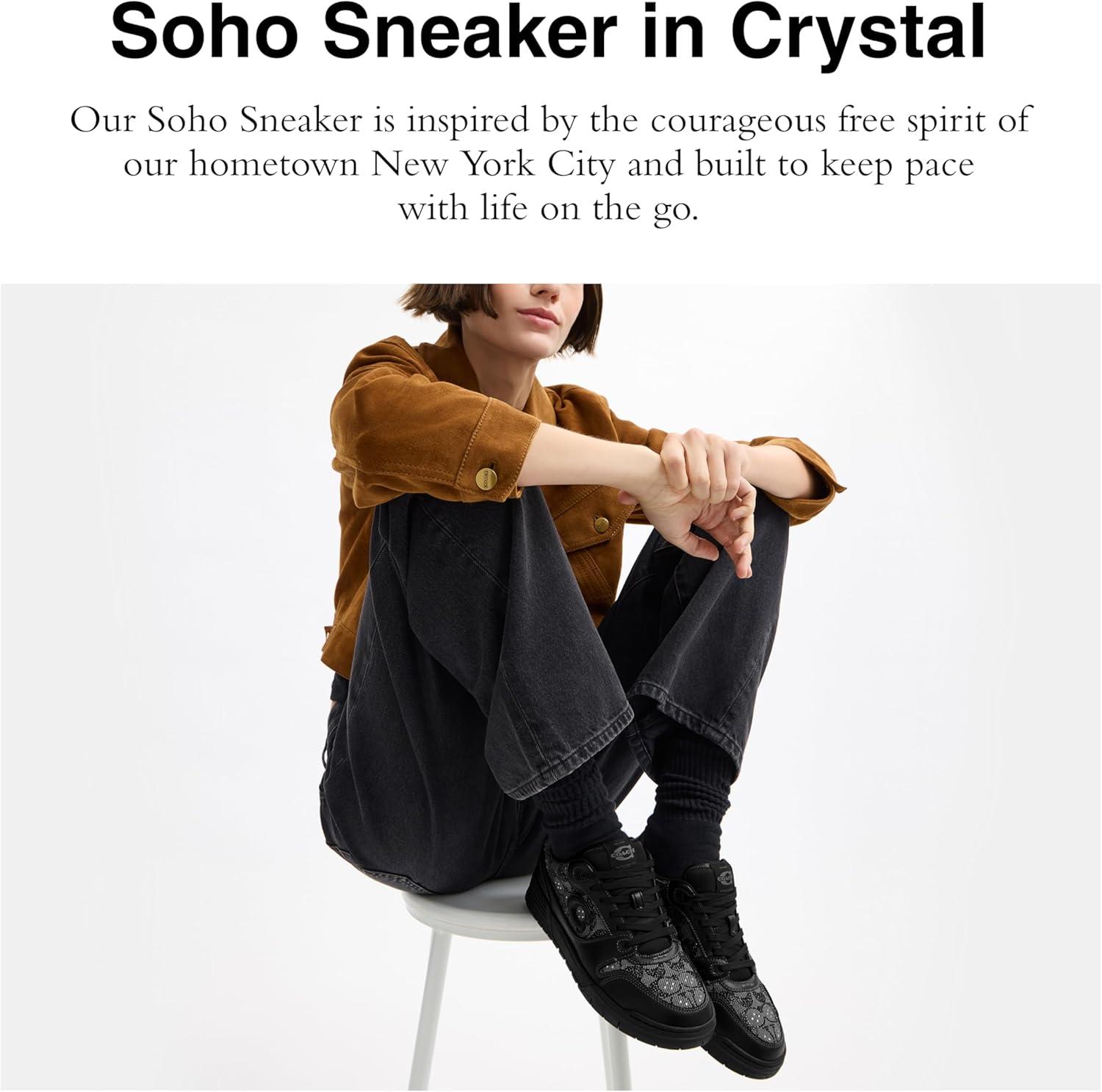 Inspired by the courageous free spirit of our hometown New York City and built to keep pace with life on the go, our Soho women's sneakers make a fashion statement with a shimmery crystal-embellished. This sporty Coach sneaker features a grooved rubber sole for great traction on city streets, EVA midsole, leather and suede upper, fabric lining and footbed, and lace-up closure.