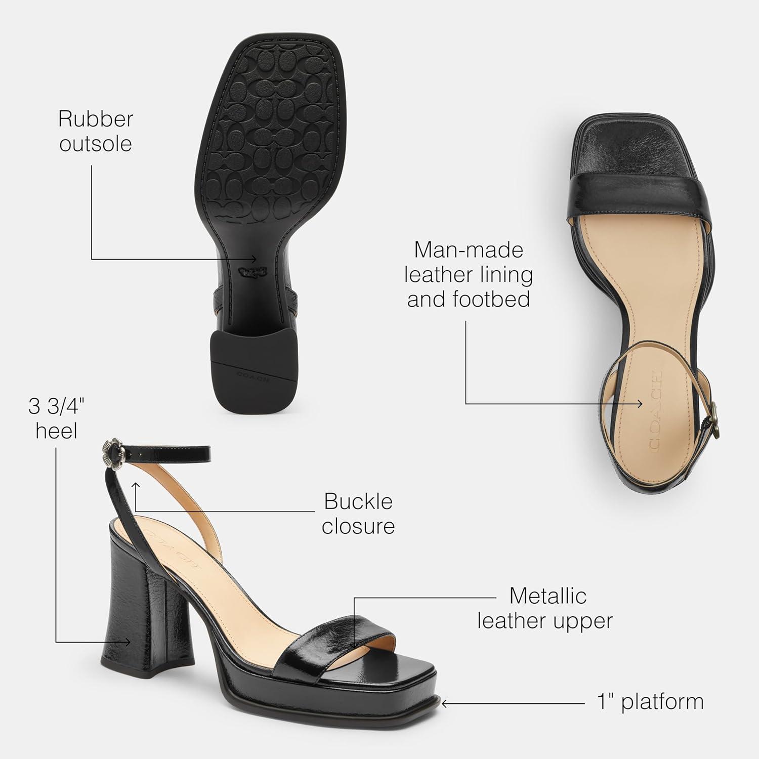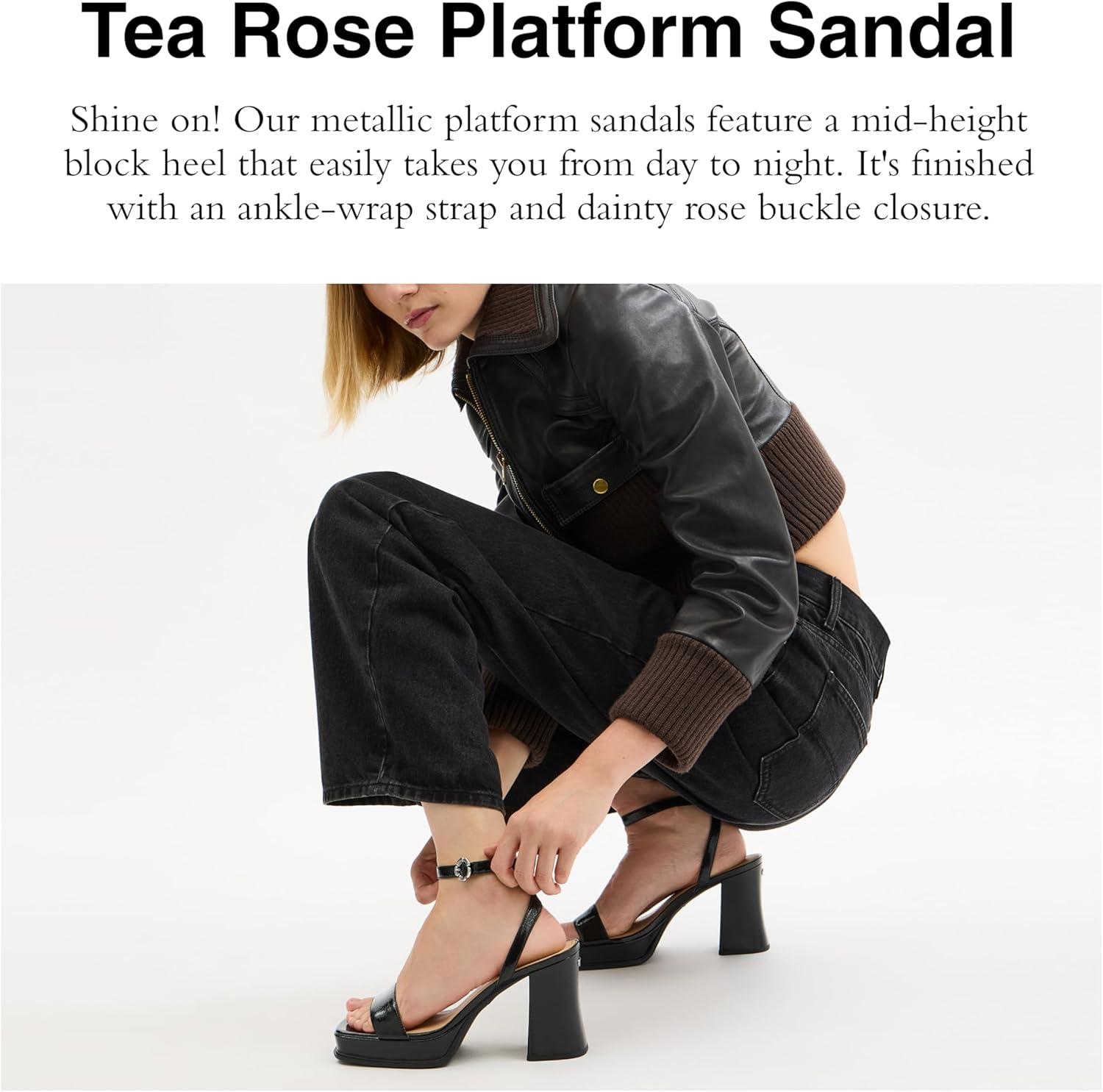 Shine on! Our Tea Rose Pllatform Sandals are crafted of glazed leather and feature a mid-height block heel that easily takes you from day to night. It's finished with a dainty rose buckle closure and our Signature C hardware fo a heritage touch. Glazed leather upper, man-made leather lining and footbed, rubber outsole, buckle closure, 3 3/4″ heel; 1″ platform