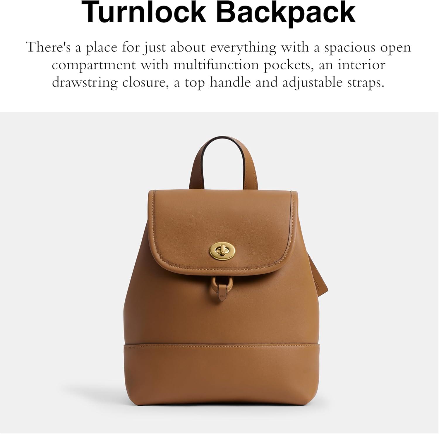 The Turnlock Backpack is part of The Coach Originals, a collection of archival-inspired bags that celebrates our legacy and authentic New York heritage. Reimagined for today, this glovetanned leather style is based on a beloved 1997 Coach design. Some styles are just too good to leave in the archives. Finished with our iconic turnlock closure and classic edge-binding construction for durability and extra strength, it has a spacious open compartment with multifunction pockets, an interior drawstring closure, a convenient top handle and comfortable adjustable straps. 7 1/2″ (L) x 9 1/4″ (H) x 4 1/2″ (W)