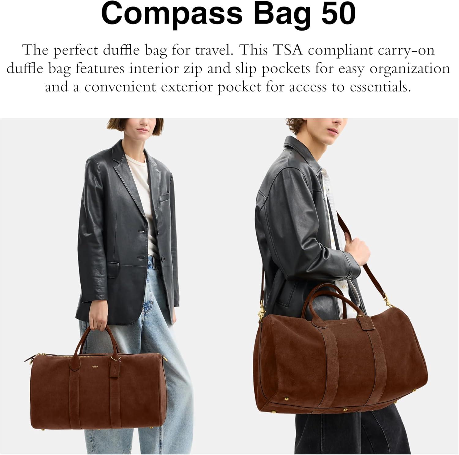 The Compass 50 is a sleek, streamlined travel duffle. This no-fuss, generously-sized carry-on bag is secured by a zip closure and finished with a detachable strap for shoulder or crossbody wear. The perfect duffle bag for travel. This TSA compliant carry-on duffle bag features interior zip and slip pockets for easy organization and a convenient exterior pocket for access to essentials