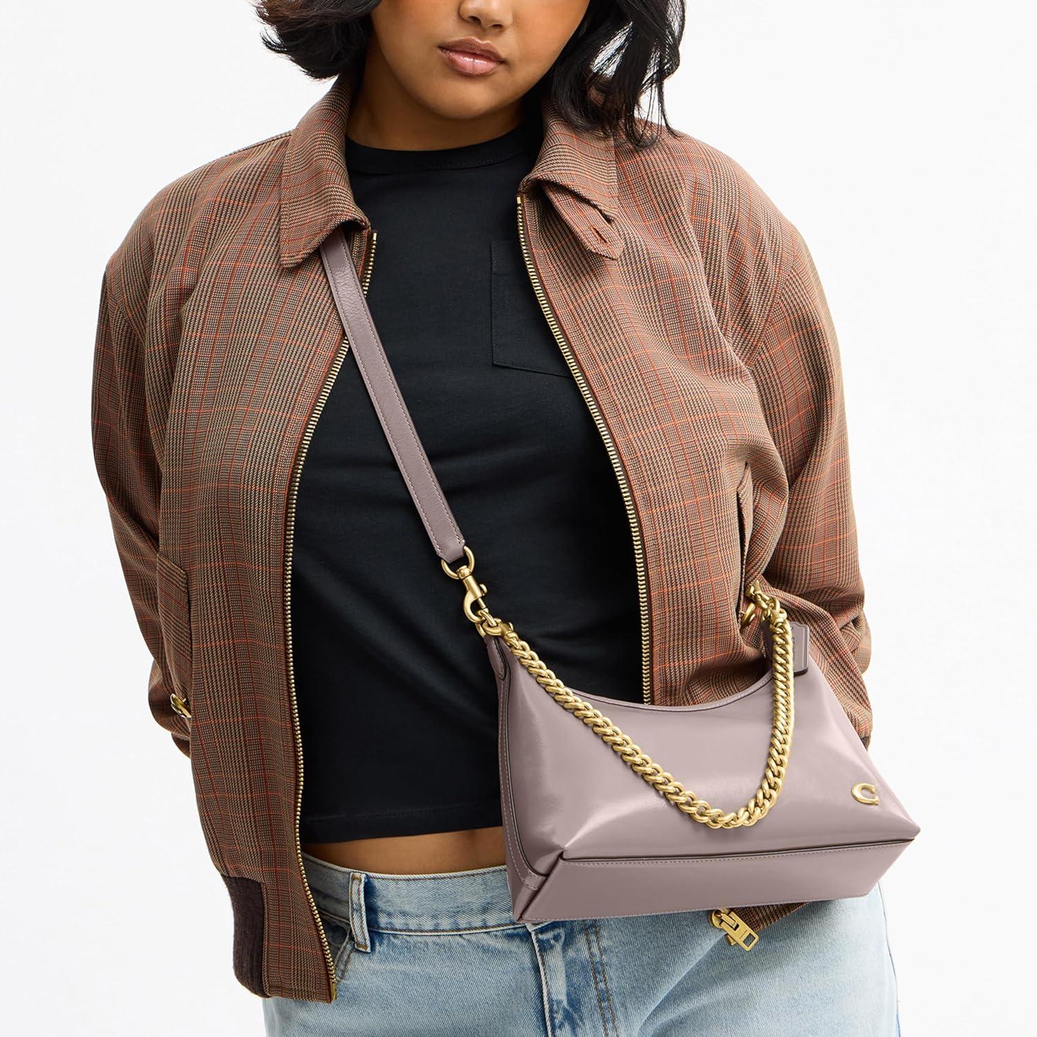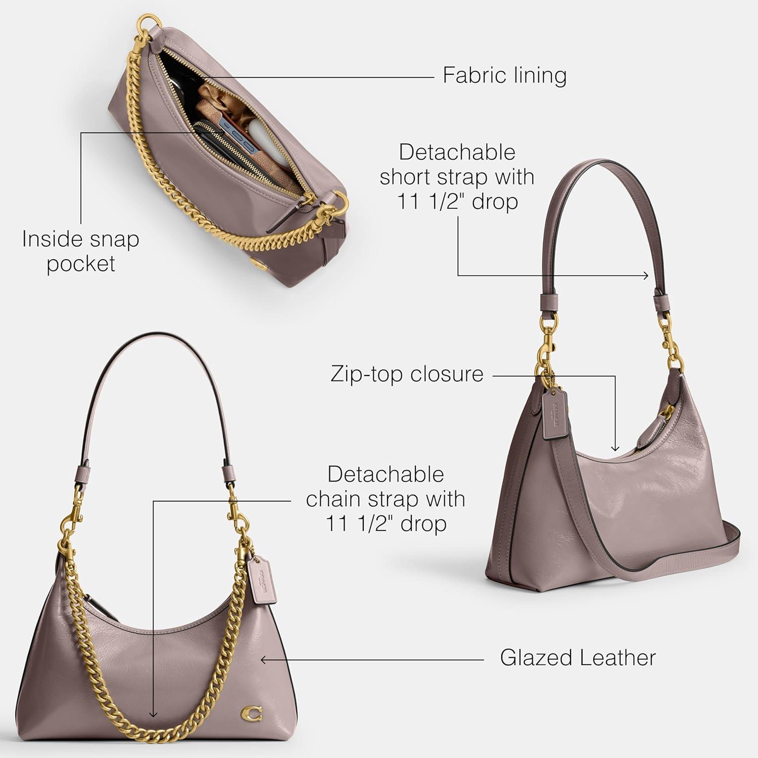 Timeless with a twist, the Juliet shoulder bag from Coach is a sophisticated style with a slouchy, relaxed shape and pockets for an added touch. It's crafted with high-shine glazed leather and features a fabric lining, inside snap pocket, zip-top closure, detachable short strap with 11 1/2″ drop, detachable chain strap with 11 1/2″ drop for crossbody wear, 10 3/4″(L) x 4 1/2″ (H) x 4″ (W)