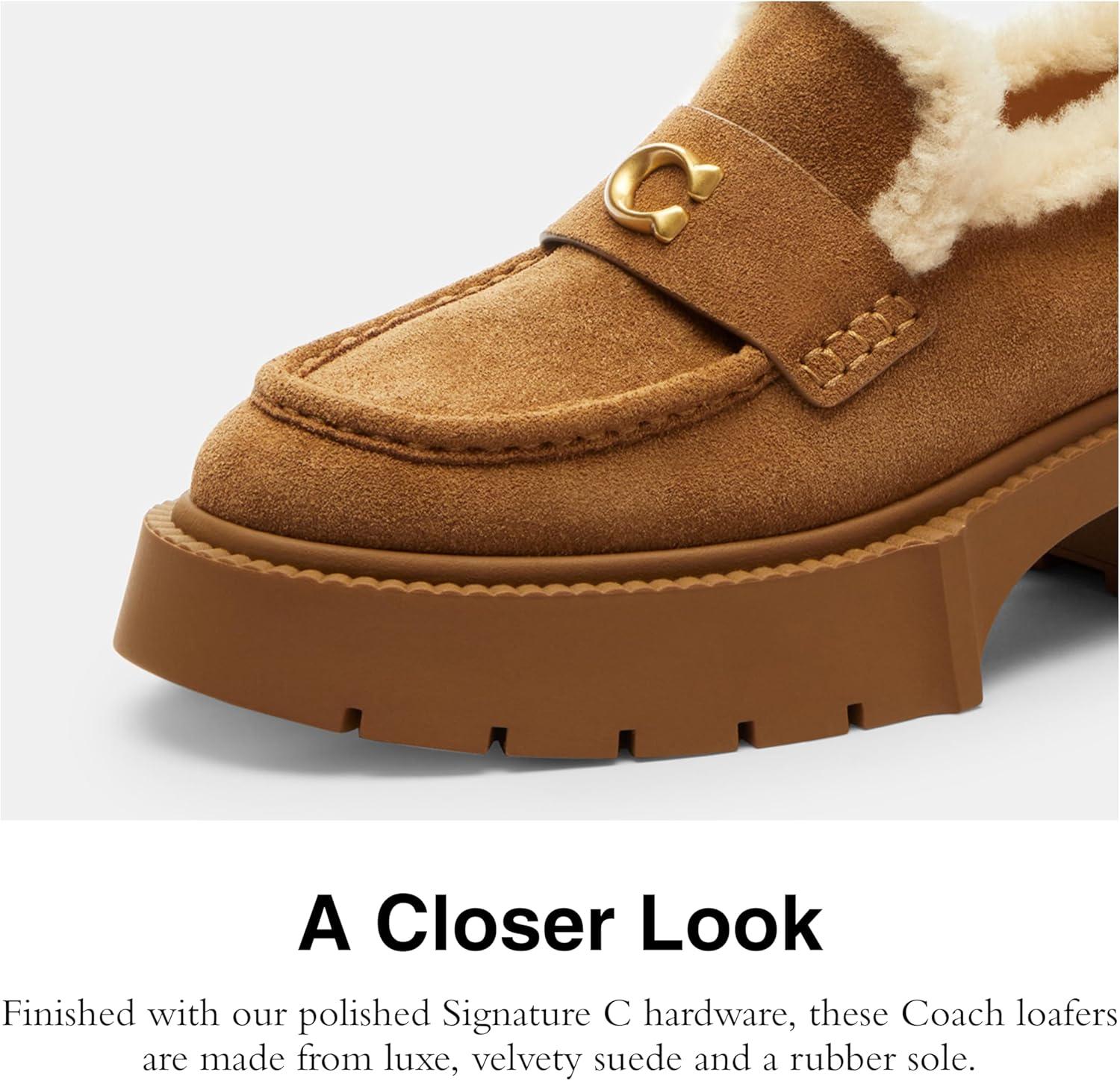 Our velvety suede Leah Platform loafer takes a timeless style to new heights with a chunky ‘90s-inspired lug sole for subtle lift and finished with cozy shearling footbed. Chunky loafers featuring cushiony memory foam padding for all-day comfort. Suede and shearling upper, man-made leather lining, shearling footbed, rubber outsole, slip on, 2 1/4″ heel, 1 1/4″ platform