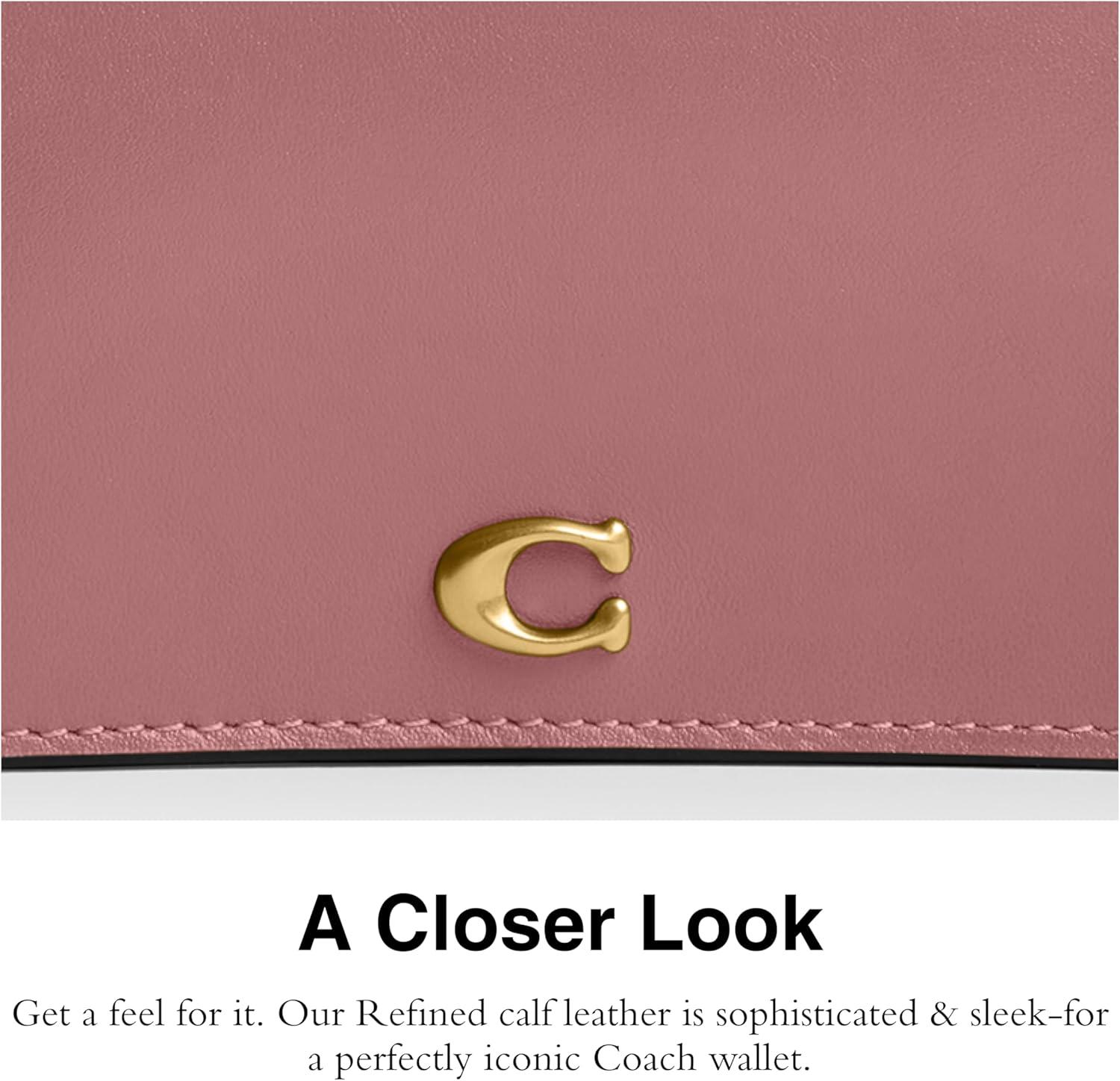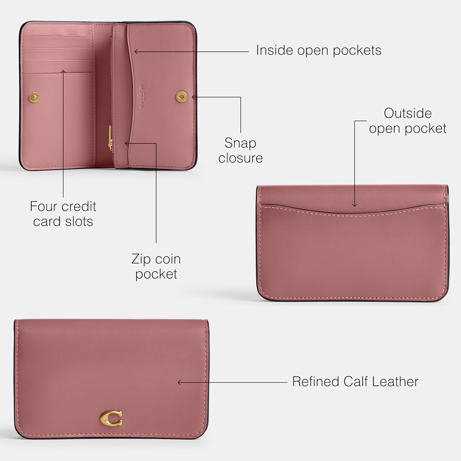 Crafted of refined calf leather with our Signature hardware, this card holder wallet has 4 card slots and a center compartment to hold more cards or cash. Slip it in your pocket or stash inside your bag. Get a feel for it. Our Refined calf leather is sophisticated & sleek – for a perfectly iconic Coach wallet. Four credit card slots, inside open pockets, zip coin pocket, snap closure, outside open pocket, 5″ (L) x 3 1/2″ (H) x 1″ (W)