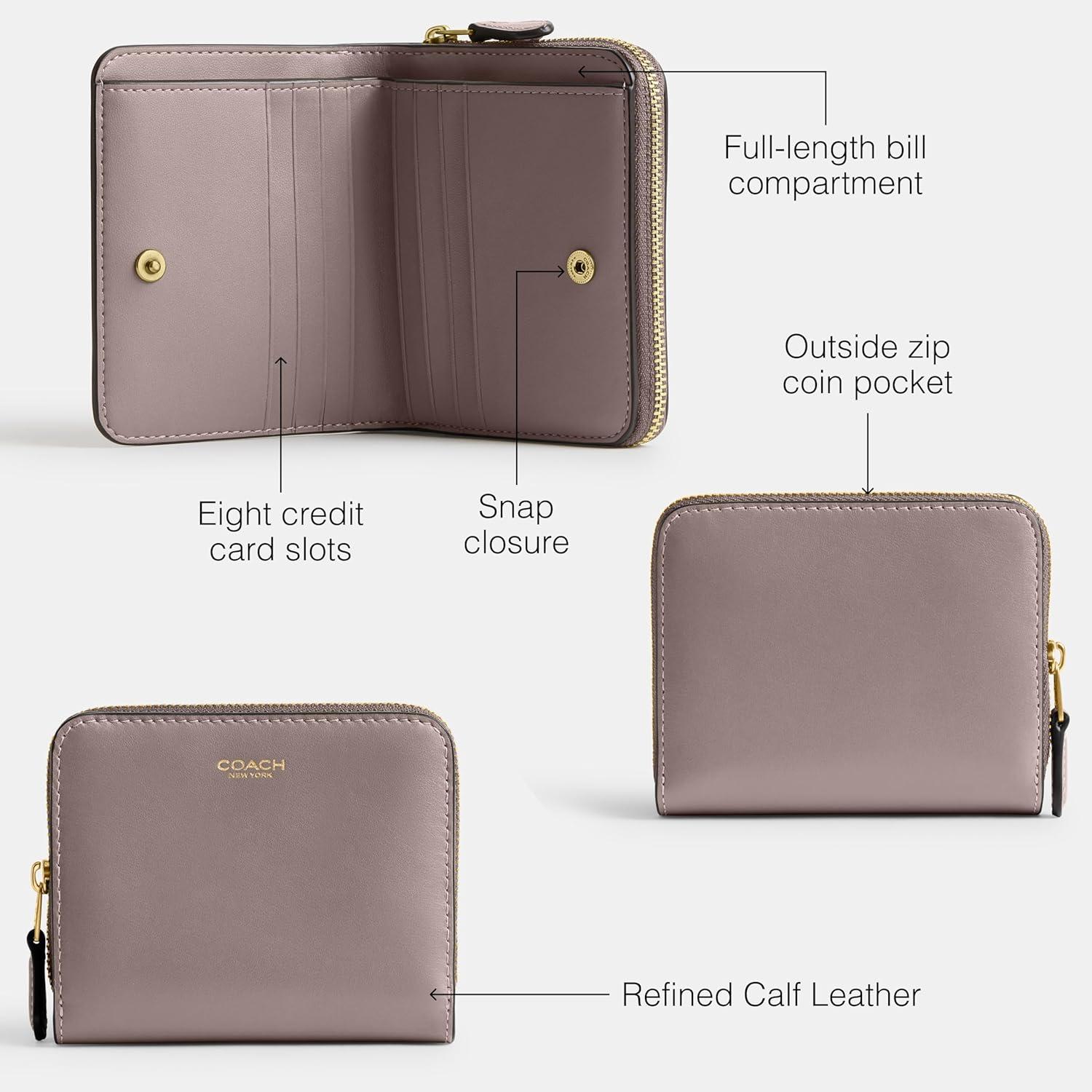 Crafted of refined leather, this classic compact billfold wallet features a convenient exterior zip pocket for coins, receipts, earbuds and other small essentials. Refined calf leather, 8 credit card slots, full-length bill compartment, snap closure and outside zip coin pocket. 4 1/4″ (L) x 3 3/4″ (H) x 1/2″ (W)