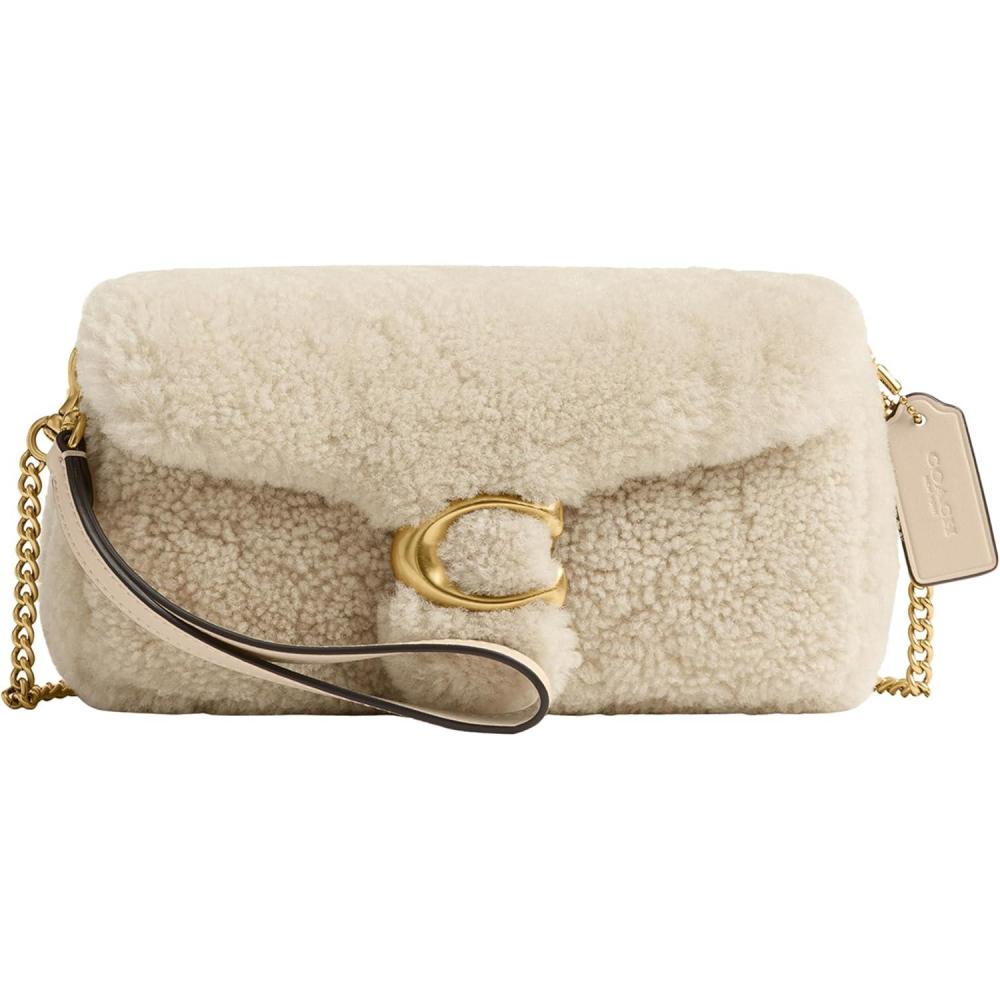 A cozy take on an archival 1970s Coach design, this structured Tabby shoulder bag is crafted of soft shearling & finished with our Signature brass hardware for an iconic touch. Three credit card slots, inside multifunction and outside pockets, snap closure, fabric lining, detachable wrist strap, detachable chain strap with 21 1/2″ drop. 8 3/4″ (L) x 5″ (H) x 3″ (W)