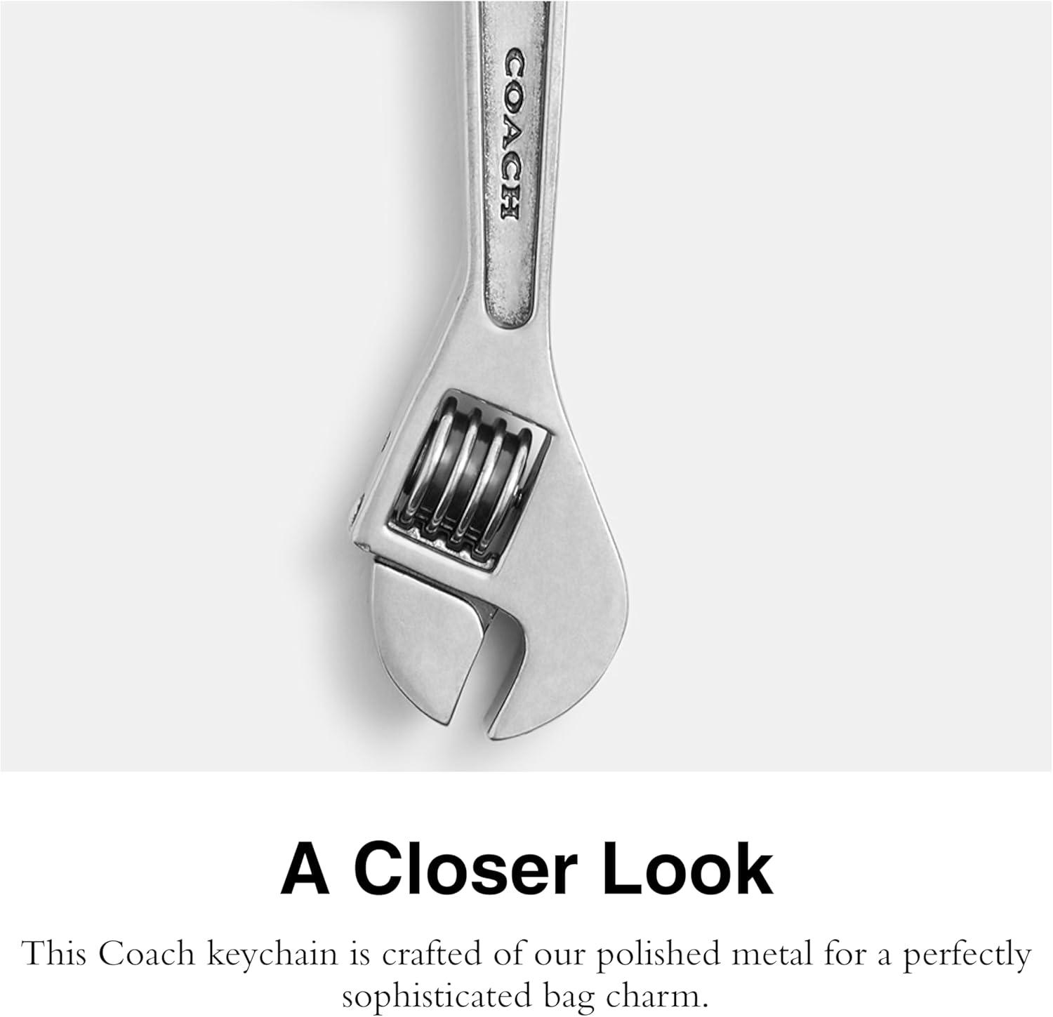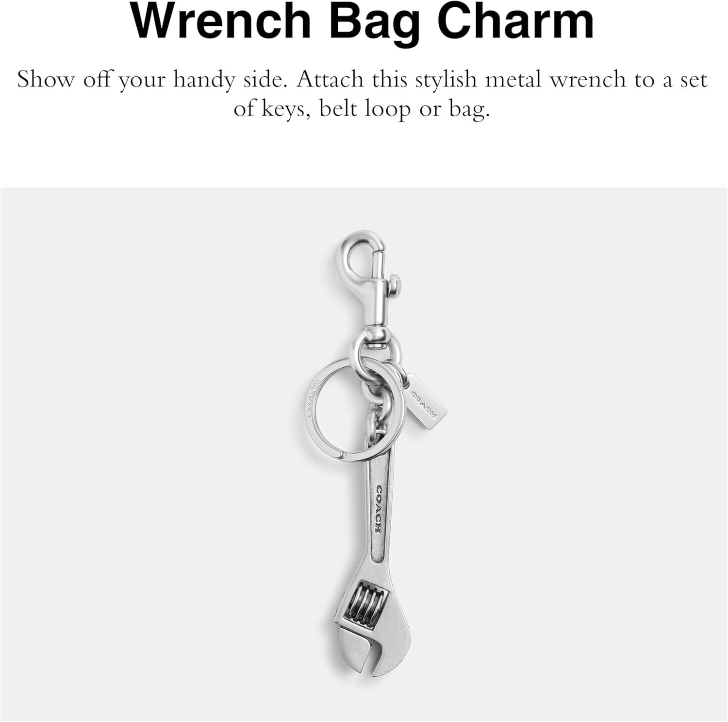 Show off your handy side. Attach this stylish metal wrench to a set of keys, belt loop or bag. Featuring polished metal, attached dogleash clip and split keyring, 1″ (L) x 1/4″ (H) x 5 1/2″ (W)