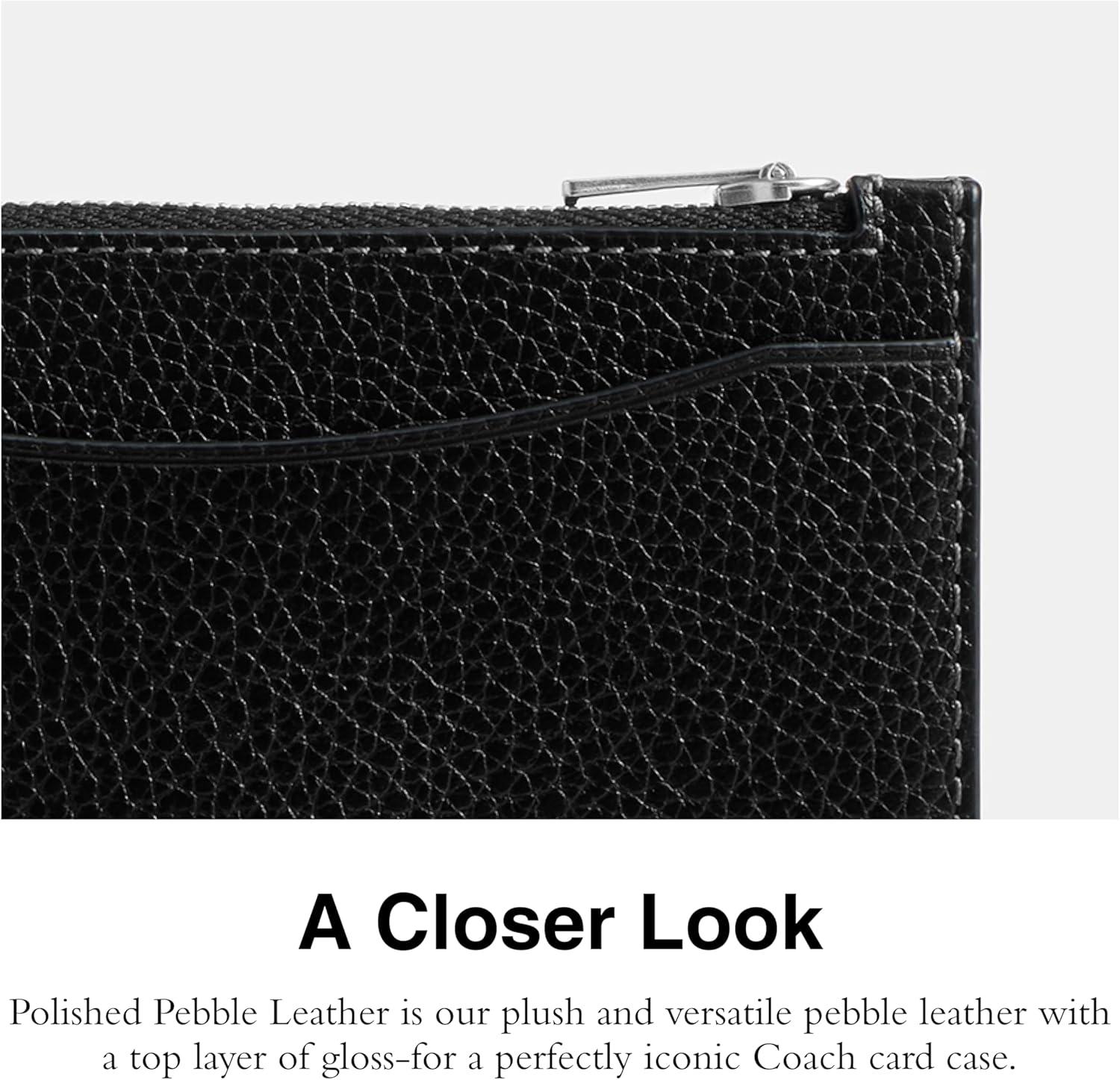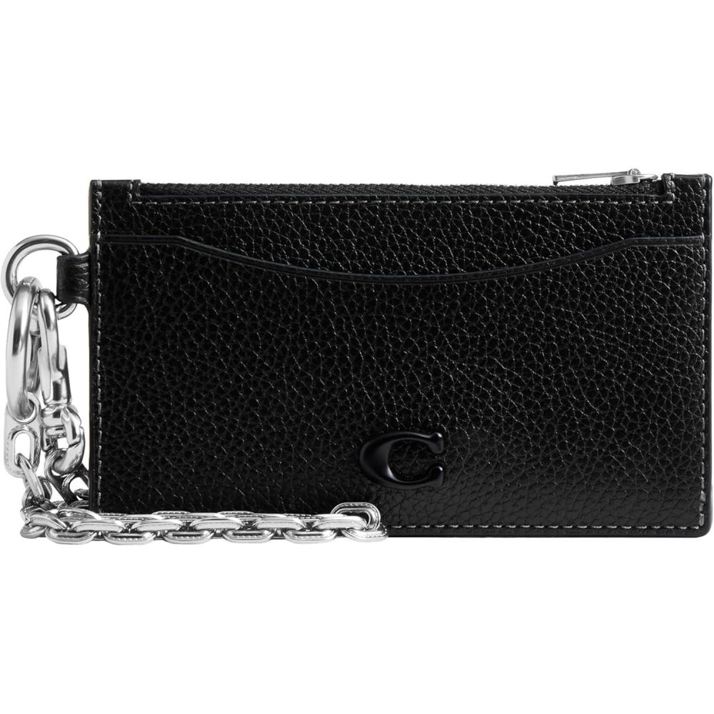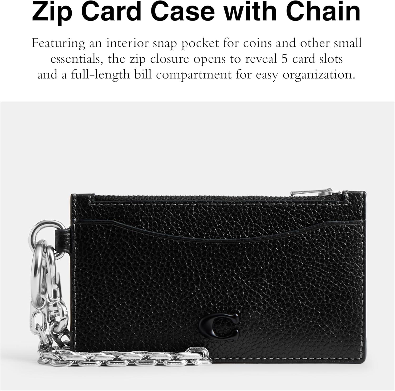 Move through life in style with this slim profile zip card case with detachable chain in Signature canvas. Crafted with polished pebble leather, this card case for men features a zip pocket for coins, bills or receipts, five credit card slots and one more for other essentials, attached hinged D-ring, and detachable chain strap with 11 3/4″ length. 5″ (L) x 3 1/4″ (H)